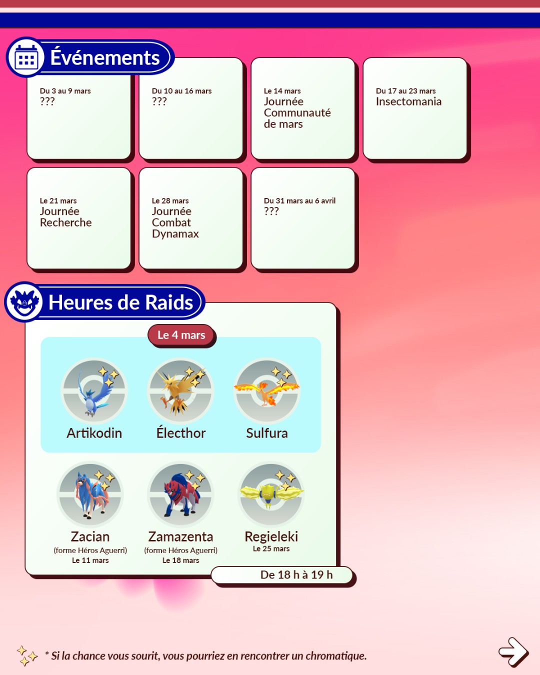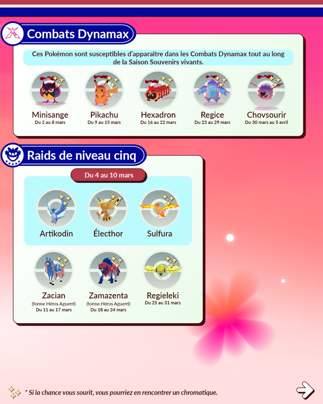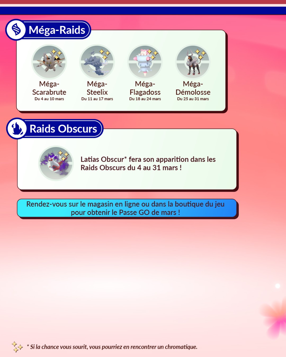 En ce mois de mars 2026 dans Pokémon GO, la Saison Souvenirs vivants a débuté et dure jusqu’au 2 juin 2026 à 10:00 (heure locale). En plus de différents événements, elle apporte plusieurs modifications. Par exemple, les événements se tiennent à des dates plus régulières, ceux du week-end commencent désormais le samedi, les tickets payants laisseront peu à peu place aux Passes GO d’événements et plus tard, le jeu intégrera désormais un calendrier permettant de consulter directement les informations concernant les événements. De plus, une « expérience Découverte quotidienne » est disponible certains jours de la semaine entre minuit et 23h59. Par ailleurs, au cours de cette Saison, tous les Pokémon chromatiques disponibles dans le jeu peuvent désormais être rencontrés à l’état sauvage. En effet, des évolutions comme Herbizarre, pourtant disponibles sous leur forme chromatique, ne pouvaient pas être rencontrés à l’état sauvage sous cette forme jusque-là . Cela inclut aussi les Pokémon de la Team Go Rocket que l’on sauve. Les leaders de la Team GO Rocket et Giovanni auront également plus de chances de détenir des Pokémon chromatiques que les simples Sbires. Autre changement : les probabilités de faire éclore des Pokémon chromatiques et d’en rencontrer à l’issue des Combats de Raid seront plus élevées que lors des rencontres sauvages. Tout le monde peut aussi accéder au scénario d’Étude spéciale Pression en hausse qui permet de rencontrer le Pokémon fabuleux Volcanion (à moins de l’avoir déjà obtenu au cours du Festival Pokémon GO 2025. Toutes les informations sur la Saison Souvenirs vivants se trouvent à cette adresse. Il y a aussi les nouveautés de la Ligue Pokémon GO et le Passe GO de mars.
