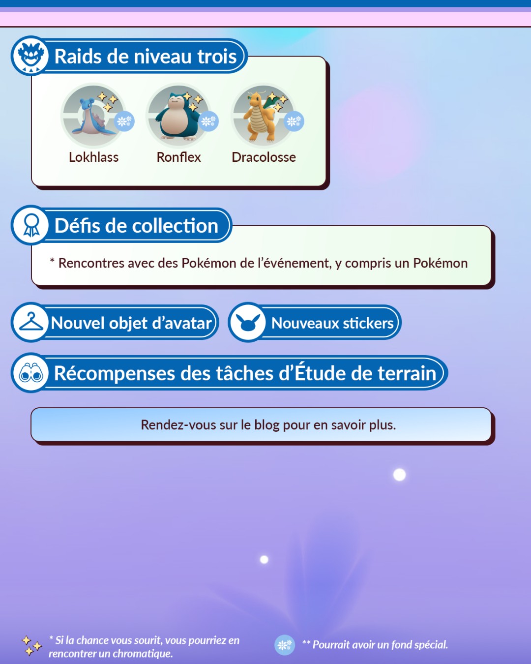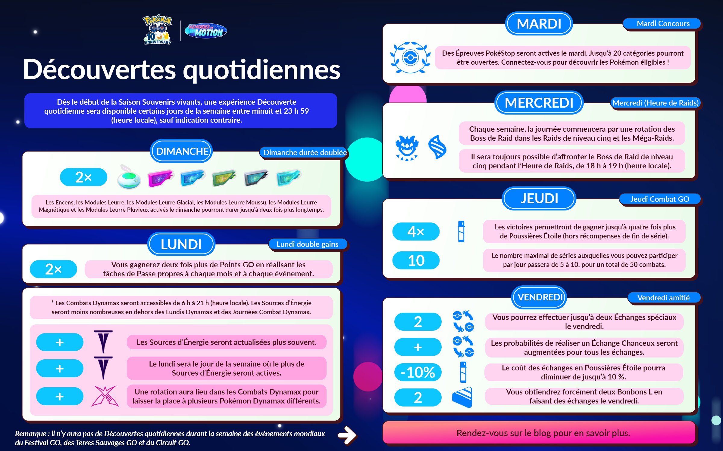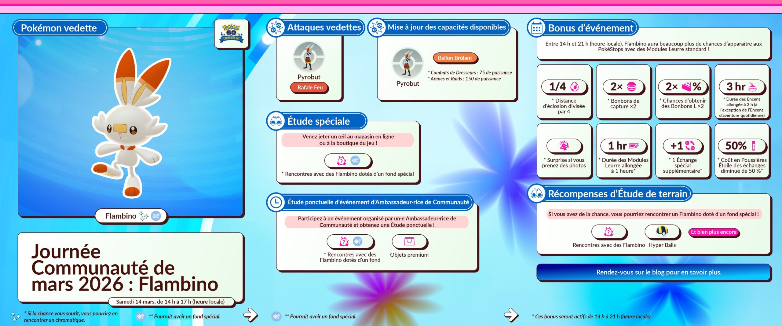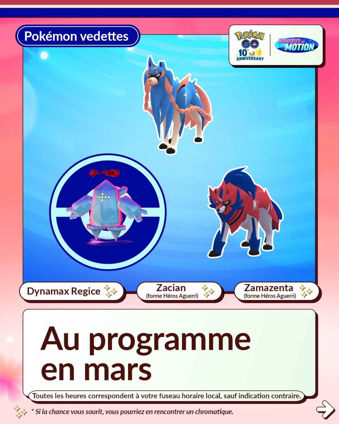 En ce mois de mars 2026 dans Pokémon GO, la Saison Souvenirs vivants a débuté et dure jusqu’au 2 juin 2026 à 10:00 (heure locale). En plus de différents événements, elle apporte plusieurs modifications. Par exemple, les événements se tiennent à des dates plus régulières, ceux du week-end commencent désormais le samedi, les tickets payants laisseront peu à peu place aux Passes GO d’événements et plus tard, le jeu intégrera désormais un calendrier permettant de consulter directement les informations concernant les événements. De plus, une « expérience Découverte quotidienne » est disponible certains jours de la semaine entre minuit et 23h59. Par ailleurs, au cours de cette Saison, tous les Pokémon chromatiques disponibles dans le jeu peuvent désormais être rencontrés à l’état sauvage. En effet, des évolutions comme Herbizarre, pourtant disponibles sous leur forme chromatique, ne pouvaient pas être rencontrés à l’état sauvage sous cette forme jusque-là . Cela inclut aussi les Pokémon de la Team Go Rocket que l’on sauve. Les leaders de la Team GO Rocket et Giovanni auront également plus de chances de détenir des Pokémon chromatiques que les simples Sbires. Autre changement : les probabilités de faire éclore des Pokémon chromatiques et d’en rencontrer à l’issue des Combats de Raid seront plus élevées que lors des rencontres sauvages. Tout le monde peut aussi accéder au scénario d’Étude spéciale Pression en hausse qui permet de rencontrer le Pokémon fabuleux Volcanion (à moins de l’avoir déjà obtenu au cours du Festival Pokémon GO 2025. Toutes les informations sur la Saison Souvenirs vivants se trouvent à cette adresse. Il y a aussi les nouveautés de la Ligue Pokémon GO et le Passe GO de mars.