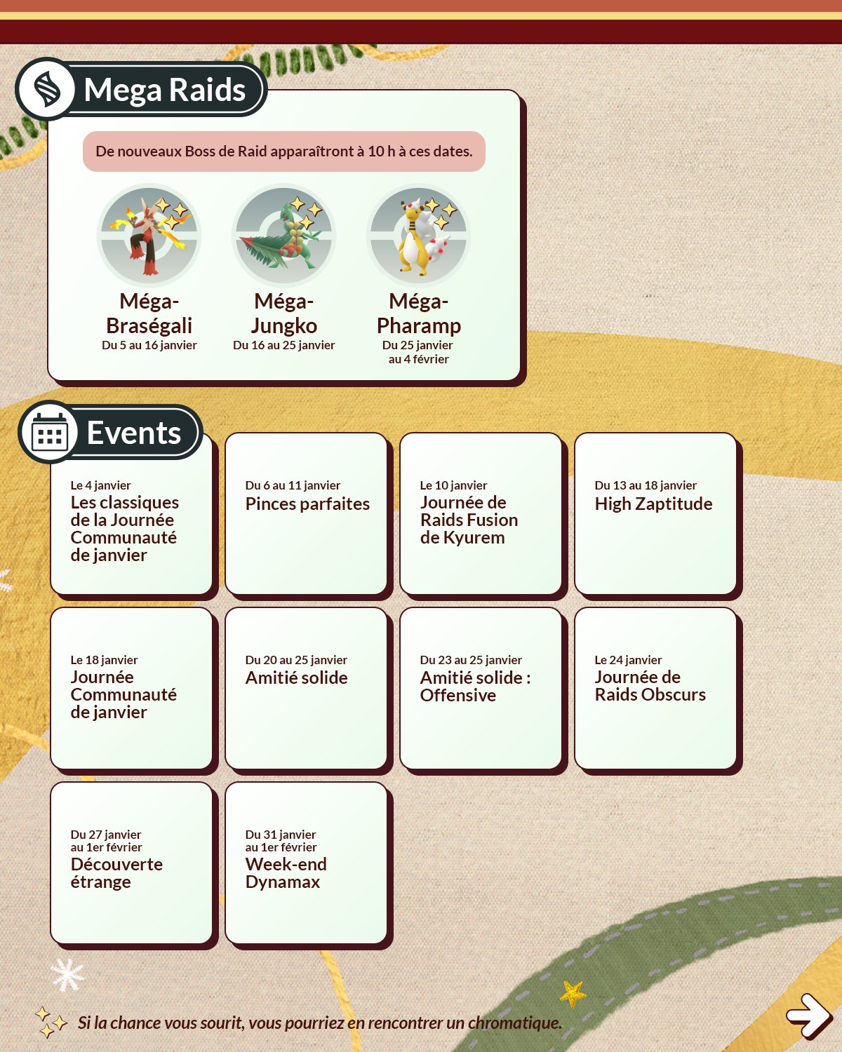 En ce mois de janvier 2026, la Saison Parcours précieux de Pokémon GO continue avec de nouveaux événements. Avec la prochaine Journée Communauté, la forme chromatique de Ouistempo fera enfin son arrivée dans le jeu. Un autre Pokémon de Paldea va aussi débarquer dans Pokémon GO ce mois-ci : Craparoi. La forme chromatique de Sinistrail pourra également être trouvée pour la première fois. Il y aura aussi la Journée de Raids Kyurem Fusion. En ce moment, les événements du Nouvel An 2026 et des classiques de la Journée Communauté avec Tiplouf sont aussi en cours. Par ailleurs, depuis le 11 décembre dernier, les fonctionnalités Amis pour toujours et Échange à distance ont été ajoutées dans le jeu. Tous les détails se trouvent à cette adresse. Niantic a aussi communiqué les dates pour les événements en personne du Festival Pokémon GO, qui se dérouleront donc respectivement à Tokyo, dans la baie du 29 mai au 1er juin, à Chicago, au parc Grant du 5 au 7 juin et à Copenhague, à Fælledparken du 12 au 14 juin. Un événement mondial auquel tout le monde pourra participer en ligne aura également lieu cette année, Niantic prévoyant de partager des nouvelles en mars et tout au long du printemps. Les détails sur le Passe GO de janvier sont également disponibles ici.