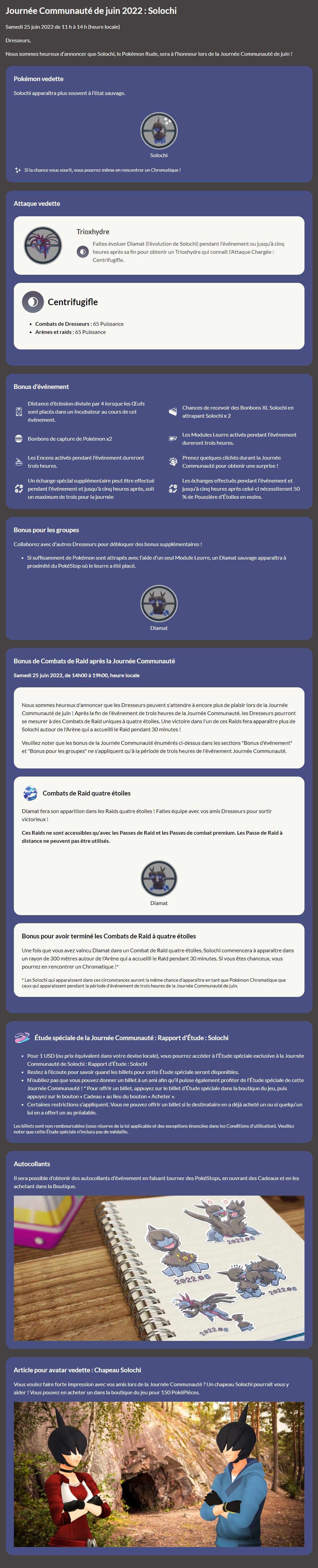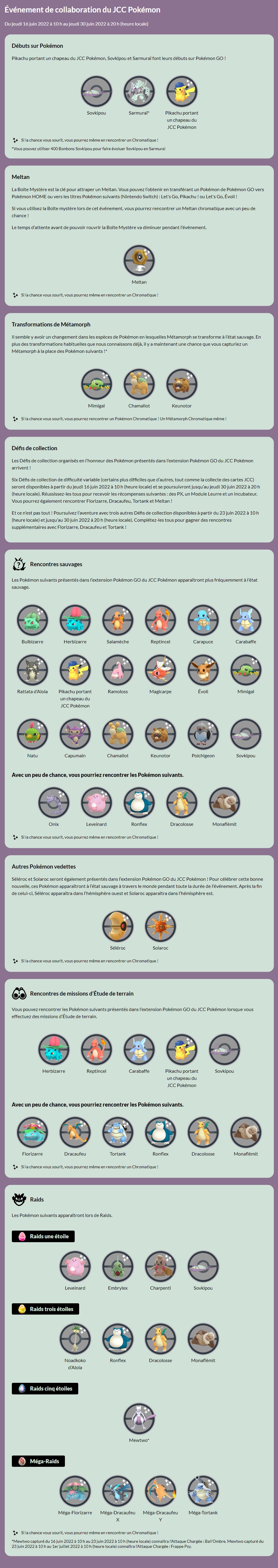 Mise à jour : nous avons ajouté avant les détails sur le Pokémon GO Fest 2022 les informations sur l’événement de la collaboration avec le JCC Pokémon ainsi que celles de la prochaine Journée Communauté.