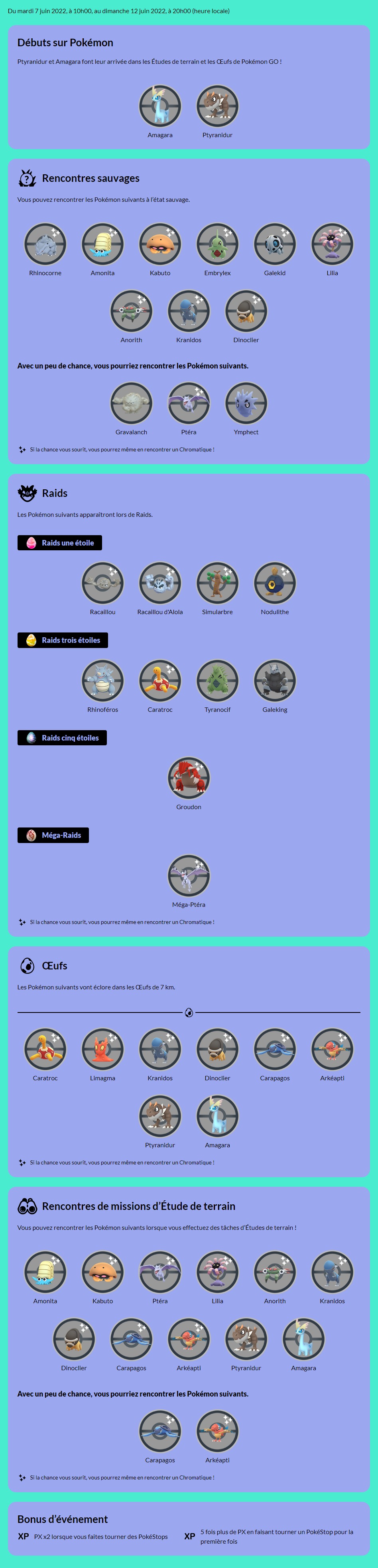 Niantic et The Pokémon Company ont récemment dévoilé le programme des événements à venir pour le mois de juin 2022, en plus du Pokémon GO Fest 2022 qui avait déjà été détaillé précédemment (il y a eu cependant quelques informations supplémentaires, rajoutées ci-dessous avec le récapitulatif des détails communiqués précédemment). Nous rajouterons progressivement les informations sur les événements qui n’ont pas encore été détaillés ainsi que celles de la prochaine Journée Communauté qui aura lieu le 25 juin (les dates suivantes sont également connues : 17 juillet et 13 août). De plus, la Saison GO a été également détaillée. Elle commencera dès aujourd’hui à partir de 10h et se terminera le 1er septembre à 10h. En plus des informations que vous retrouverez sur la page officielle à cette adresse, Niantic et The Pokémon Company ont diffusé un teaser qui se concentre sur les Ultra-Chimères et l’Ultra-Dimension, et plus particulièrement sur Zéroïd / UC-01 Parasite. Par ailleurs, les informations sur la saison 11 de la Ligue de Combat GO ont été mises à jour, de nouvelles fonctionnalités sociales et des mises à jour pour les raids en personne ont été révélées, et il est maintenant possible d’offrir des billets d’événements aux amis.