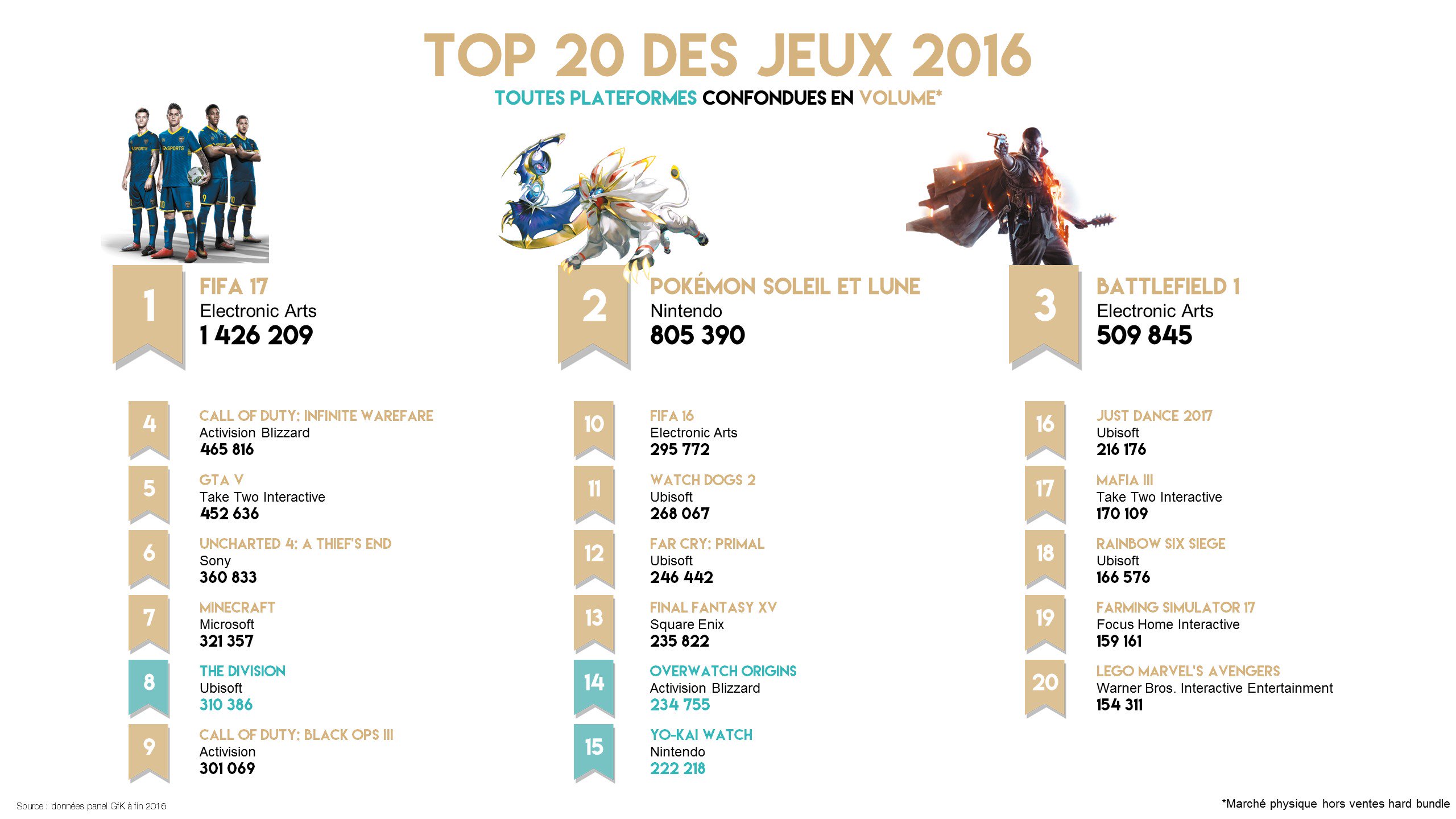 Le Syndicat des Éditeurs de Logiciels de Loisirs vient de dévoiler quelques données intéressantes sur les ventes de jeux vidéo en France pour 2016, et sans surprise, nous remarquons que 805 390 exemplaires de Pokémon Soleil et Pokémon Lune ont été vendus l’année dernière, soit pratiquement le double de ce que nous avions appris en décembre dernier. Au total, les jeux ont récolté 14,69 millions de ventes selon le dernier bilan financier de Nintendo. Nous apprenons aussi que 222 218 exemplaires de Yo-kai Watch ont été vendus l’année dernière en France, ce qui prouve que la série a bien réussi à trouver son public en France, comme l’avait fait remarquer Nintendo (pour l’Europe en général) lors de sa conférence avec les actionnaires. On remarque également que Minecraft (les ventes de la version Wii U, vendue en version physique, ont sûrement été comptabilisées) et Just Dance 2017 font aussi partie du top 20.