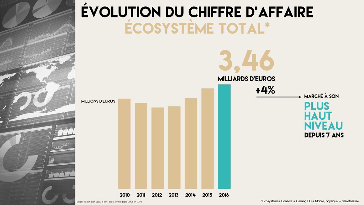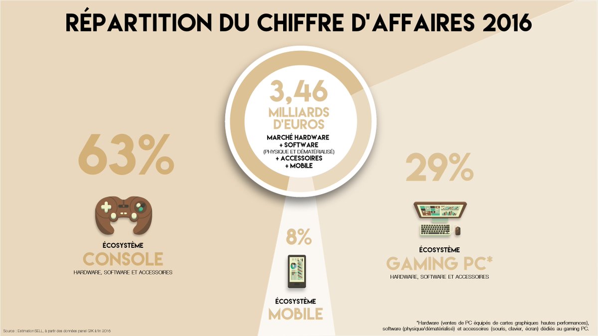 Le chiffre d’affaires du marché du jeu vidéo en France atteint d’après le syndicat 3,46 milliards d’euros, ce qui représente une hausse de 4 %, c’est le plus haut niveau du marché depuis 7 ans. Ce chiffre d’affaires est réparti entre les trois écosystèmes de l’ordre de 63 % pour les consoles, 29 % pour le gaming PC et 8 % pour le mobile. Sur les différents segments de marché, le hardware PC et consoles observe une légère baisse de 1 %, le software une hausse de 6 % et les accessoires +7 % par rapport à 2015. Le mobile, lui, se voit augmenter de 8 % vis-à-vis de l’année précédente. Le S.E.L.L. s’est ensuite penché sur le software et a noté une répartition correspondant à 40 % pour le physique (PC + consoles), 46 % pour le dématérialisé et 14 % pour le jeu mobile.