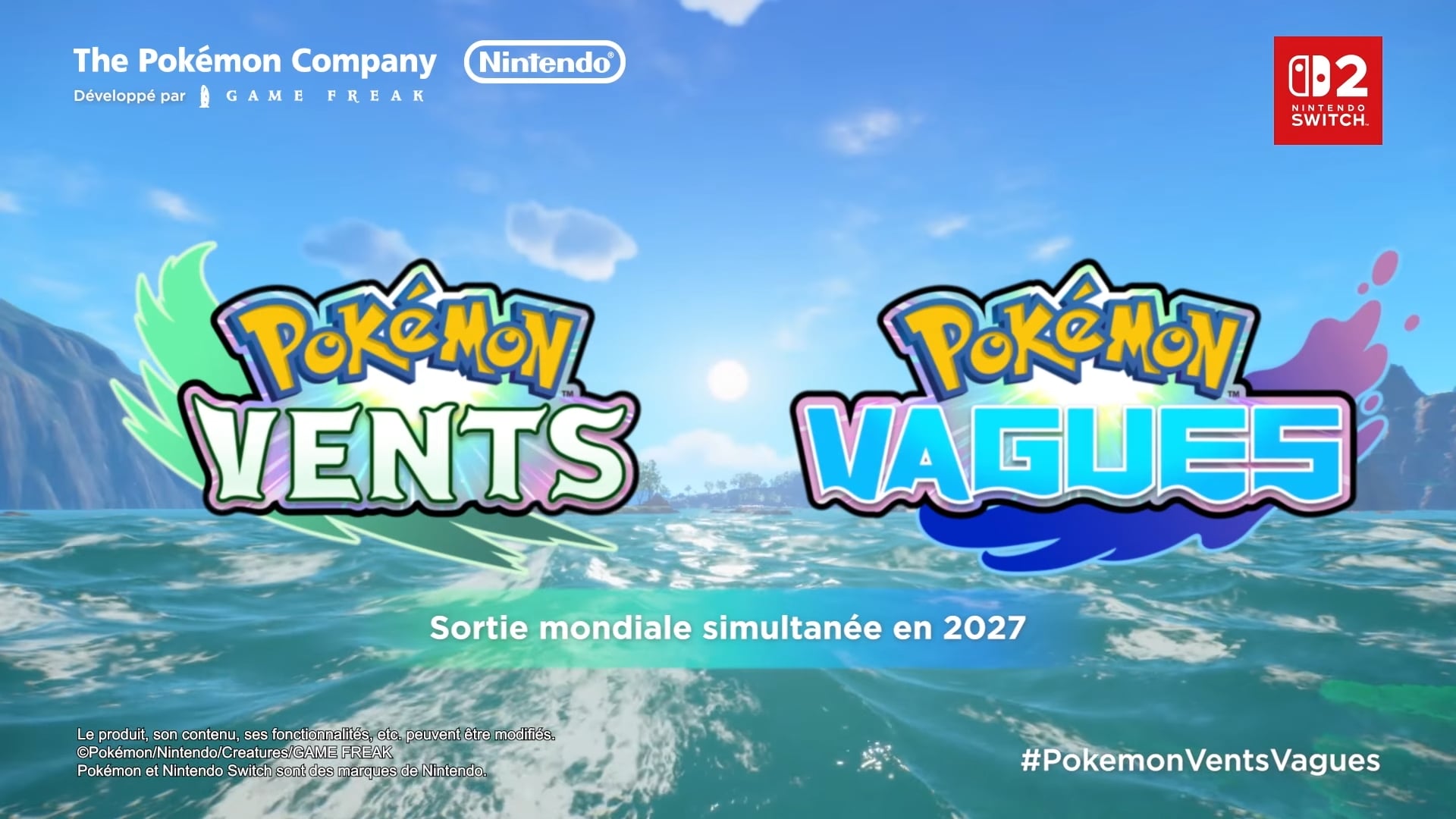 C’était la grande annonce concluant le Pokémon Presents de ce 27 février 2026 : Pokémon Vents et Pokémon Vagues, les jeux qui introduiront la dixième génération de la série, ont été révélés. Ces nouveaux jeux de la série principale développés par Game Freak seront disponibles en exclusivité sur Nintendo Switch 2 dès 2027. La première bande-annonce met en avant deux Pikachu spéciaux qui feront leur apparition dans l’histoire, la nouvelle région qui n’a pas encore été nommée mais qui est décrite comme un monde ouvert, les protagonistes qui auront un sac, un chapeau et un Pokédex différents en fonction du jeu, les Pokémon de départ Broussatif, Caloulou et Ogéko. À l’instar de la région Alola des jeux Pokémon Soleil, Lune, Ultra-Soleil et Ultra-Lune, il sera possible d’explorer plusieurs îles. La bande-annonce permet d’apercevoir les améliorations graphiques et plus largement techniques par rapport aux jeux précédents, notamment avec les détails au niveau du vent et de l’eau, et montre par ailleurs le retour de l’exploration sous-marine, introduite dans les jeux Pokémon Versions Rubis et Saphir avec le fond marin. La musique que l’on entend dans la vidéo est le thème principal du jeu, et a été interprétée par l’Orchestre symphonique de la NHK. On la retrouvera également dans Pokémon Vents et Vagues. Cet orchestre renommé avait déjà collaboré avec The Pokémon Company pour le mini concert Pokémon et le Pokémon × NHK Symphony Special Orchestra. Une tourne de concerts symphoniques Pokémon x NHK Symphony Special Orchestra aura également lieu dans tout le Japon en août 2026, et The Pokémon Company diffusera prochainement une vidéo montrant les coulisses de l’enregistrement du thème principal. La bande-annonce se termine avec un teasing ayant un rapport avec le tonnerre.