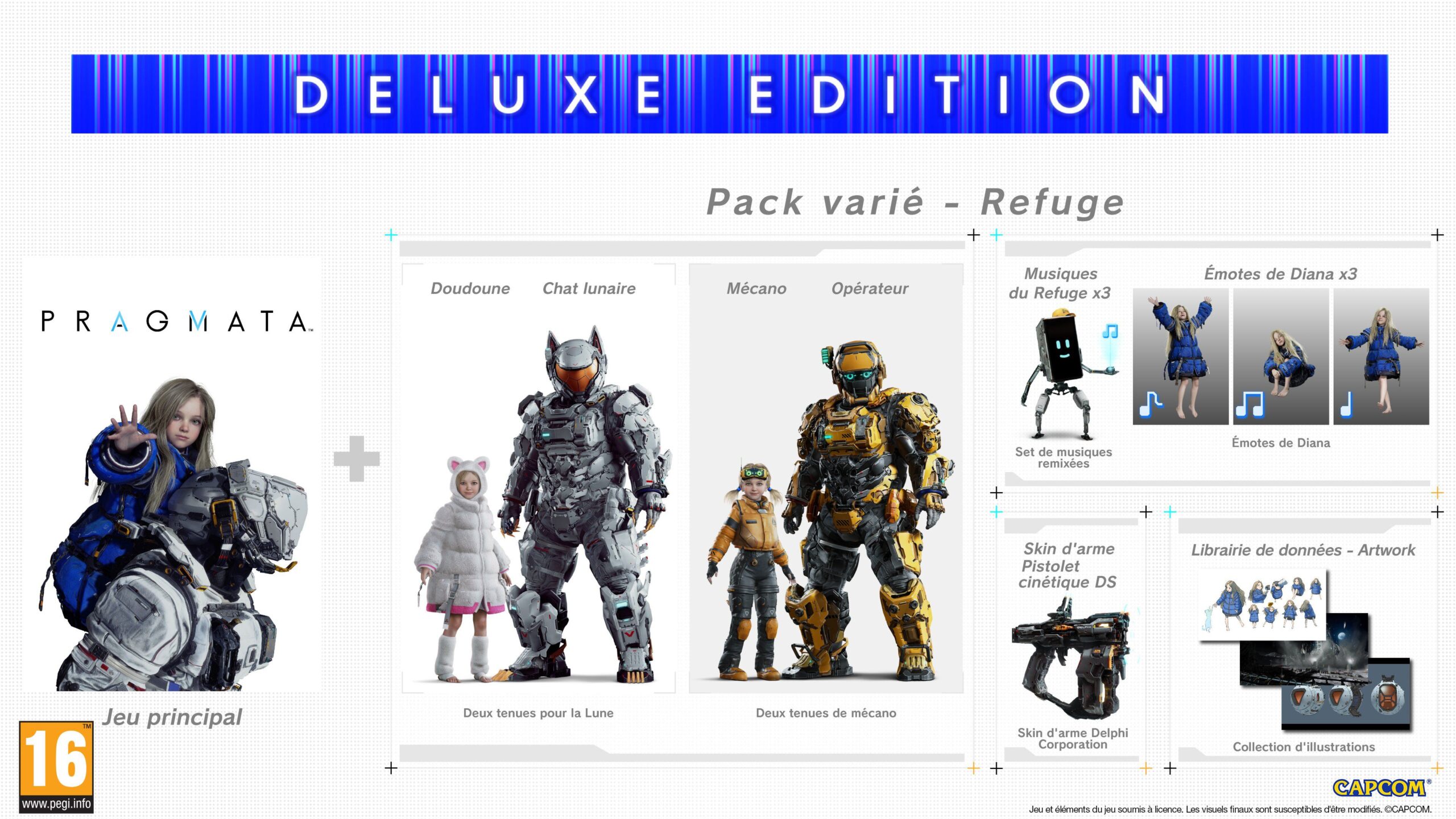 Les précommandes sont désormais disponibles pour les versions téléchargeables de Pragmata. La version standard coûte 59,99 €, et une édition deluxe est proposée pour 69,99 €. En guise de bonus de précommande, des tenues spéciales seront offertes pour les protagonistes de l’aventure : Neo Bushido pour Hugh et Neo Kunoichi pour Diana. Capcom indique que ces bonus pourront être proposés séparément à l’avenir. L’édition deluxe comprend le jeu principal et le Pack varié – Refuge (disponible pour 14,99 €). Voici son contenu :