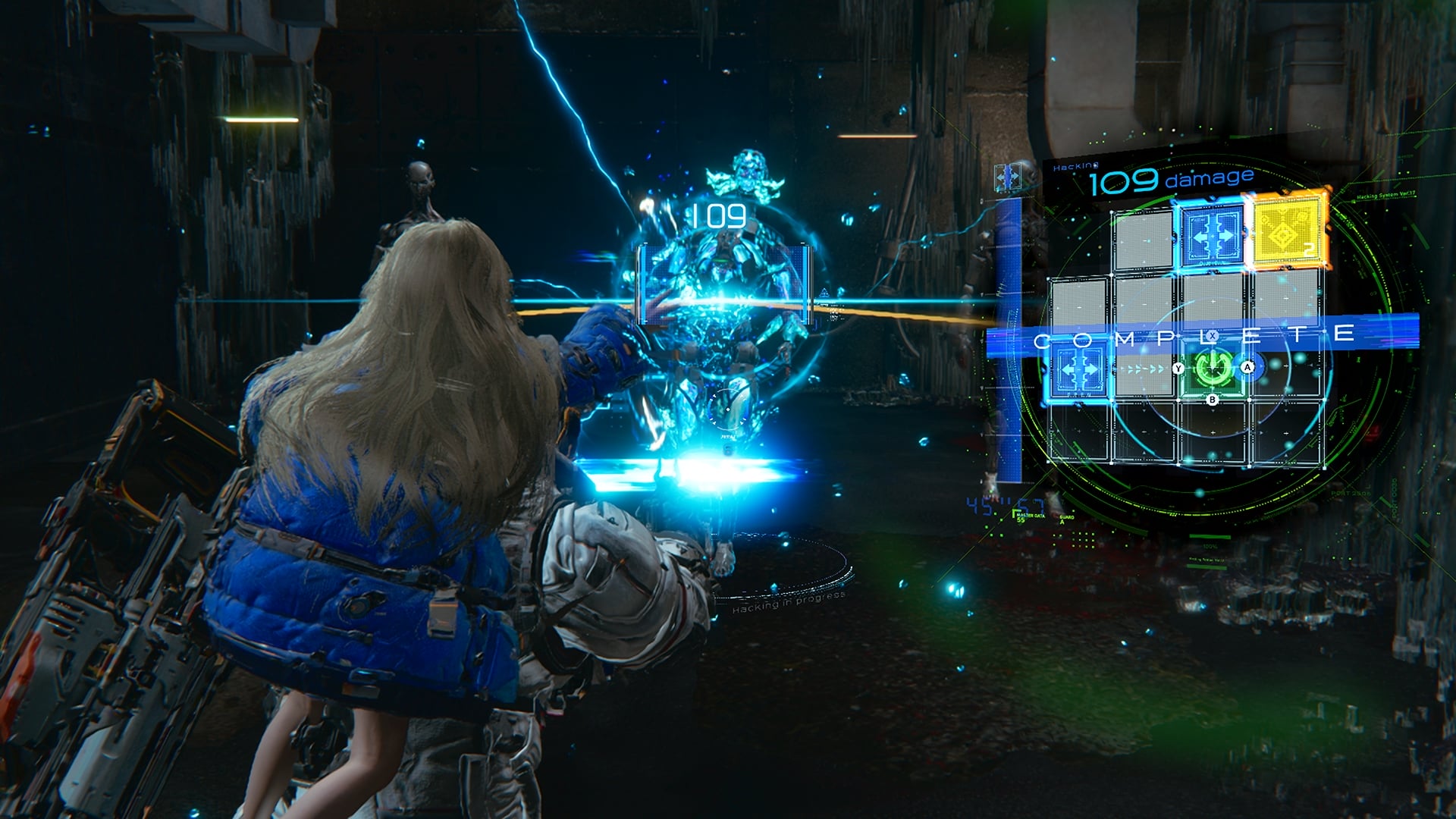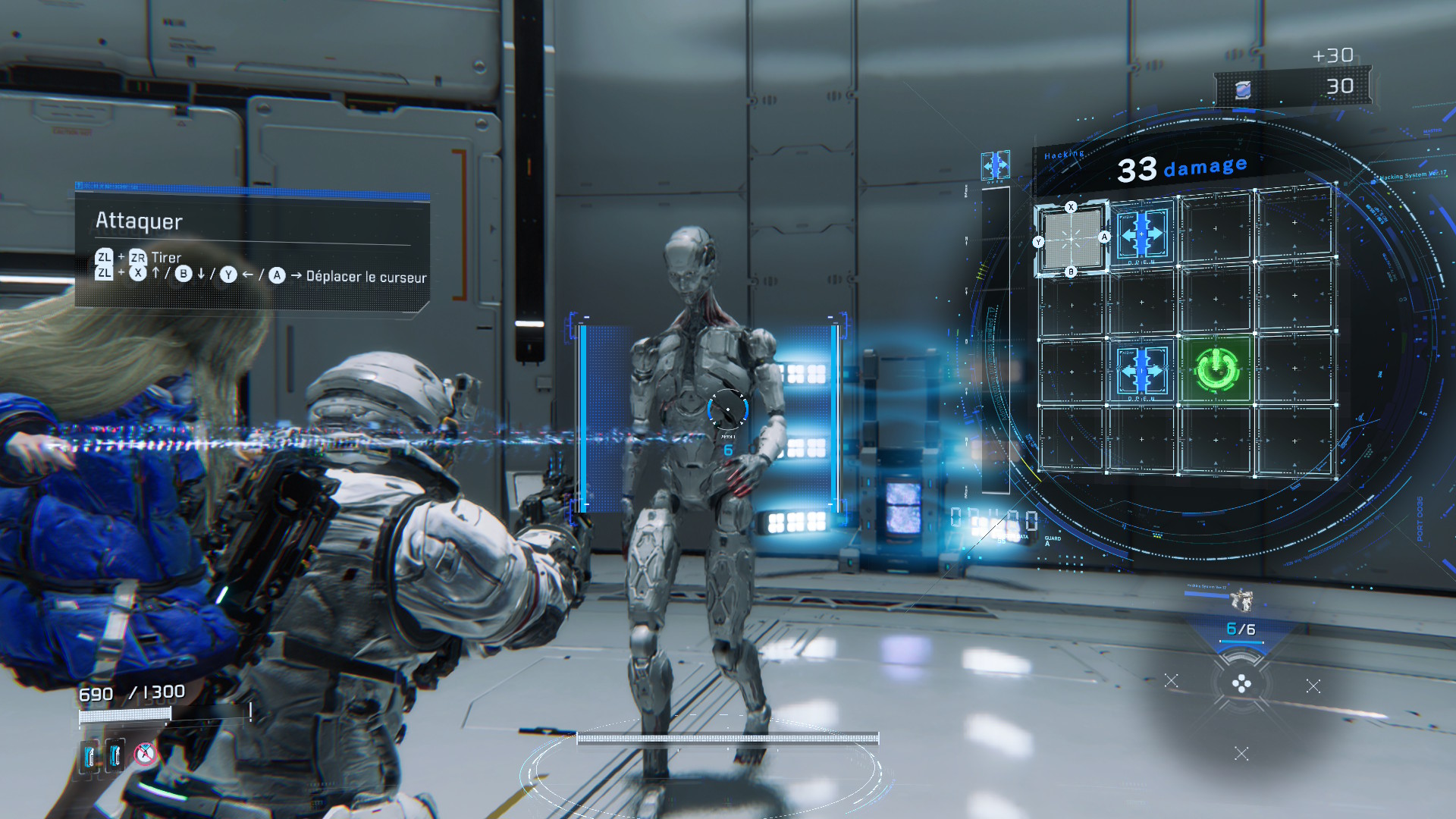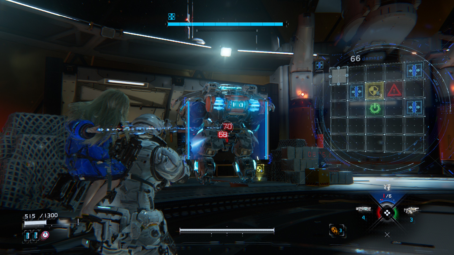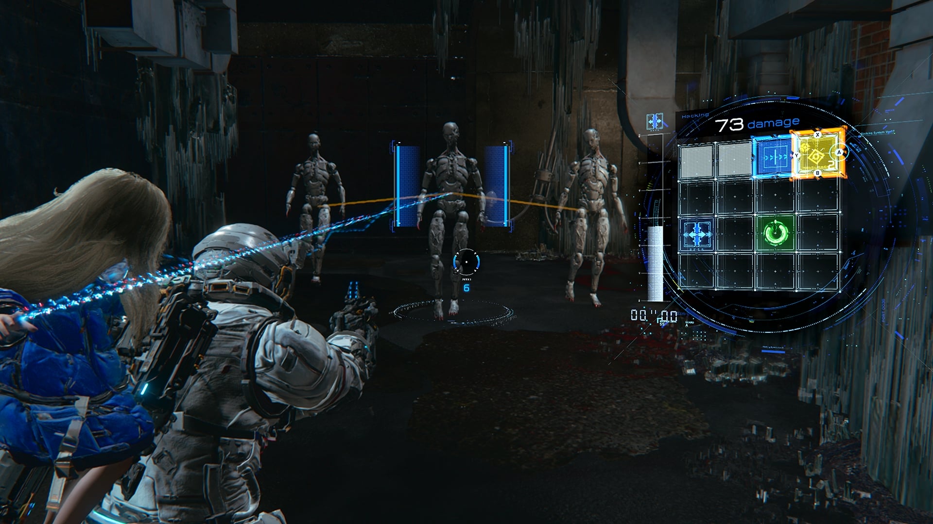 Dans PRAGMATA, le hacking et le tir sont au cœur du gameplay. Pendant le combat, un panneau apparaît à l’écran lorsque l’on vise les ennemis. Il représente la capacité de Diana à pirater les défenses de ses adversaires. En déplaçant le curseur sur ce panneau, elle peut détruire l’armure de l’ennemi et créer des ouvertures permettant à Hugh de faire exploser les points faibles de l’ennemi avec son arsenal d’armes. Ce système mettra les joueurs au défi de surmonter des situations à multiples facettes dans le feu de l’action.