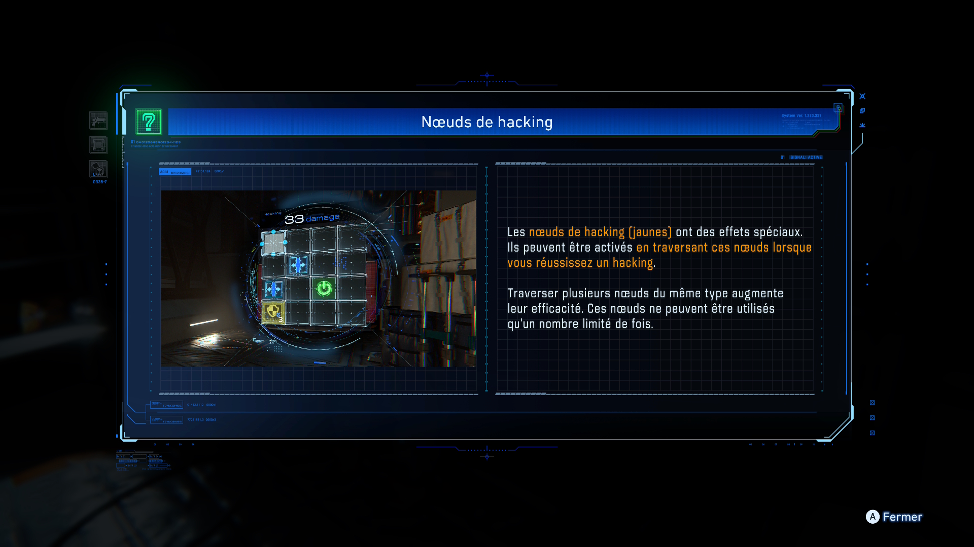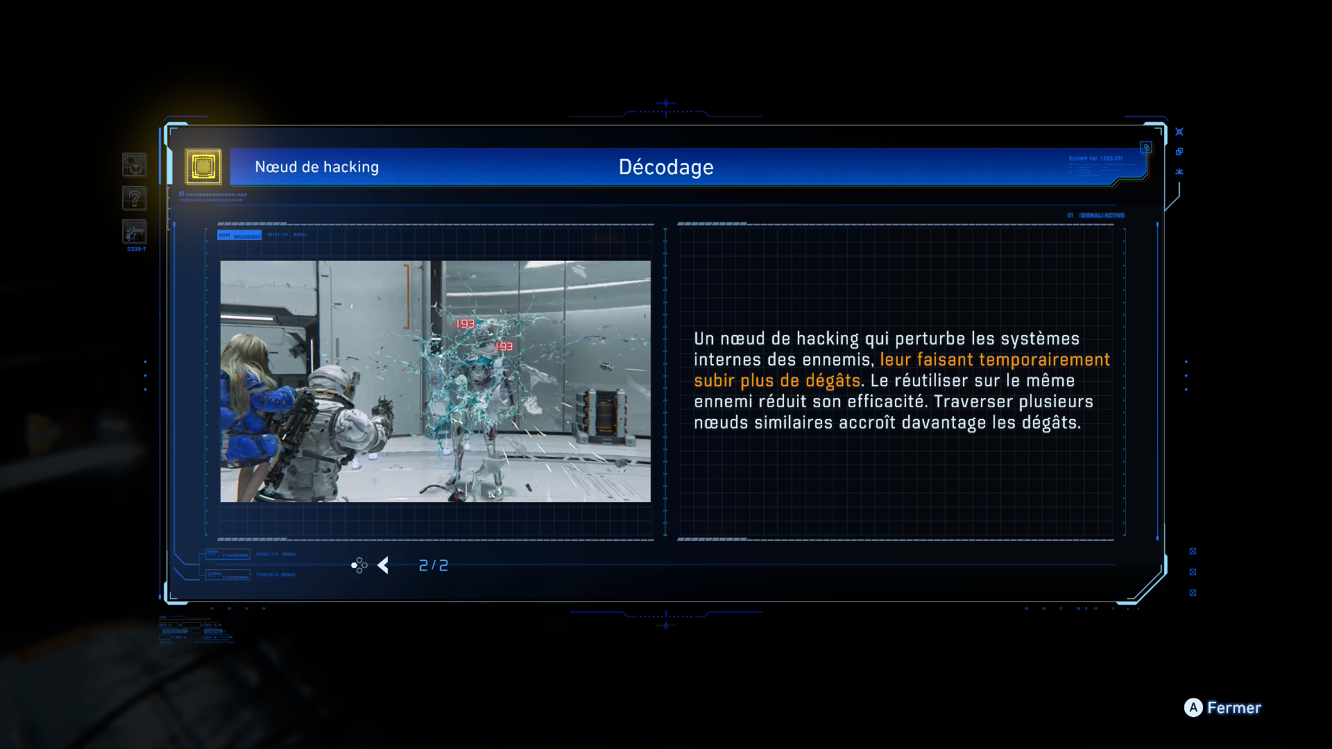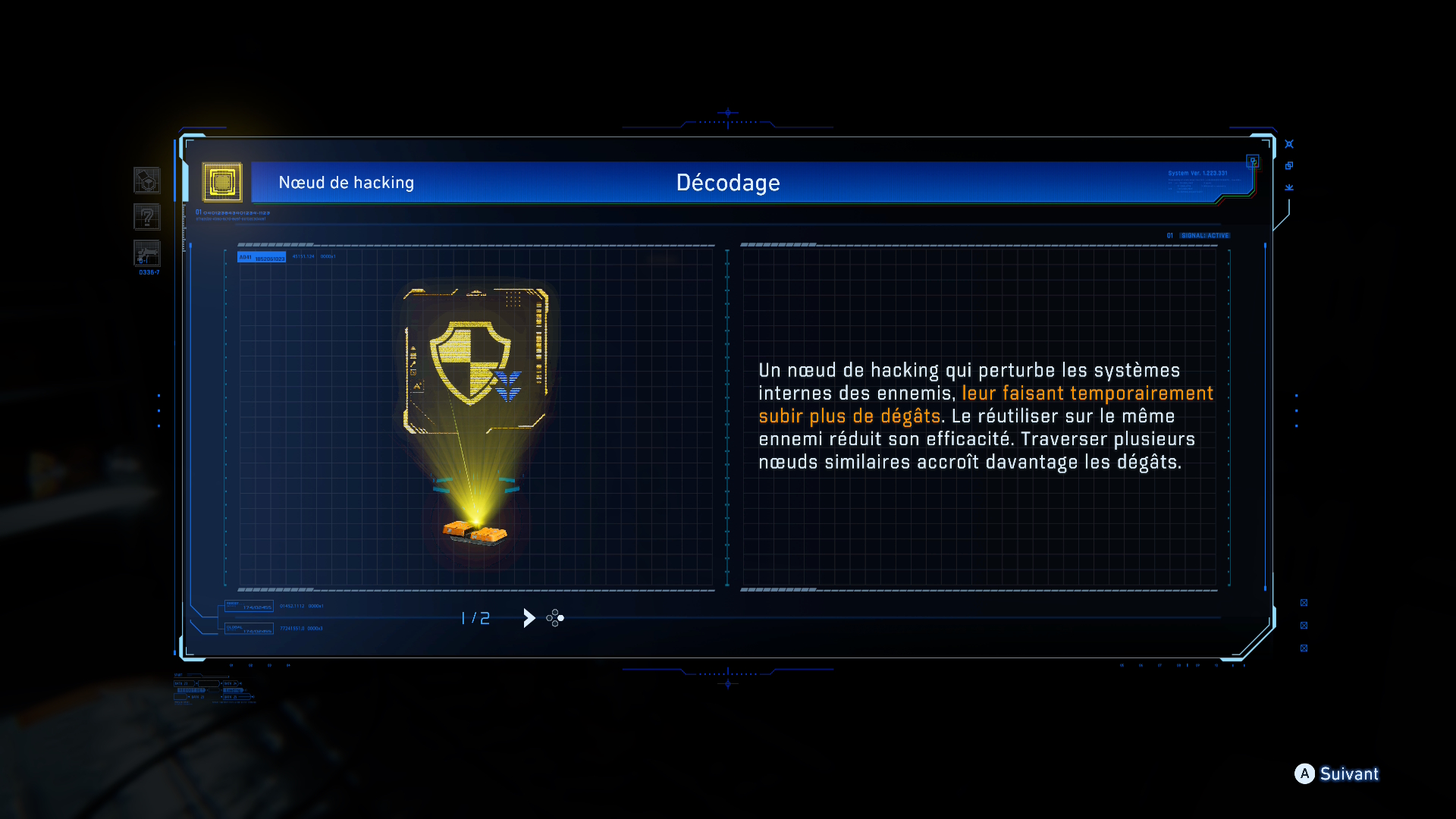 Pour améliorer les capacités de piratage de Diana, les joueurs peuvent également collecter des nœuds de piratage dans l’environnement afin de les utiliser au combat. Activés en passant à travers eux dans la matrice de piratage, ces nœuds consommables réduisent temporairement les défenses des ennemis. Les nœuds de piratage ajoutent une couche de complexité au système de combat unique du jeu et offrent davantage d’opportunités de prendre des décisions stratégiques dans le feu de l’action. L’un de ces nœuds de piratage, le nœud de décodage, peut réduire les défenses des ennemis pendant un temps limité. »