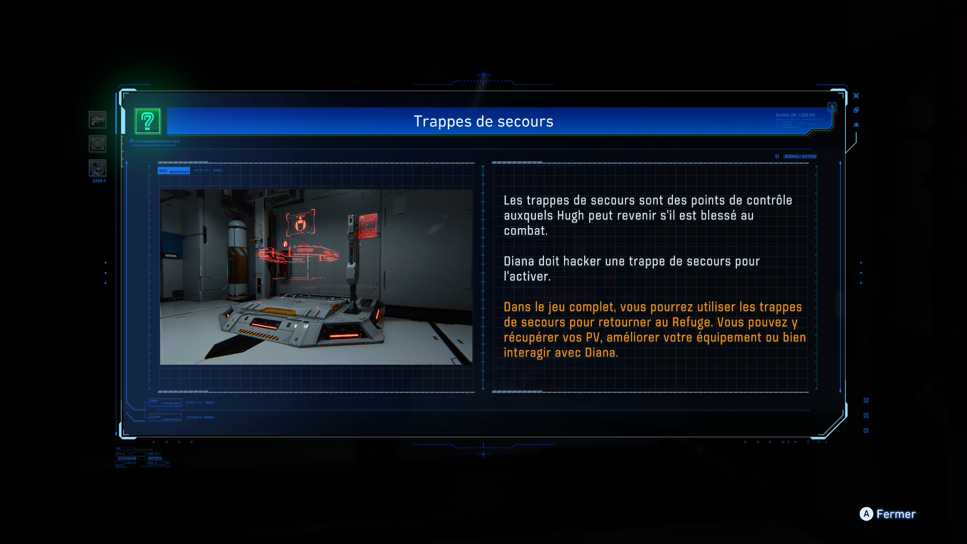 En dehors des combats, Hugh et Diana exploreront la station lunaire. A partir du Refuge, ils pourront monter dans le tramway, qui pourra les conduire à tous les sas d’évacuation qu’ils auront précédemment déverrouillés. Ces sas servent également de point de sauvegarde important tout au long du voyage de Hugh et Diana pour retourner sur Terre. »