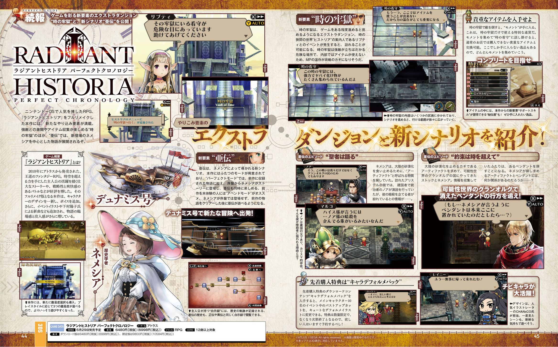 Radiant Historia : Perfect Chronology est un remake du RPG Radiant Historia, sorti sur Nintendo DS le 3 novembre 2010 au Japon puis le 22 février 2011 aux États-Unis. Vous pouvez en apprendre plus sur le jeu en consultant nos articles à cette adresse. Perfect Chronology sera disponible le 29 juin prochain au Japon pour 6998 yens (taxes incluses) en version standard et une Perfect Edition sera également proposée au prix de 10 584 yens avec une version physique du jeu, l’album complet de la bande-son (deux disques) comprenant toutes les musiques composées par Yoko Shimomura ainsi que les 5 pistes arrangées et d’autres arrangements inédits, un artbook spécial avec 100 pages en couleur et trois packs de DLC (cinq objets, quatre histoires secondaires, une fonctionnalité pour utiliser les illustrations d’origine des personnages réalisées par Hiroshi Konishi, à part pour les nouveaux personnages, et l’option Character Deformation qui permettra de modifier les illustrations des 10 personnages principaux en versions “chibi”, dessinées par CHANxCO). Des Famitsu DX Packs et des bonus de précommande seront aussi de la partie.