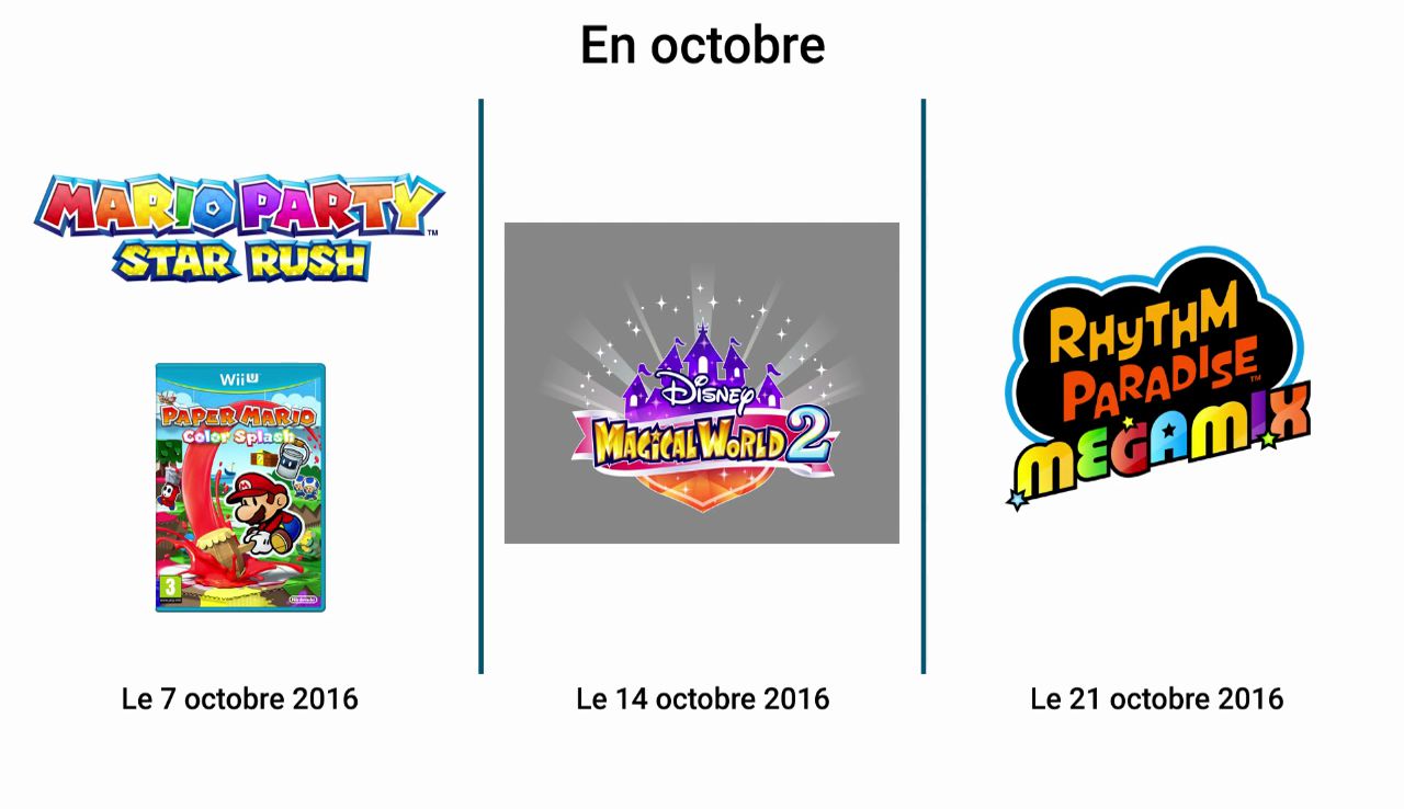 – Mario Party : Star Rush : présentation de certains modes présents dans le jeu, des nouveaux amiibo Super Mario et du logiciel gratuit Mario Party : Star Rush – Party Guest. Mario Party : Star Rush sera disponible sur 3DS le 7 octobre en Europe, le 20 octobre au Japon et le 4 novembre aux États-Unis.