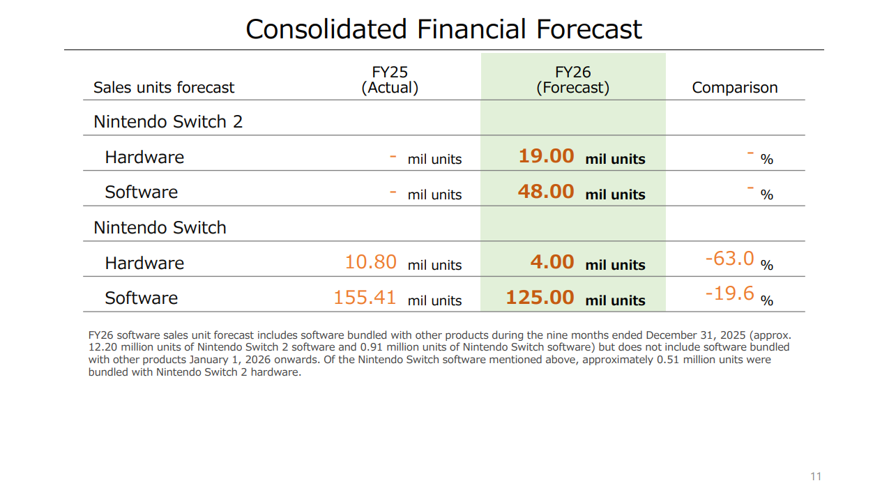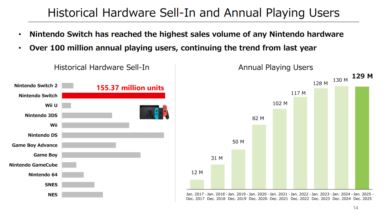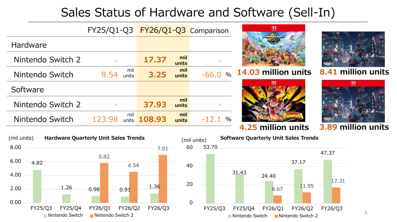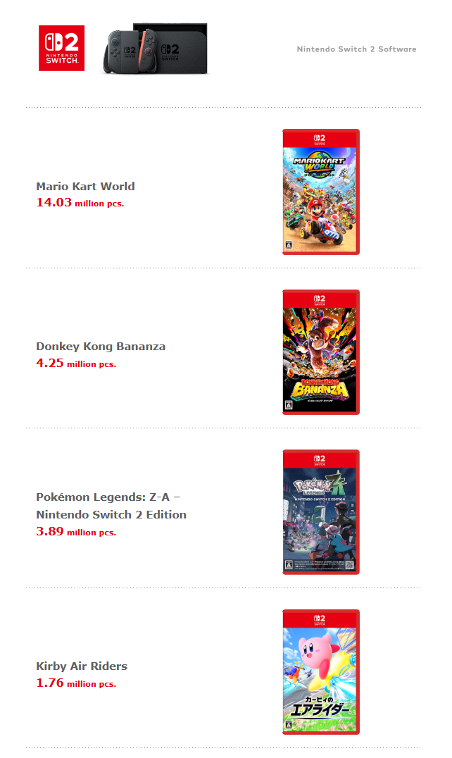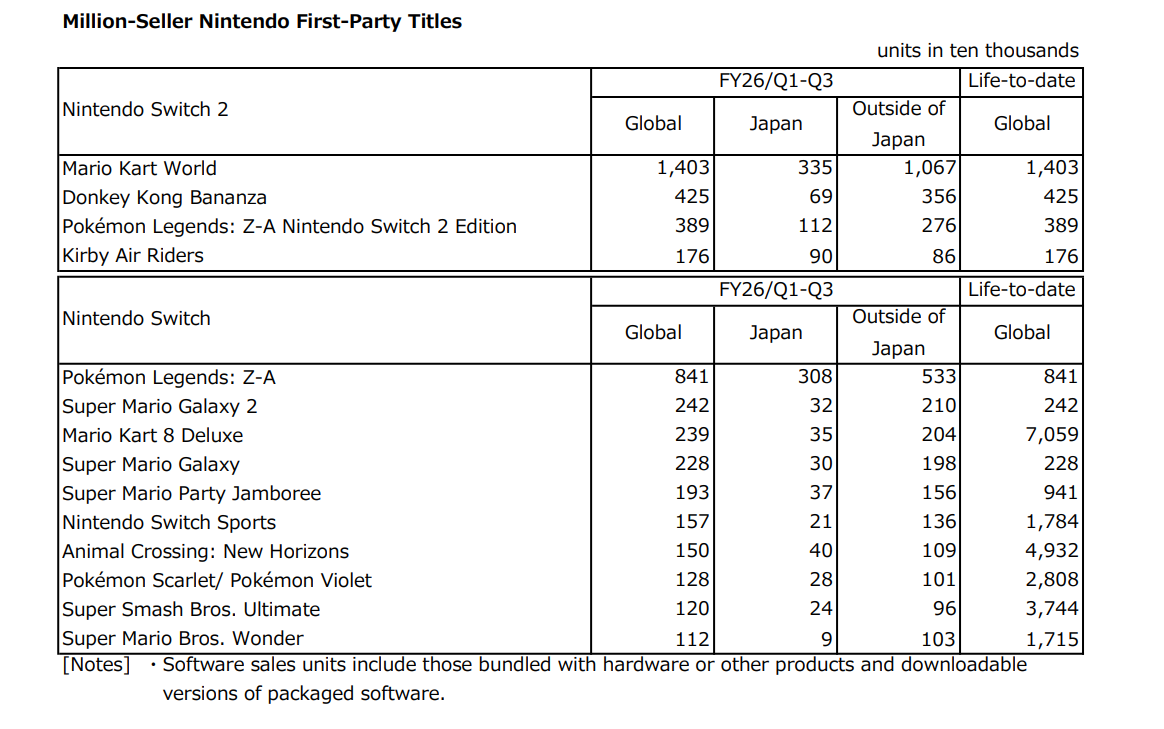 Nintendo a publié, ce 3 février 2026, ses résultats financiers pour la période du 1er avril au 31 décembre 2025. Jusqu’à cette dernière date, on apprend que la Nintendo Switch 2 s’est vendue à 17,37 millions d’exemplaires dans le monde, tandis que la Nintendo Switch a atteint les 155,37 millions d’unités écoulées. Cela signifie que la Switch est devenue la console la plus vendue dans l’histoire de Nintendo, devant la DS et ses 154,02 millions d’exemplaires vendus. La Switch était déjà devenue la console Nintendo sur laquelle le plus de jeux ont été vendus depuis plusieurs trimestres, devant la Wii et la DS. Jusqu’au 31 décembre 2025, 1 500, 16 millions de jeux ont été vendus sur Switch. Du côté de la Switch 2, ce sont 37,93 millions de jeux qui ont été vendus. Par ailleurs, les ventes de la Switch 2 ont déjà dépassé celles de la Wii U, qui s’élèvent à 13,56 millions. Nintendo indique par ailleurs que la Switch 2 est la console qui a connu le meilleur démarrage de l’histoire ; elle est celle qui s’est vendue le plus rapidement selon les ventes connues, devant la Switch. Entre le 1er octobre et le 31 décembre, 7,01 millions de Switch 2 ont été vendues pour 17,31 millions de jeux. Concernant la Switch, 1,36 millions de consoles et 47,37 millions de jeux ont été vendus.