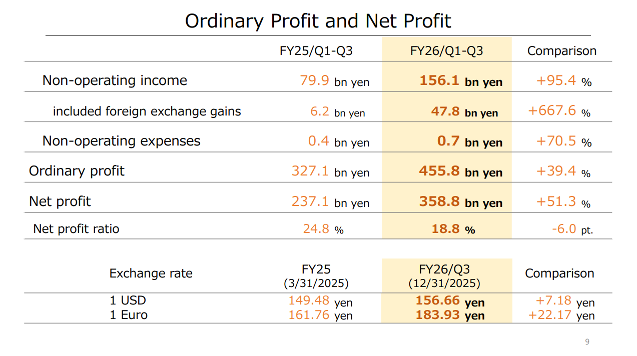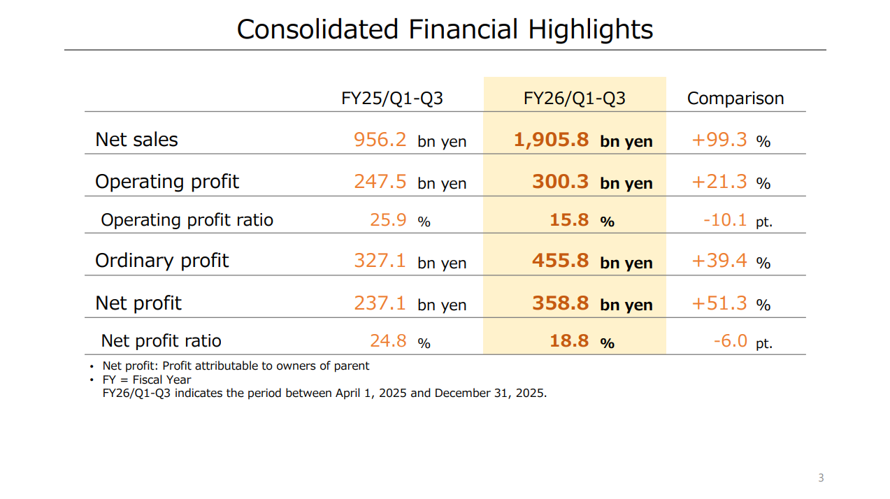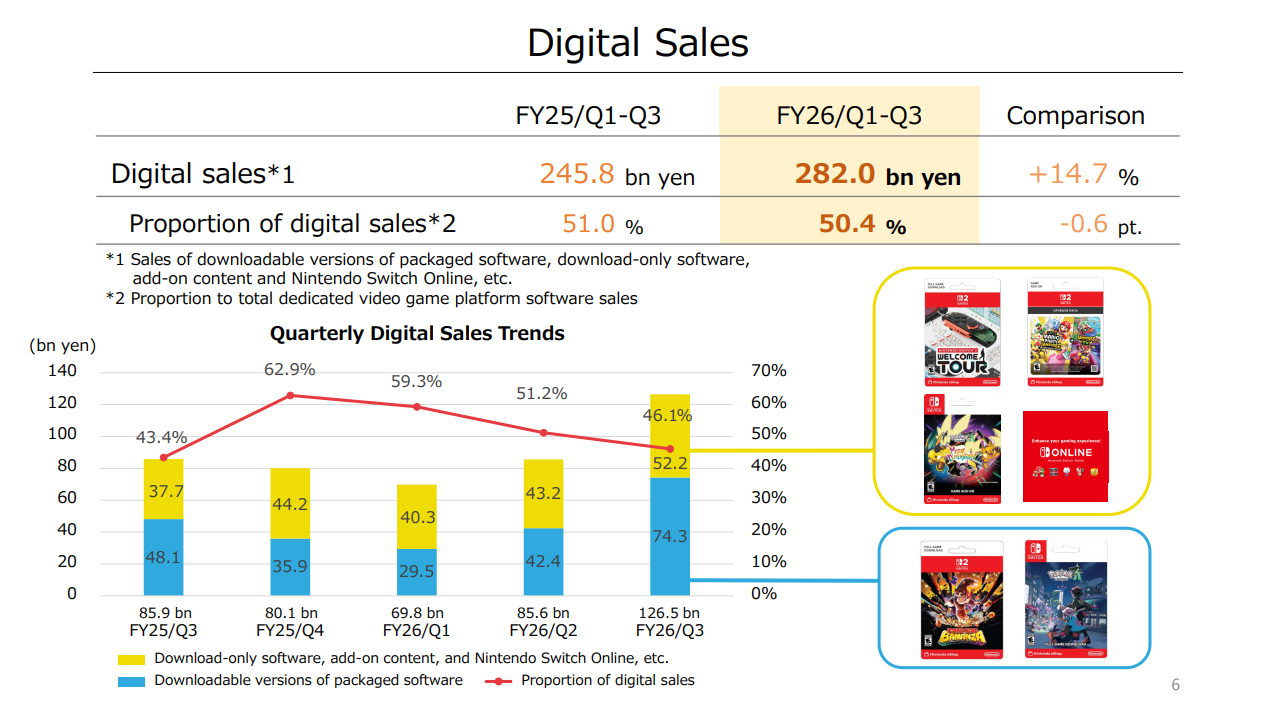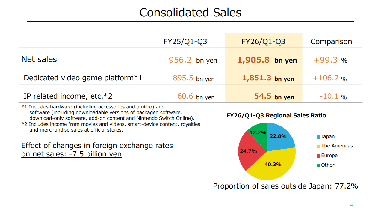 L’information concernant le démarrage de la Switch 2 a été donnée dans le nouveau document explicatif des résultats financiers. Dans ce même document et celui des informations marquantes données par l’entreprise, il a été retenu que le bénéfice net a connu une forte augmentation entre le 1er avril et le 31 décembre 2025. En effet, on note une augmentation de 51,3 % par rapport à l’année fiscale précédente. Pour être plus précis, le bénéfice net s’élevait à 358,9 milliards de yens, contre 237,1 milliards de yens par rapport à l’année fiscale précédente sur la même période. Par ailleurs, le chiffre d’affaires a été doublé : 1 905,8 milliards de yens, soit une augmentation de 99,3 % par rapport à l’année fiscale précédente. Nintendo prévoit toujours de vendre 19 millions de Switch 2 et 48 millions de jeux Switch 2, ce qui n’a donc pas changé par rapport aux informations données dans les résultats financiers précédents.