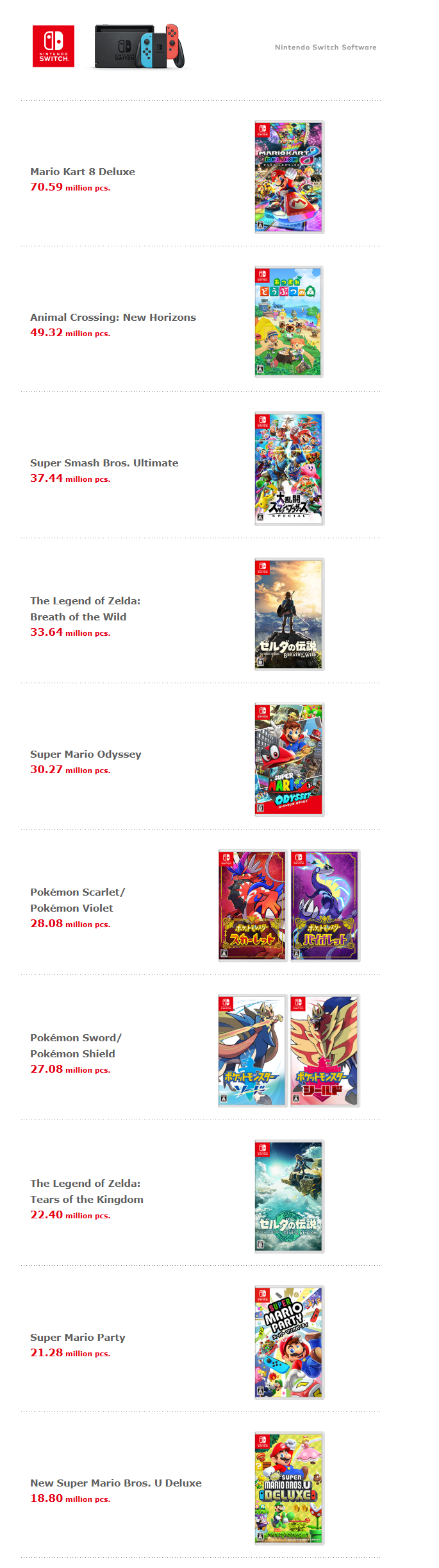 En ce qui concerne les meilleures ventes de jeux vidéo sur consoles Nintendo, voici les données fournies par Nintendo dans les différents documents ainsi que sur le site officiel dédié :