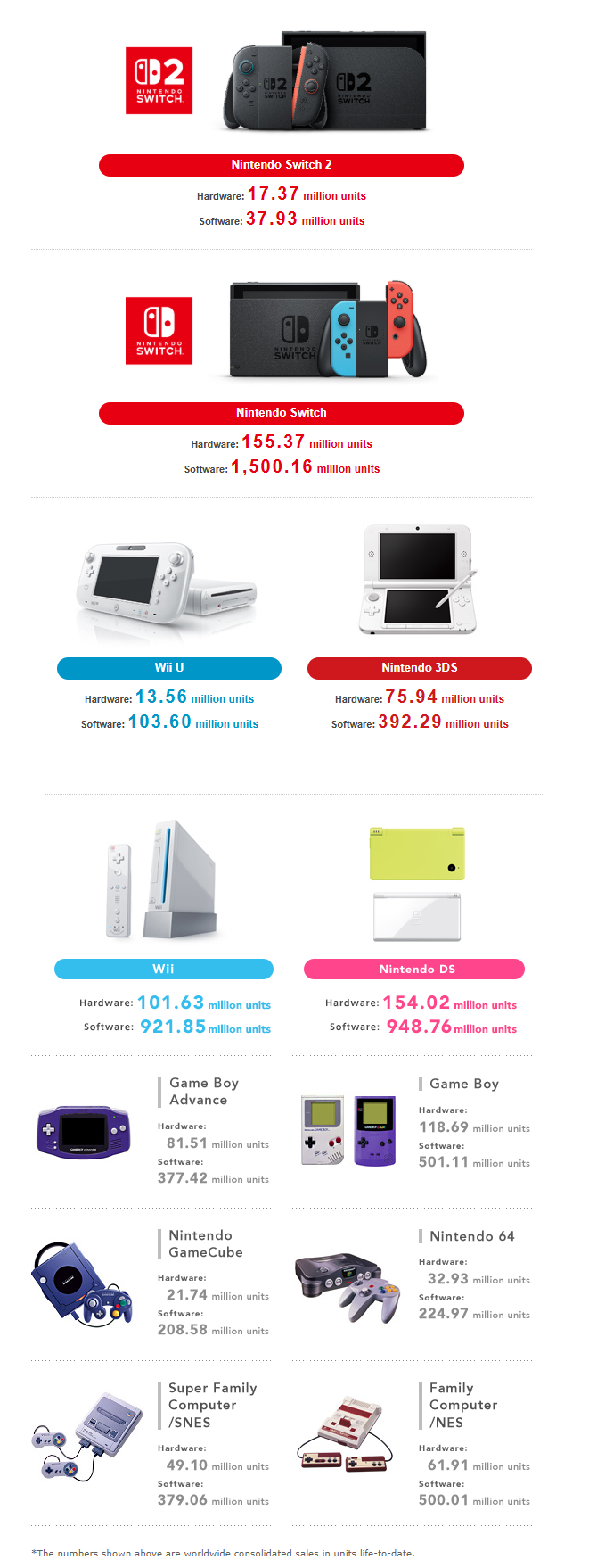 À noter que les meilleures ventes de jeux Wii et DS n’apparaissent désormais plus sur le site officiel de Nintendo. Les dernières données enregistrées datent du 31 mars 2025. Elles apparaissent encore, mais les meilleures ventes de jeux Wii U et 3DS n’ont pas été mises à jour depuis le 31 mars 2025. Vous pouvez les retrouver à cette adresse.