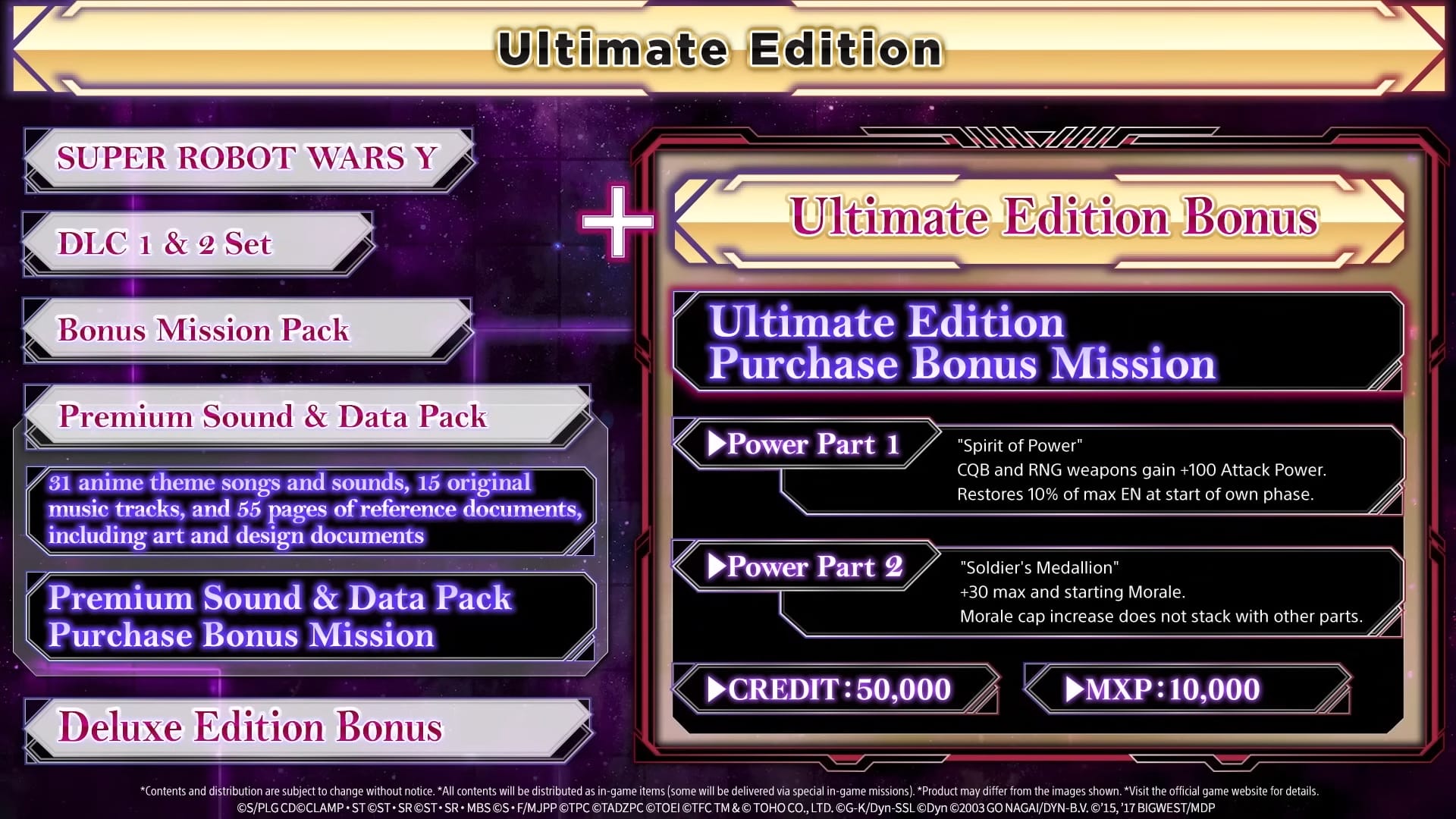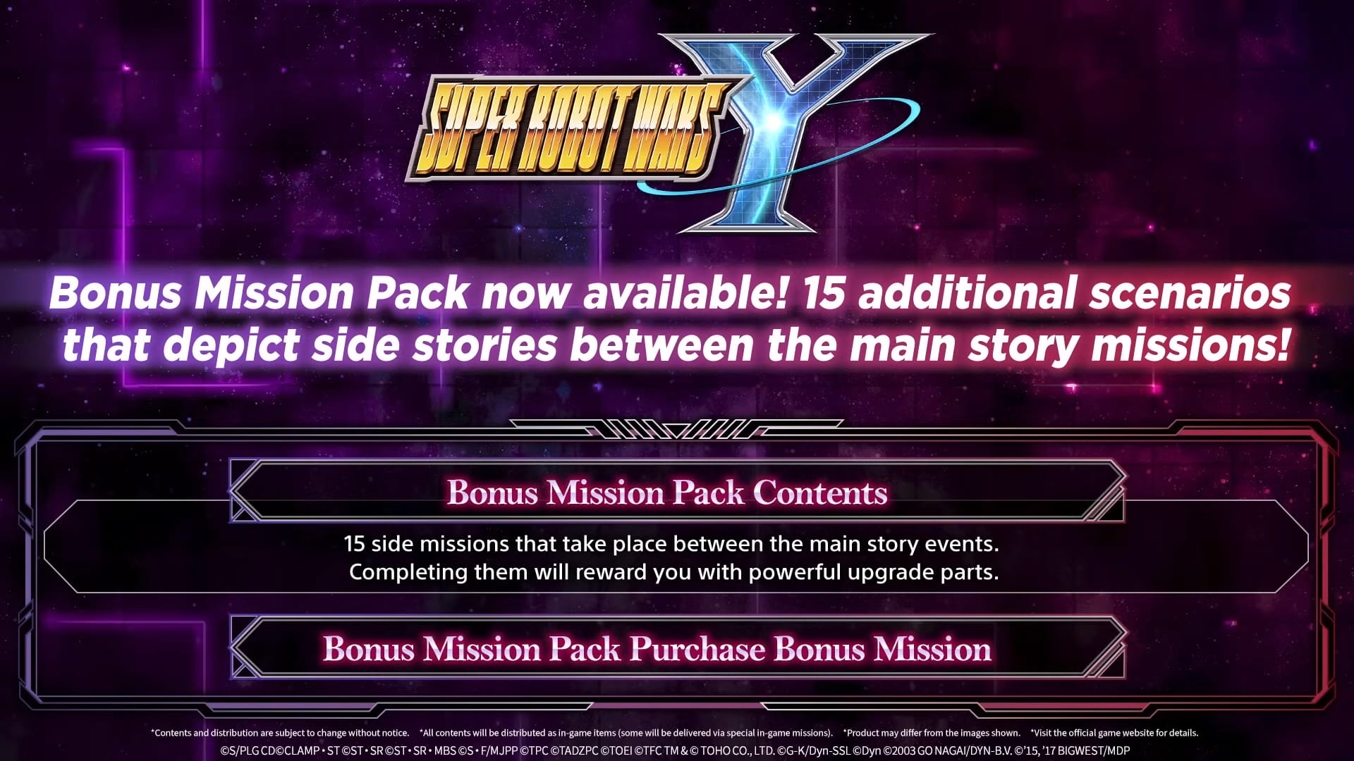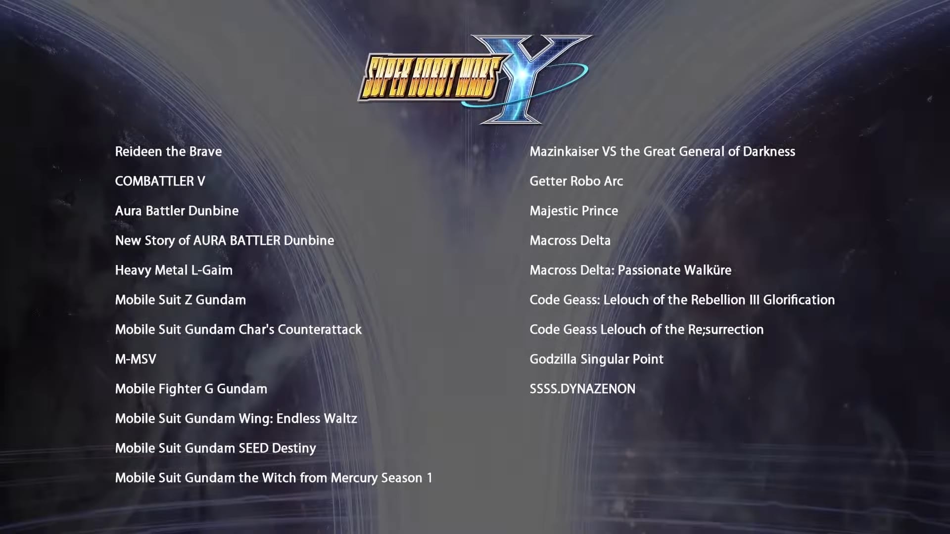 Super Robot Wars Y signe le retour du Mazin Emperor G de Tetsuya Tsurugi, du PMX-003 The-O (en tant qu’ennemi de Paptimus Scirocco et de l’attaque combinée Sekiha Love Love Tenkyoken de Domon Kasshu et Rain Mikamura. XVX-016RN Gundam Aerial Rebuild et VF-31J-Kai Super Siegfried apparaissent aussi dans le jeu. Par ailleurs, Bandai Namco révélait une attaque combinée du Gekkoei Sui de Code Geass, Lancelot siN, et Guren Type Special, avec le Zero Burst Mode of Lancelot siN.