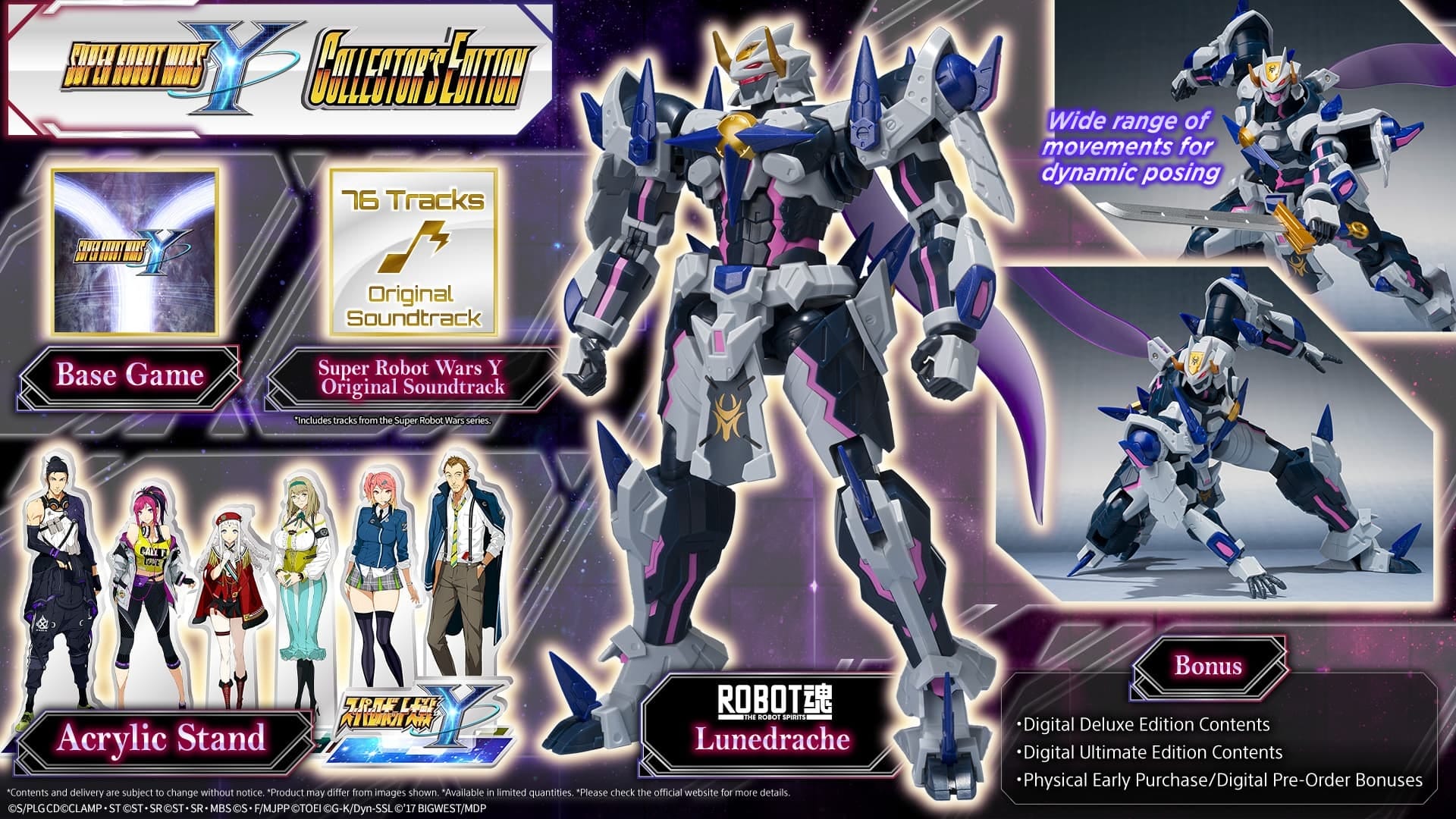 En Occident, Super Robot Wars Y est uniquement disponible en téléchargement. Le jeu comporte des textes en anglais, japonais, coréen et chinois (simplifié et traditionnel), ainsi que des voix en japonais. La version japonaise/asiatique inclut les textes en anglais et est vendue en physique sur Switch et PS5. Il y a une édition standard et une édition collector, qui sont toutes les deux toujours disponibles et qui peuvent être commandées sur des boutiques en ligne comme Amazon JP et Play-Asia (dans le cas de Play-Asia, seule l’édition standard est disponible). L’édition collector comprend une figurine Robot Spirits du Lunedrache (design : M gandy), le mécha du protagoniste dans Super Robot Wars Y, 6 stands en acrylique qui représentent les personnages inédits apparaissant exclusivement dans Super Robot Wars Y, un album comprenant 76 musiques et des codes de téléchargement permettant de télécharger l’ensemble des DLC, ainsi que le contenu des éditions téléchargeables Deluxe et Ultimate.