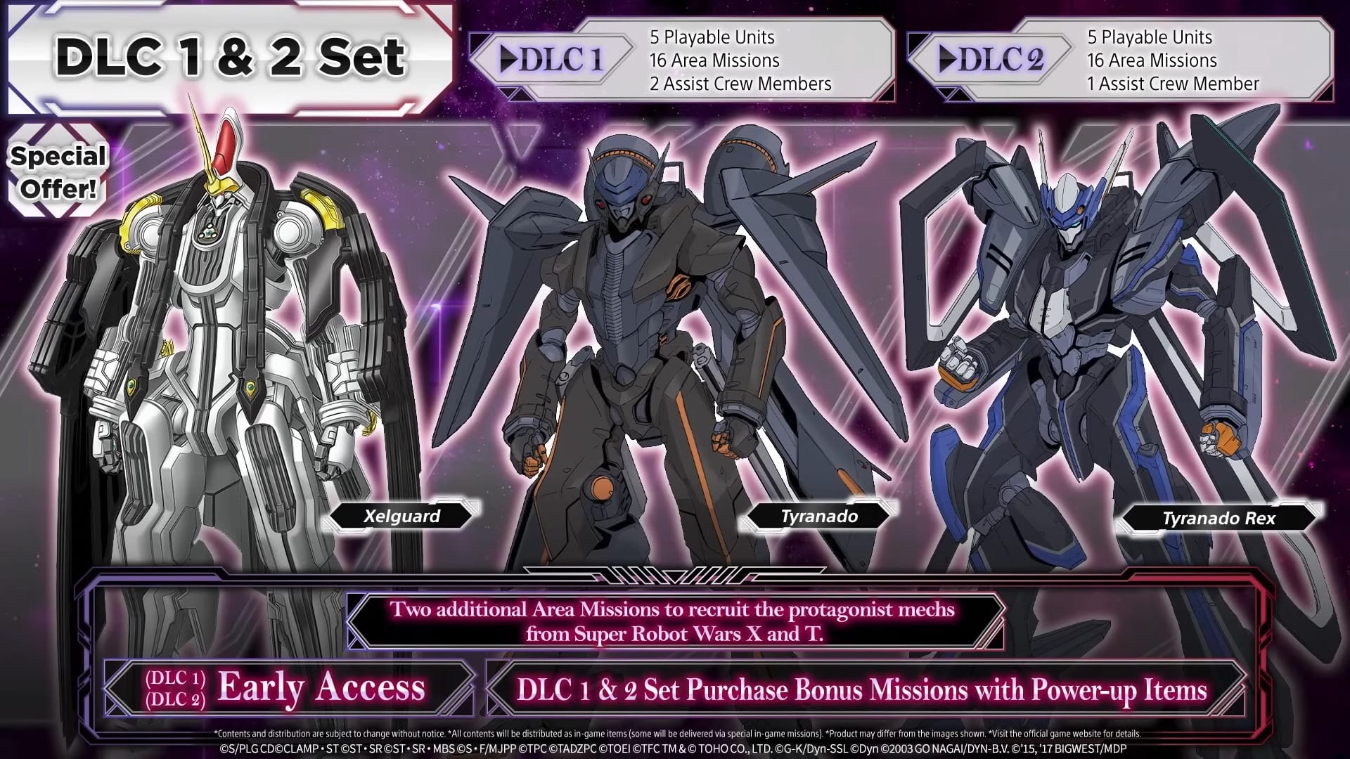 Les deux DLC ajouteront de nouvelles unités à utiliser dans le jeu qui proviendront de 6 œuvres différentes. Parmi les unités, le Getter Noir était déjà apparu dans les jeux Super Robot Wars X-Ω et Super Robot Wars DD, mais n’était pas apparu sur consoles, comme le rappelle RPG Site. Pour la première fois, The Brave of Legend Da-Garn et Fuuto PI : Kamen Rider Skull’s Portrait seront représentées dans la série de Super Robot Wars par le biais des DLC. Fuuto PI : Kamen Rider Skull’s Portrait est un film d’animation qui reprend l’univers de Fuuto PI, la suite, à l’origine sous la forme d’un manga, de la série tokusatsu Kamen Rider W/Double. Les DLC sortiront à des dates ultérieures, d’ici le mois d’août 2026 d’après Bandai Namco. À noter qu’en achetant le pack de DLC, on peut obtenir des missions bonus qui permettent de débloquer les unités du protagoniste de Super Robot Wars X et T, Xelguard, Tyranado et Tyranado Rex.