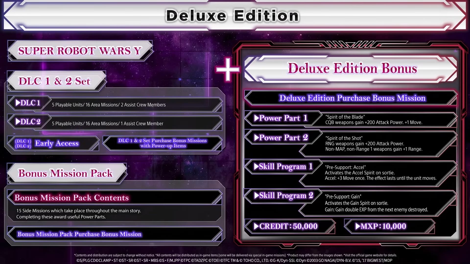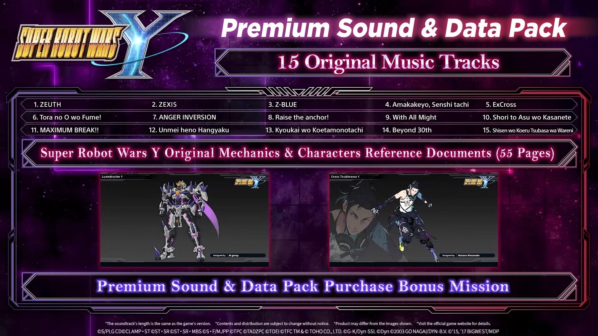 Bandai Namco a diffusé de nombreuses informations sur Super Robot Wars Y avant sa sortie, en plus de toutes celles détaillées ci-dessus. Par exemple, en mai dernier, l’équipe détaillait ce que l’on indiquait en début d’article, et présentait trois personnages apparaissant exclusivement dans Super Robot Wars Y, en plus des protagonistes Forte Tsukinowa, Echika Y. Franburnett et Cross Tsukinowa, dont le design a été réalisé par Wataru Watanabe. Cross et Forte sont des gardiens chargés de protéger l’ensemble du vaisseau A.Advent, dont sa propriétaire, Echika, et les moyens de subsistance des personnes vivant dans la grande zone civile à l’intérieur du vaisseau.