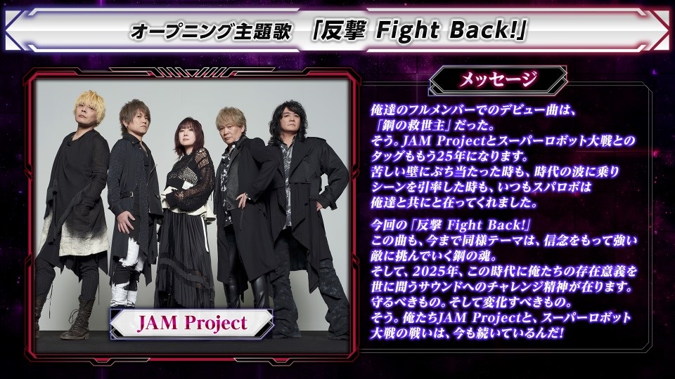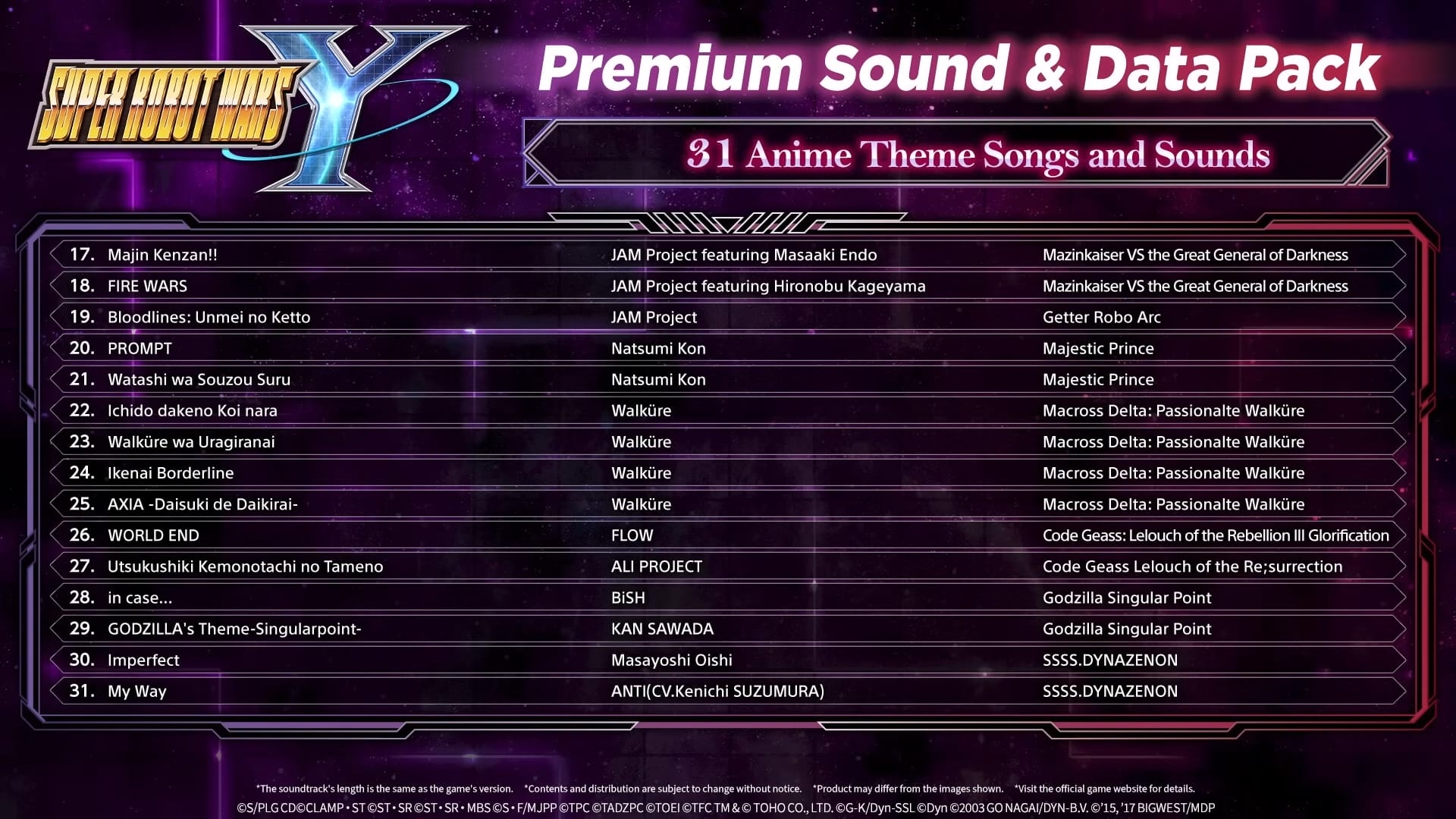 Super Robot Wars Y comprend sa propre chanson thème, Hangeki Fight Back, interprétée par JAM Project. Elle est incluse dans l’album JAM Project BEST COLLECTION XV FINAL COUNTDOWN du groupe, sorti le 16 juillet dernier.