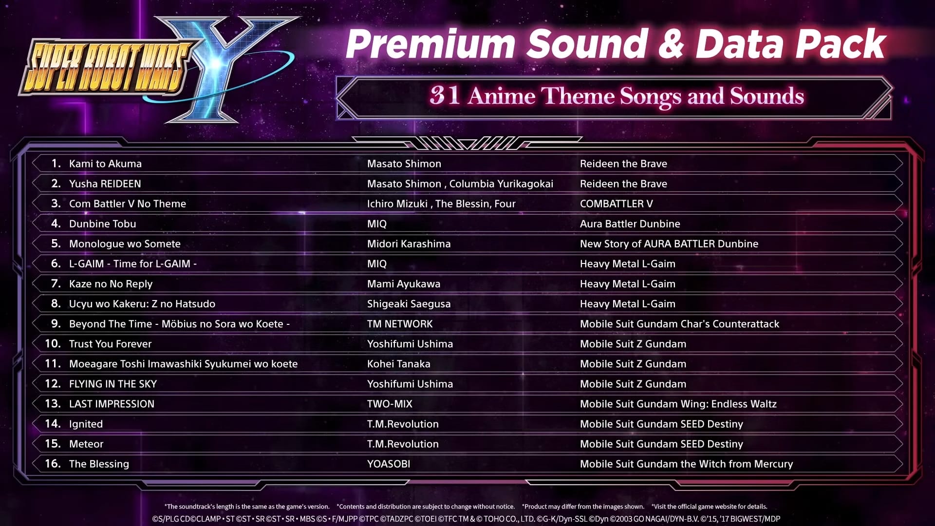 – 31 thèmes et OST d’anime, 15 pistes musicales originales, et 55 pages de documentation de référence, comprenant notamment des illustrations et des concept arts