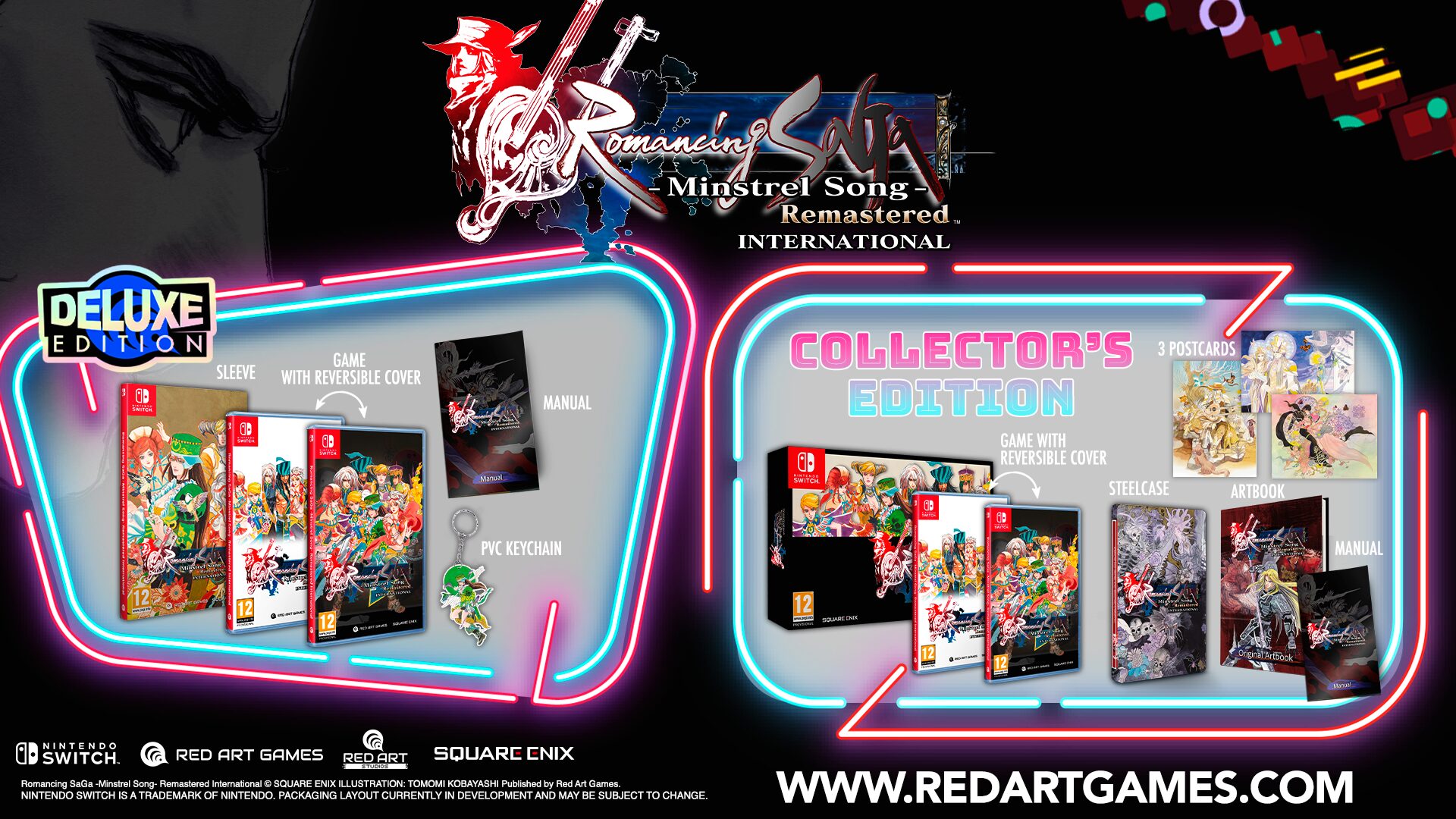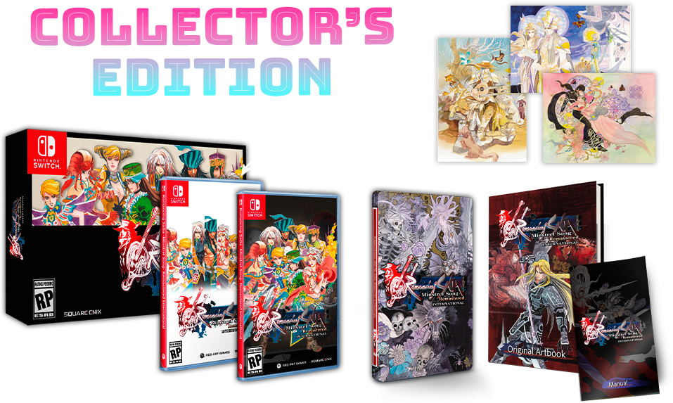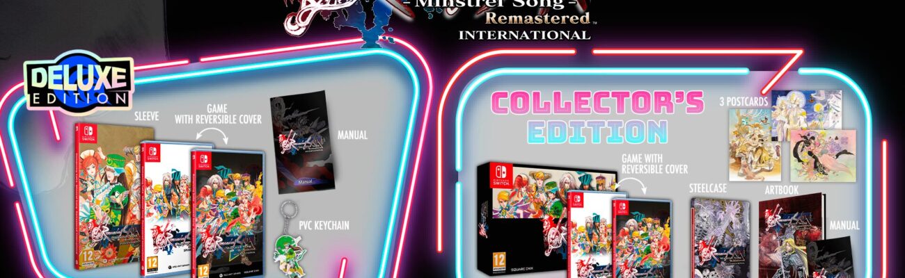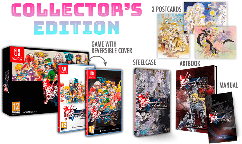 Le remaster du RPG Romancing SaGa -Minstrel Song- va revenir en début d’année prochaine en Occident avec une version International sur Nintendo Switch, PlayStation 4 et PlayStation 5 qui offrira des textes traduits en français, allemand, italien et espagnol. Pour cela, Square Enix s’est associé à Red Art Games, qui propose d’ores et déjà en précommande des éditions physiques sur sa boutique officielle. Il y a une version standard à 44,99 € comprenant un manuel en plus du jeu sur la cartouche/le disque, une Deluxe Edition au même prix avec une pochette exclusive où figurera une couverture alternative, une couverture réversible, le manuel et un porte-clés en PVC, et enfin une Collector’s Edition coûtant 69,99 € qui comprendra une boîte spéciale avec une couverture d’inspiration rétro (le design sera différent entre les versions Switch et PlayStation, une couverture réversible, trois cartes postales illustrées, le manuel, un boîtier en acier et un artbook. À noter qu’il est possible d’essayer le jeu et de découvrir les nouvelles options de traduction à la gamescom 2024, sur le stand de Red Art Games dans le Hall 10. Autre chose qu’il est bon de rappeler, le remake Romancing SaGa 2 : Revenge of the Seven sera lui aussi jouable avec des textes traduits en français.