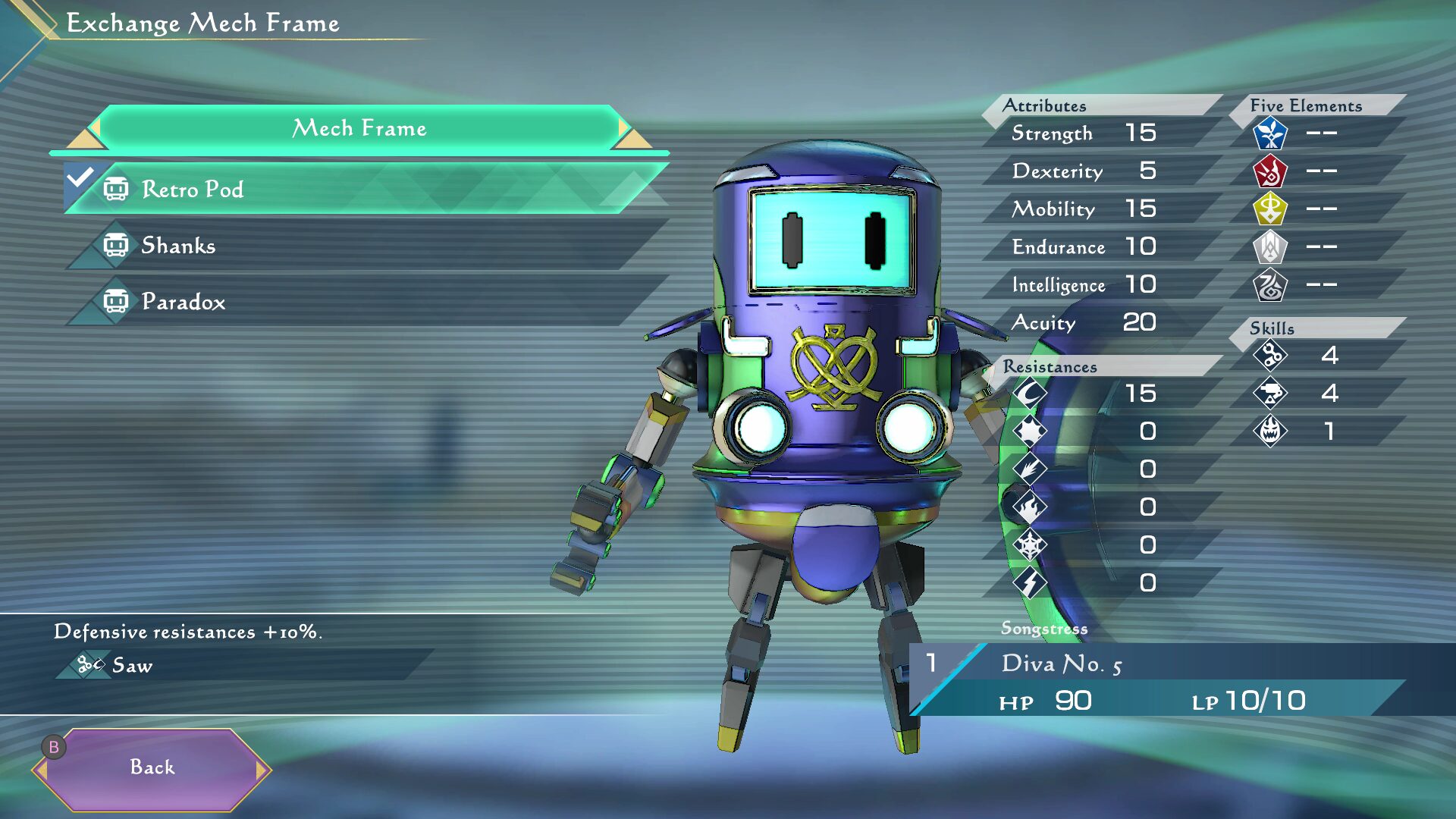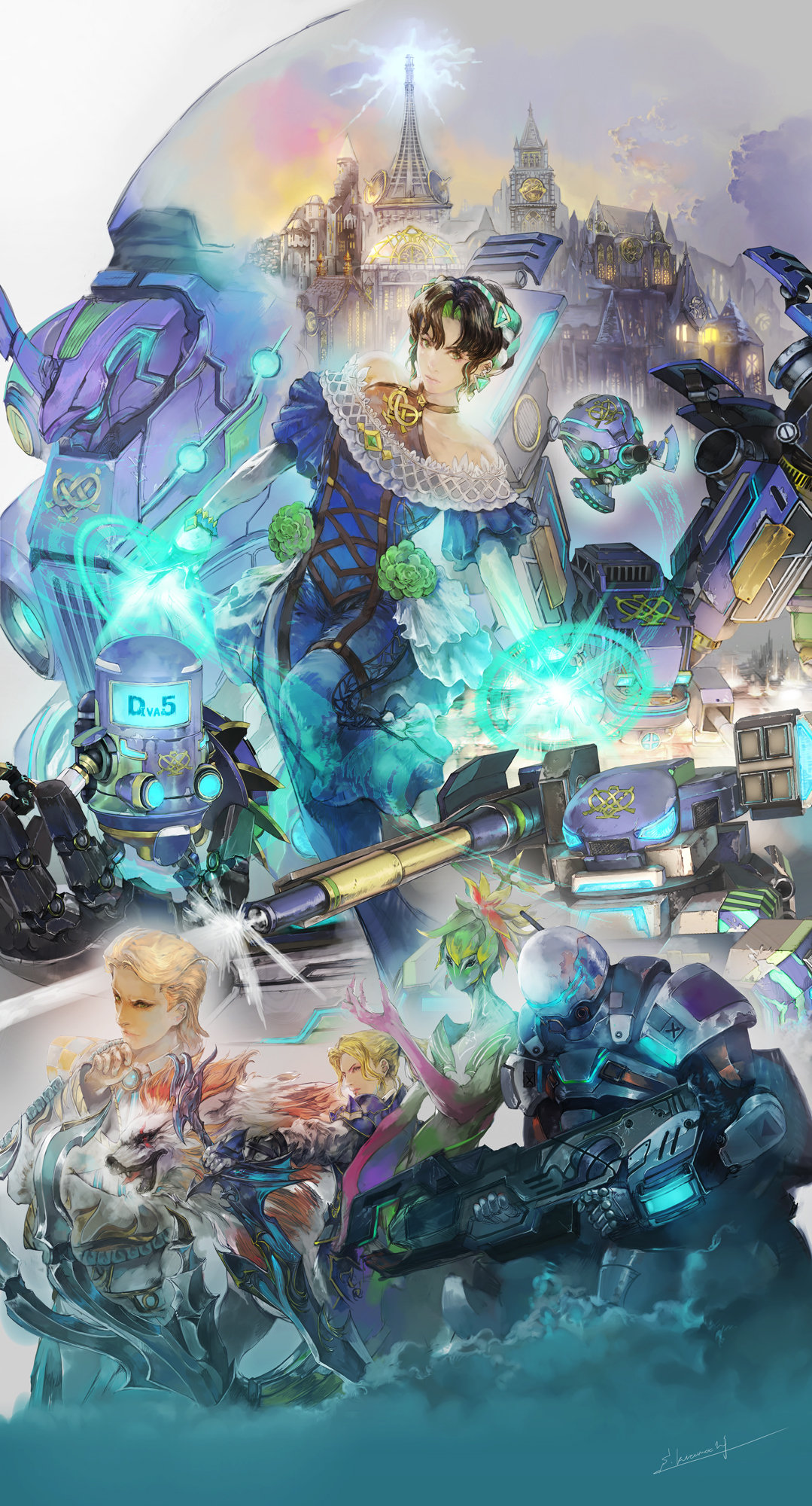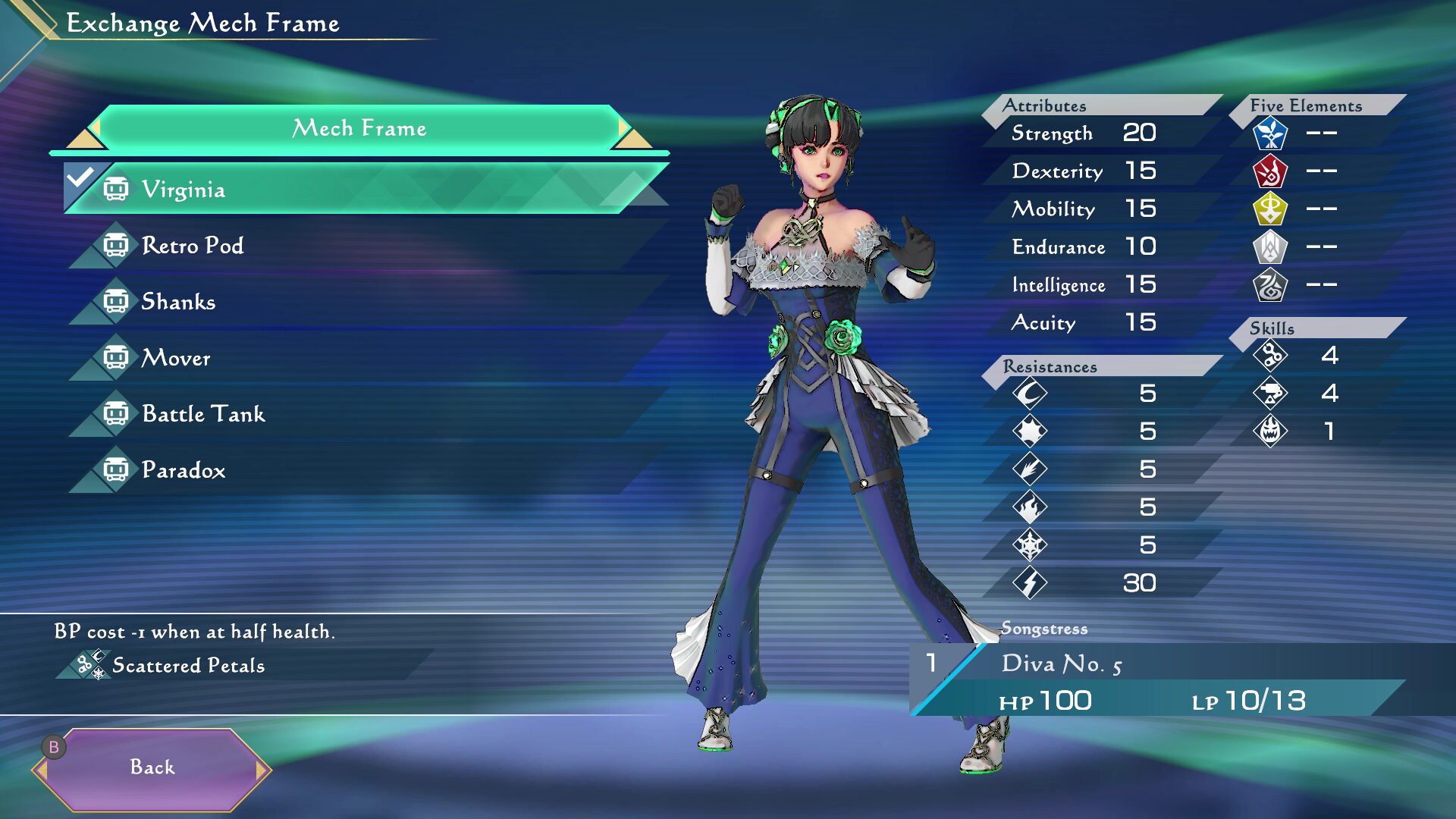 Diva No. 5 (voix japonaise : Ayaka Suwa) : une cantatrice robotique qui a perdu sa voix et son corps. Diva No. 5 est une mécha conçue pour chanter et danser dans le monde d’Avalon, où l’industrie s’est développée autour de la capitale royale. Elle était l’artiste parfaite, capturant le cœur de tous ceux qui la voyaient se produire, jusqu’au jour où elle interpréta une chanson interdite qu’elle avait trouvée au Royal Museum, ce qui eut pour effet de sceller sa mémoire et sa fonction de chant. D’un seul coup, elle ne peut plus gagner sa vie et perd la capacité de maîtriser et apprécier la musique elle-même. Désespérée, Diva se débarrasse de son corps « humain » et reçoit rapidement une invitation à rejoindre une société secrète. Sans plus y réfléchir, elle rejoint l’organisation et laisse Avalon derrière elle.