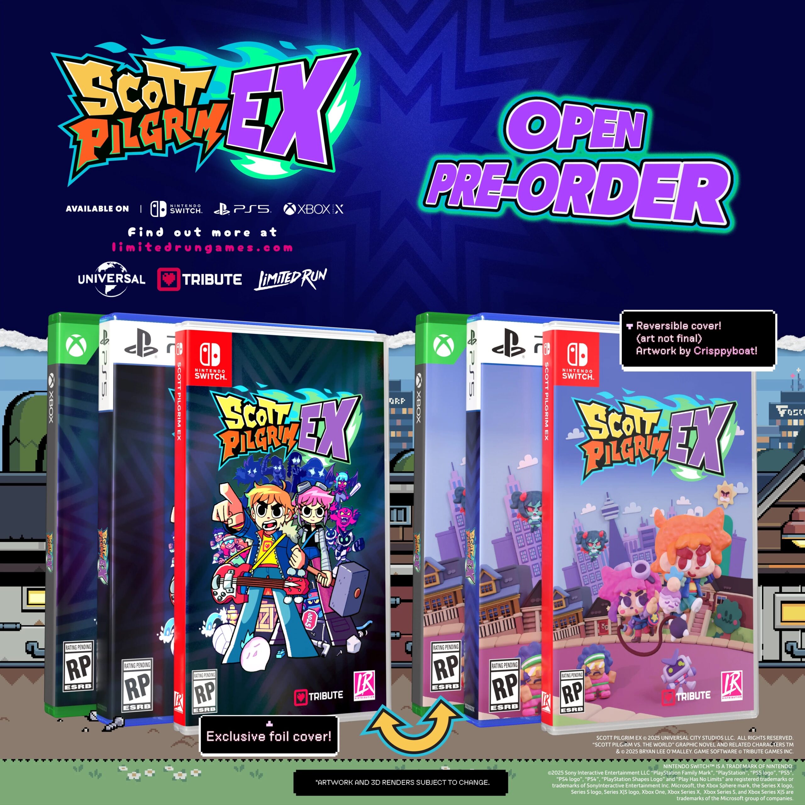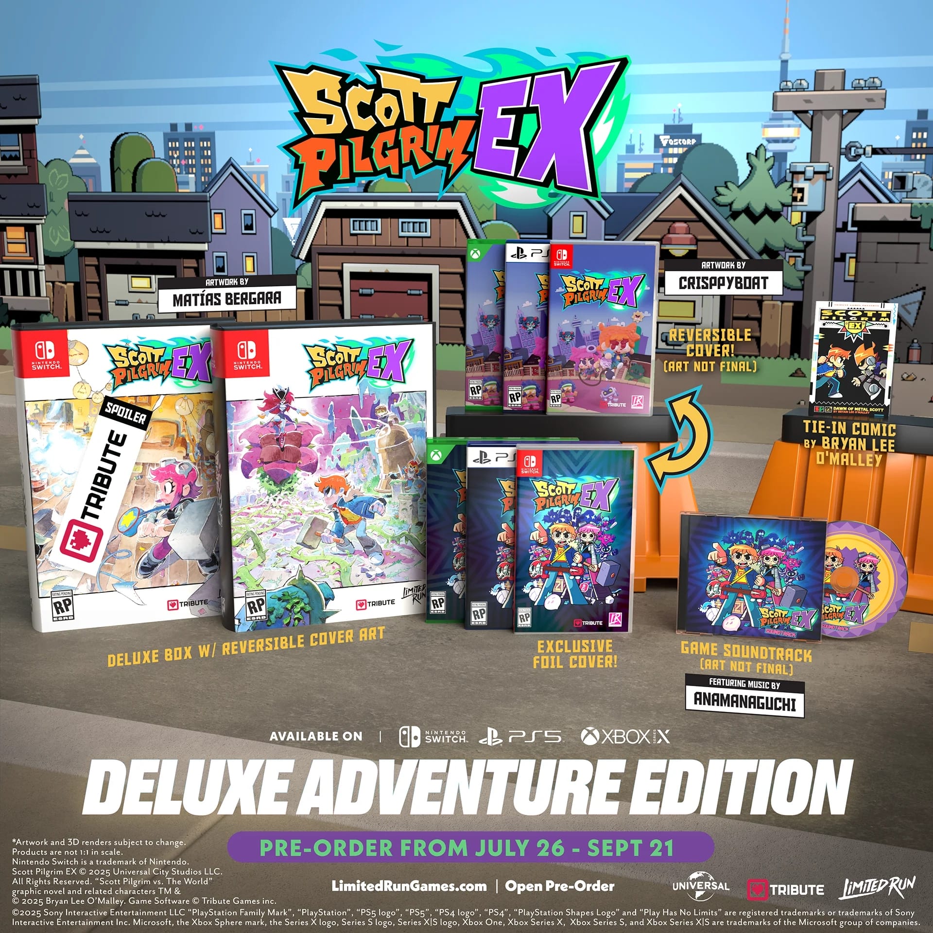En juin dernier, le studio Tribute Games (MARVEL Cosmic Invasion, Teenage Mutant Ninja Turtles : Shredder’s Revenge, Panzer Paladin, Mercenary Kings, Flinthook…) annonçait, en collaboration avec Bryan Lee O’Malley, le créateur de Scott Pilgrim, et Universal Products & Experiences, le jeu Scott Pilgrim EX. Sa sortie est prévue pour début 2026 sur Nintendo Switch, PlayStation 4, PlayStation 5, Xbox Series et PC via Steam. Pour rappel, Tribute Games, qui est situé à Montréal, avait été formé par d’anciens employés d’Ubisoft, Jonathan Lavigne, Jean-François Major et Justin Cyr, qui avaient travaillé sur Scott Pilgrim contre le Monde : le jeu et le jeu TMNT sur Game Boy Advance. Avant la sortie du jeu en téléchargement, il est possible de précommander trois éditions physiques en version américaine sur Nintendo Switch, PS5, Xbox Series X et PC en exclusivité sur la boutique de Limited Run Games. L’édition standard à 39,99 $ devrait être expédiée entre le 20 et 31 janvier 2026 et n’a pas de date limite de précommande. L’édition Deluxe Adventure coûte 64,99 $ et son expédition est prévue entre le 24 et le 3 mars 2026. Enfin, l’édition Ultimate Adventure à 174,99 $ est la seule qui est aussi proposée sur PC (code Steam) et son expédition est prévue entre le 16 et le 30 juin 2026. À noter que les éditions Deluxe Adventure et Ultimate Adventure peuvent être précommandées uniquement jusqu’au lundi 22 septembre à 05:59.
