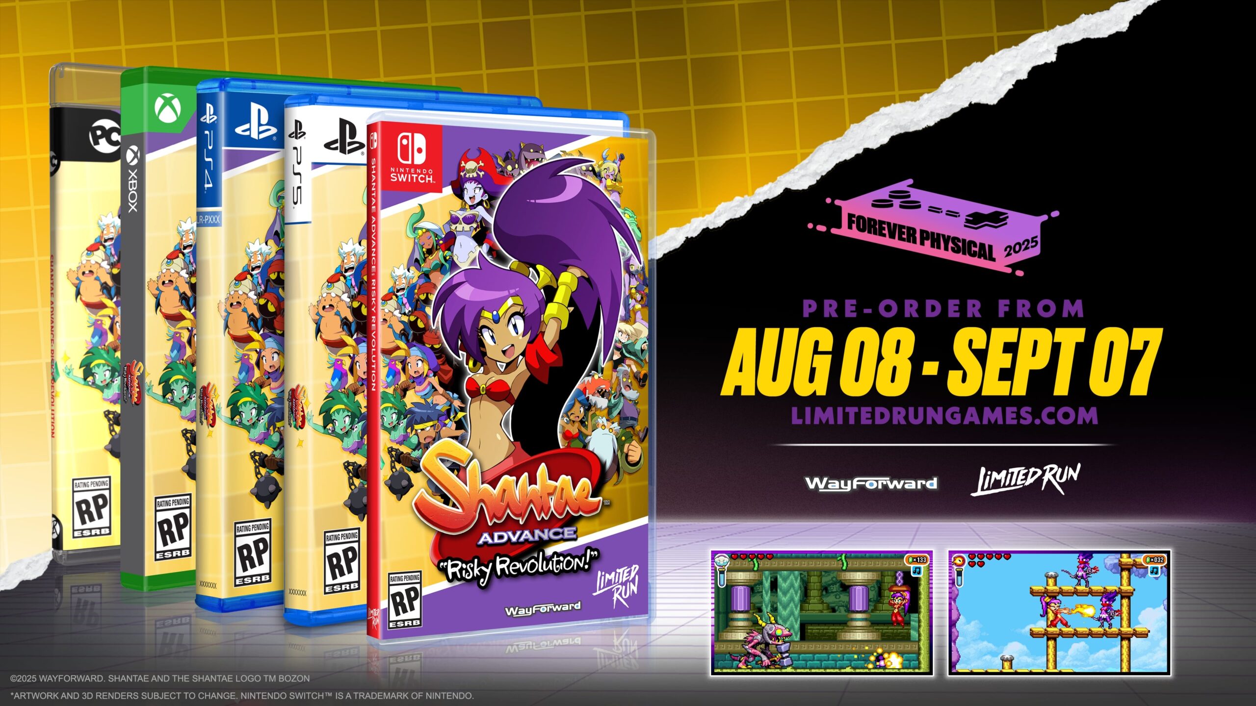 Shantae Advance : Risky Revolution, la suite autrefois perdue du premier épisode de la célèbre série de WayForward, a fini par débarquer sur Game Boy Advance le 21 avril 2025 par le biais des éditions physiques en version américaine proposées par Limited Run Games en 2024. Comme annoncé précédemment, le jeu va également être porté sur consoles, plus précisément sur Nintendo Switch, PlayStation 4, PlayStation 5, Xbox One et Xbox Series, ainsi que sur PC via Steam. Le portage sera disponible précisément le 19 août 2025 en téléchargement. Sur l’eShop, le jeu est disponible en précommande pour 19,99 € au lieu de 24,99 € jusqu’au 25 août. Il s’agit de la réduction pour la version standard, une Deluxe Edition étant également proposée pour 27,99 € au lieu de 34,99 € jusqu’au 25 août. On détaille le contenu ci-dessous, avec une présentation du jeu et les informations sur les éditions physiques.