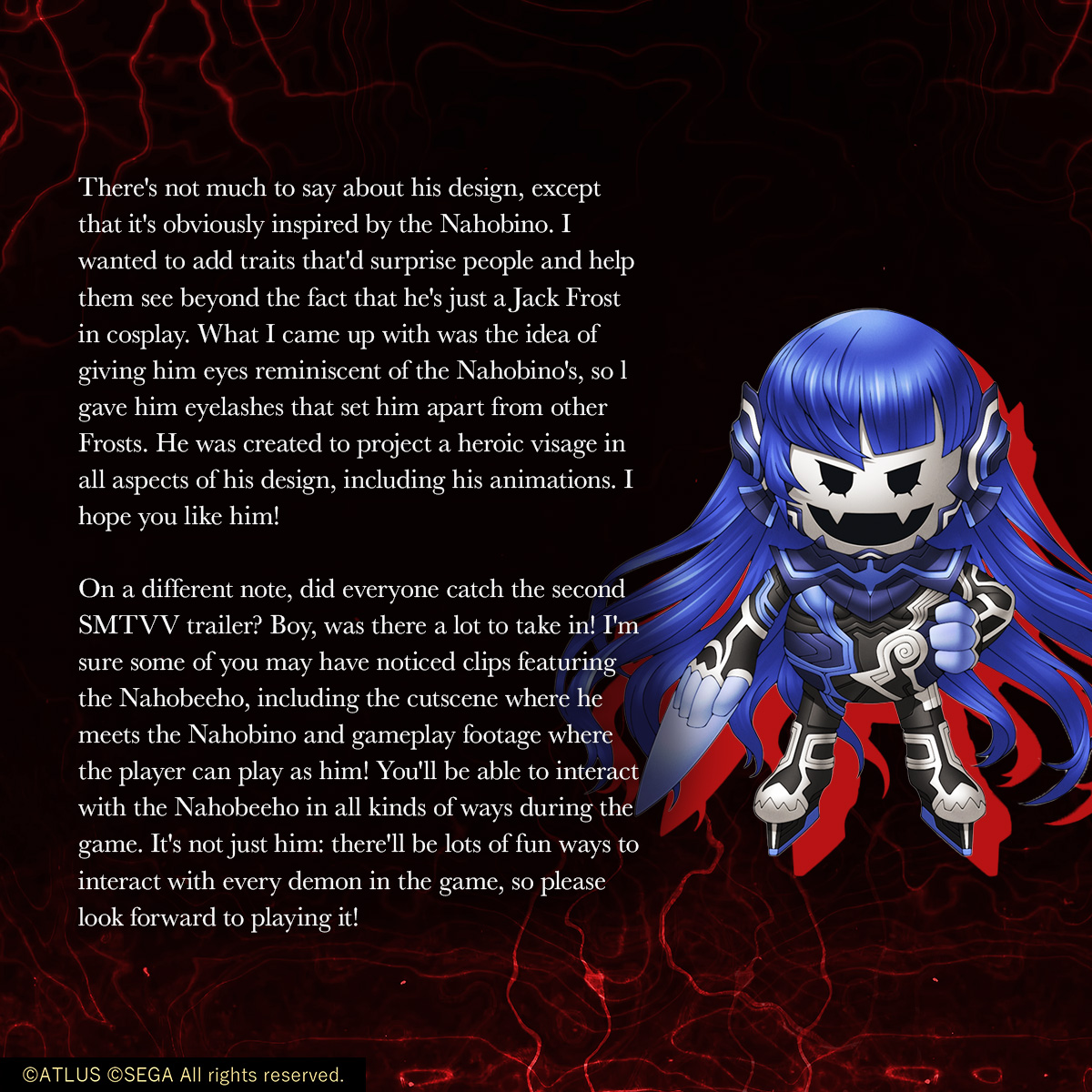 Enfin, la page Facebook d’Atlus SEA a partagé de nouvelles vidéos avec des messages du réalisateur, Shigeo Komori, et du character designer, Masayuki Doi. En parlant de Doi, une traduction anglaise de son message concernant le nouveau démon Na-ho-hi-ho a été publiée. Les commentaires concernant d’autres nouveaux démons importants ont été réunis dans notre galerie qui se trouve ici.