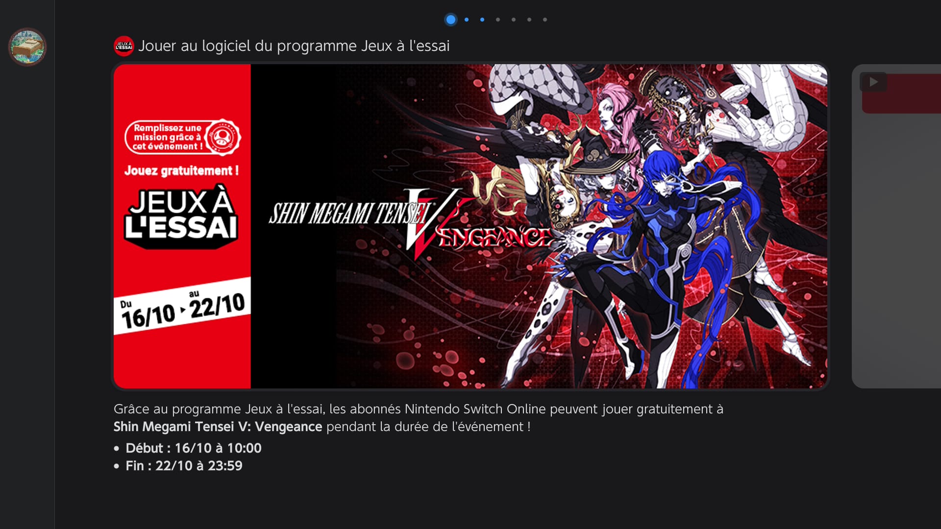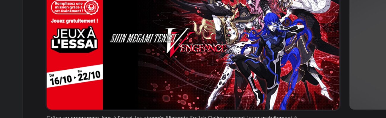 Après Monster Hunter Stories 2 : Wings of Ruin en août dernier, c’est au tour d’un autre titre de rejoindre le programme « Jeux à l’essai » du service Nintendo Switch Online en ce mois d’octobre 2025 : Shin Megami Tensei V : Vengeance. Sa version complète téléchargeable sur l’eShop ou sur le site de Nintendo of Europe est donc jouable gratuitement jusqu’au 22 octobre 2025 à 23:59. Après cette date, Nintendo proposera de se le procurer. Sans réduction, la version standard coûte 59,99 €. Une édition numérique deluxe est aussi disponible pour 69,99 €. À noter également qu’il existe une démo du jeu, mais uniquement sur PC via Steam et PlayStation 5.