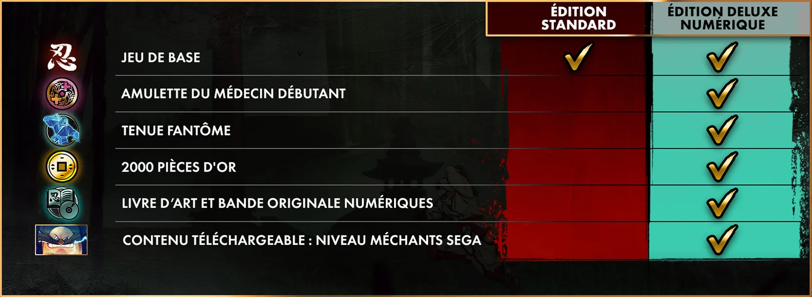 Pour le moment, l’Édition Digitale Deluxe de SHINOBI : Art of Vengeance donne déjà accès à un pack de démarrage avec le costume de fantôme, l’amulette Soins légers et de la monnaie en jeu, un artbook et la bande originale au format numérique.