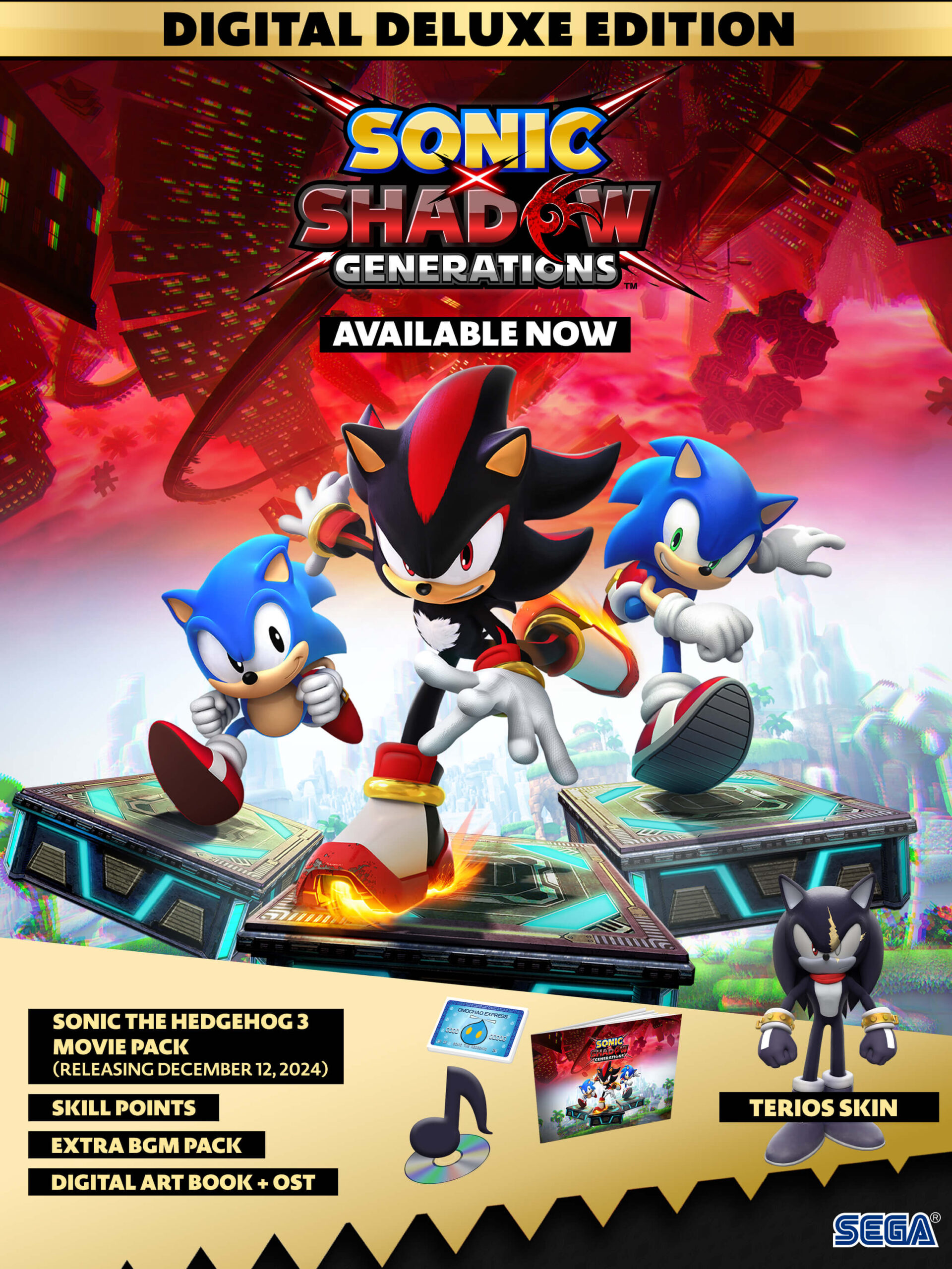 Pour toute précommande de n’importe quelle édition, SEGA offrait une apparence inspirée de Sonic Adventure pour Sonic moderne. Concernant l’édition Digital Deluxe, elle comporte le Season Pass, donnant accès à une apparence et un niveau bonus pour Shadow qui se base sur le Pack Sonic 3, le film, dont la sortie est prévue pour le 13 décembre sur Switch, une apparence de Terios inspirée du Shadow original, un pack de musiques bonus d’anciens épisodes, un artbook et une sélection de musiques en téléchargement et des points de compétence pour le jeu de base Sonic Generations. De plus, en exclusivité pour les versions PS4 et PS5, SEGA offre des animations du prologue en version longue avec des scènes coupées qui ne figurent pas dans le jeu.