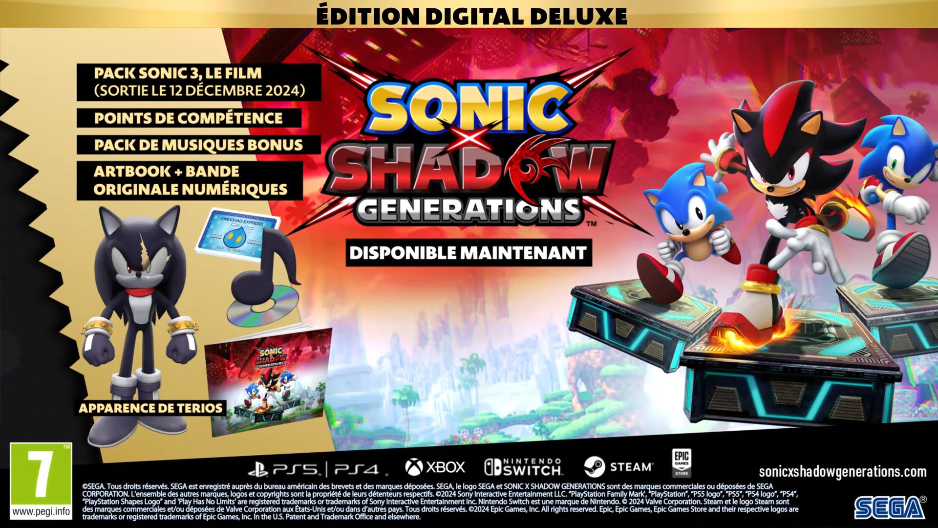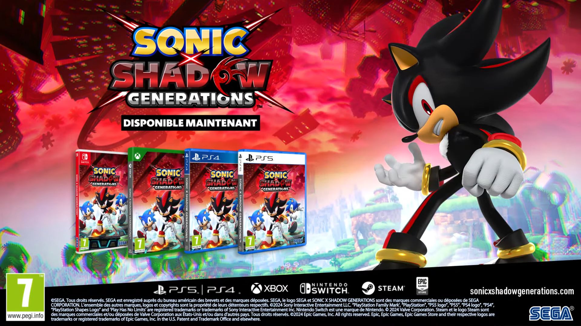 Il vient déjà de dépasser le million d’exemplaires vendus dans le monde, Sonic X Shadow Generations est arrivé ce 25 octobre 2024 sur Nintendo Switch, PlayStation 4, PS5, Xbox One, Xbox Series et PC via Steam et Epic Games Store. Toujours développé par Sonic Team, ce jeu est donc un remaster de Sonic Generations, sorti à l’origine en 2011 sur PlayStation 3, Xbox 360 et PC. Une version 3DS conçue par Dimps est également sortie la même année, mais elle était différente du jeu d’origine. Au-delà du remaster qui permet de (re)découvrir le jeu avec des versions entièrement retravaillées des niveaux en 2D et 3D du jeu d’origine, des graphismes améliorés et des cinématiques revues, il y a plusieurs nouveautés, dont l’ajout de Shadow the Hedgehog en tant que personnage jouable, en plus de Classic Sonic et Modern Sonic. De plus, il est possible de l’incarner dans une toute nouvelle histoire, qui permet de retrouver d’anciens antagonistes et de découvrir des pouvoirs et capacités inédits. En plus de nos news précédentes, nous avons décidé de revenir sur toutes les autres informations, vidéos et images révélées ces derniers mois par SEGA dans ce nouvel article. Tout d’abord, voici la bande-annonce de lancement :