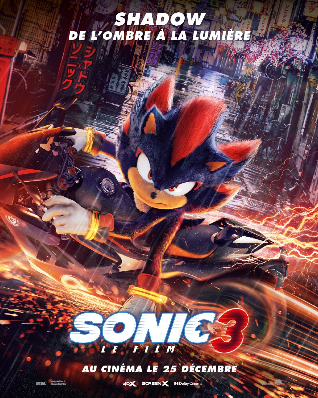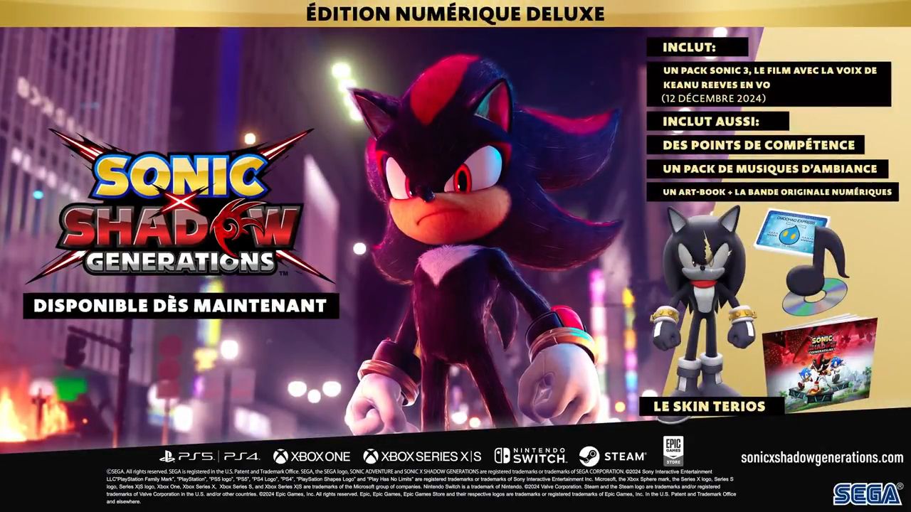 Comme promis, SEGA et Sonic Team ont sorti ce 13 décembre 2024 le DLC de Sonic X Shadow Generations qui comprend un niveau inspiré de Sonic 3, le film, dont la sortie dans les salles de cinéma françaises est fixée au 25 décembre prochain (des avant-premières auront lieu les 22 et 23 décembre). Ce DLC, ou plutôt ce « Pack Sonic 3, le film », a également la particularité de contenir une version de Shadow sous un autre look, doublée par Keanu Reeves, l’acteur doublant aussi le héros dans le film. Les cinématiques intégrées dans ce DLC sont donc exclusivement doublées en anglais, mais il y a des sous-titres en français, anglais, italien, allemand, espagnol, japonais, coréen, polonais, portugais du Brésil, russe, chinois (simplifié et traditionnel) et thaï. Dans le jeu de base, les voix sont en français, anglais, italien, allemand, espagnol et japonais. Dans le DLC, Shadow est transporté dans une dimension inconnue, où il devra explorer les rues d’un Shibuya contemporain pour vaincre les forces du GUN. À noter que cette version de Shadow est uniquement disponible dans les niveaux exclusifs au DLC. Le Pack Sonic 3, le film coûte séparément 5,99 €. Il est également également inclus dans l’édition Digital Deluxe coûtant 59,99 € et dans le contenu exclusif à cette édition vendu séparément pour 11,99 €. Pour en savoir plus sur cette collaboration qui a été révélée dans la dernière présentation Sonic Central, une interview de Shun Nakamura, le producteur de la série, avait été publiée sur le blog officiel PlayStation.