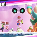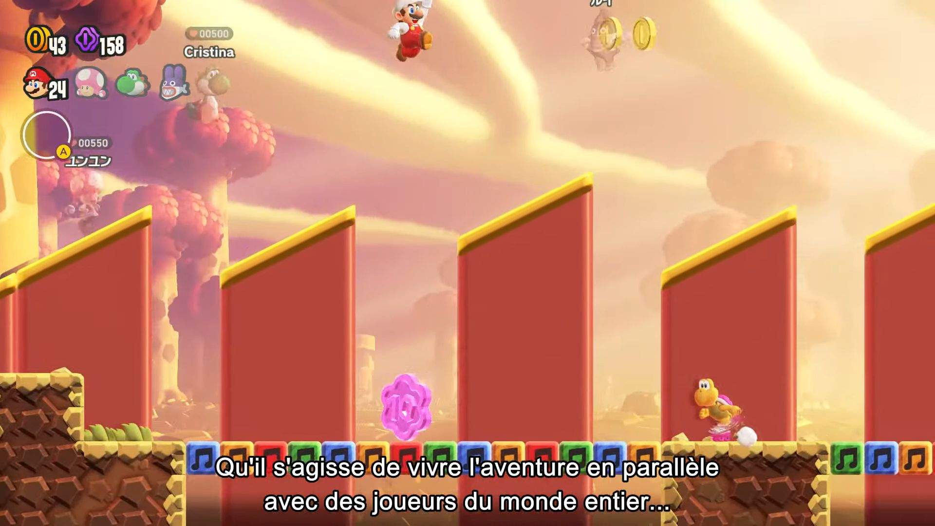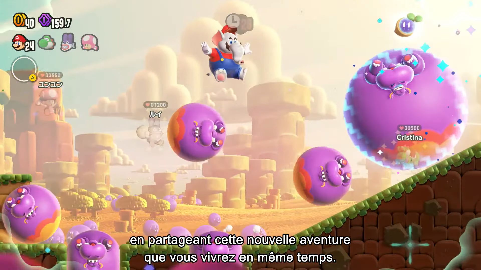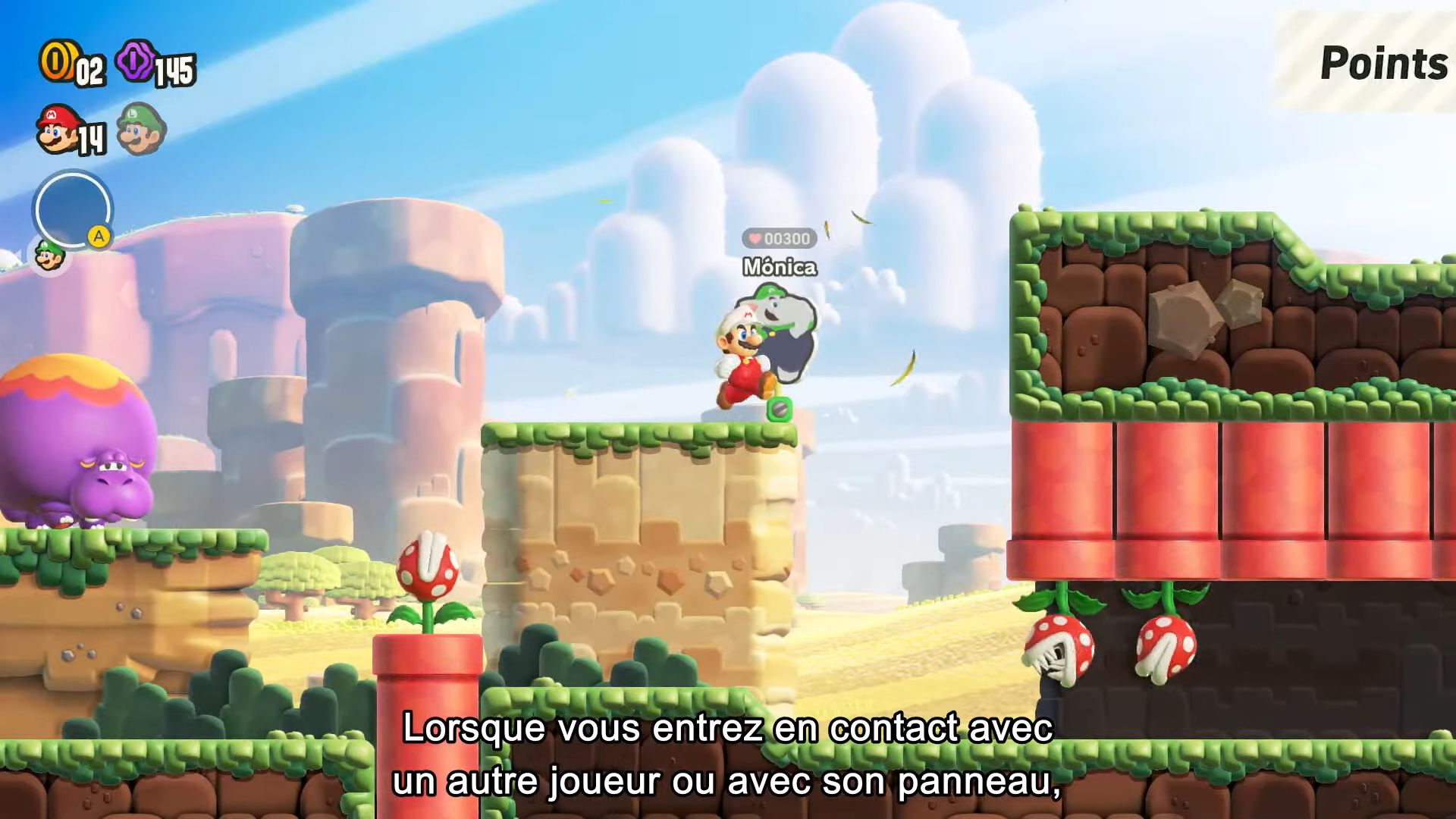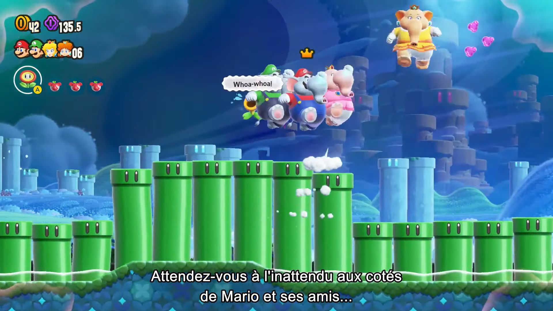 Nintendo en a profité pour révéler la liste des personnages jouables dans Super Mario Bros. Wonder. On retrouvera donc Mario, Luigi, Peach, Daisy, Toad jaune, Toad bleu, Toadette, Yoshi, Yoshi rouge, Yoshi jaune, Yoshi bleu ciel et Carottin. Tous se jouent de la même façon et il sera possible d’alterner entre eux. Cependant, Yoshi et Carottin sont immunisés aux dégâts, ce qui permettra donc de jouer de manière plus détendue. Toutefois, ils perdront tout de même une vie s’ils font une mauvaise chute par exemple. Les Yoshis ont aussi la capacité de planer, de gober des objets et de les recracher sur les ennemis.