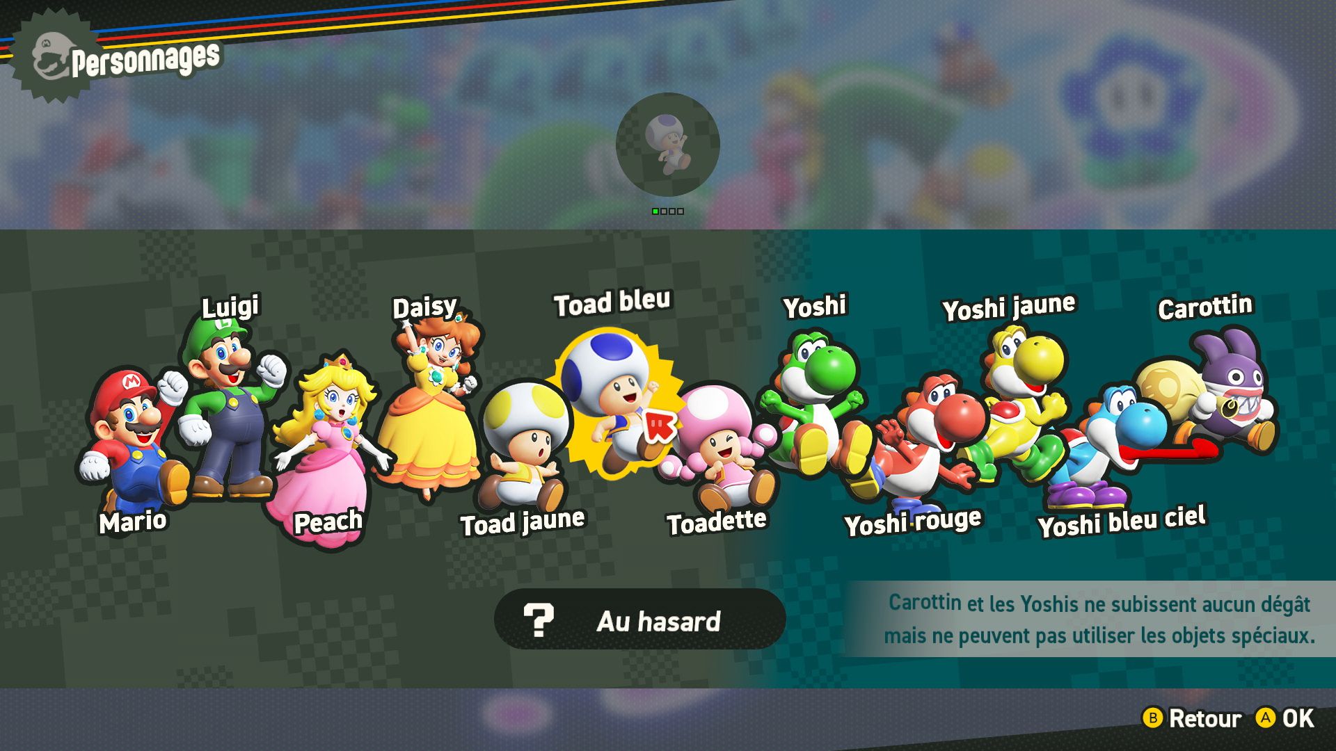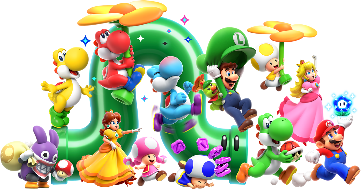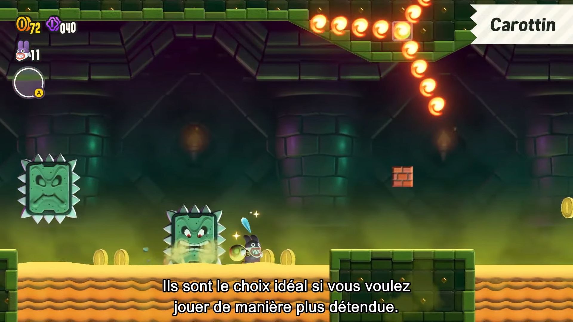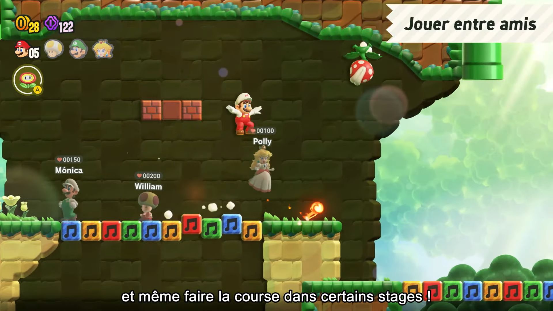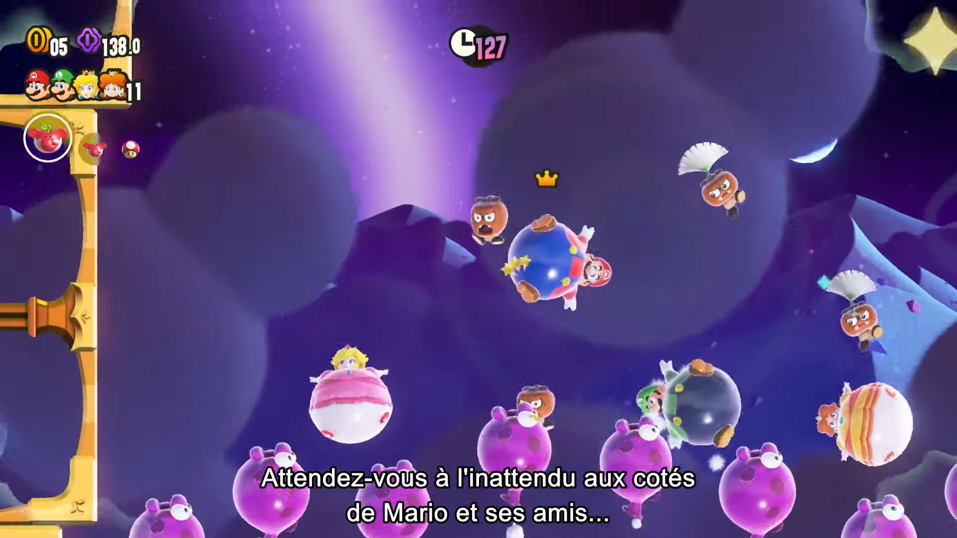 Nintendo en a profité pour révéler la liste des personnages jouables dans Super Mario Bros. Wonder. On retrouvera donc Mario, Luigi, Peach, Daisy, Toad jaune, Toad bleu, Toadette, Yoshi, Yoshi rouge, Yoshi jaune, Yoshi bleu ciel et Carottin. Tous se jouent de la même façon et il sera possible d’alterner entre eux. Cependant, Yoshi et Carottin sont immunisés aux dégâts, ce qui permettra donc de jouer de manière plus détendue. Toutefois, ils perdront tout de même une vie s’ils font une mauvaise chute par exemple. Les Yoshis ont aussi la capacité de planer, de gober des objets et de les recracher sur les ennemis.