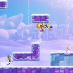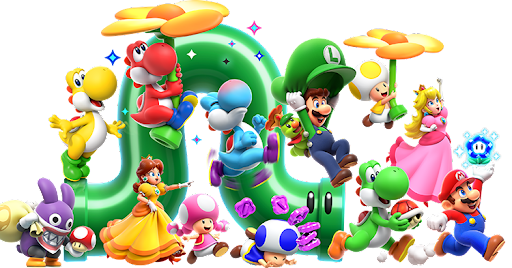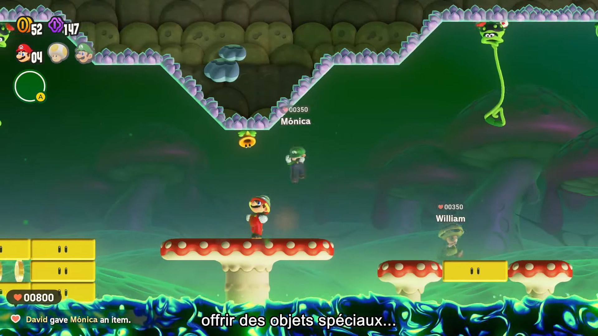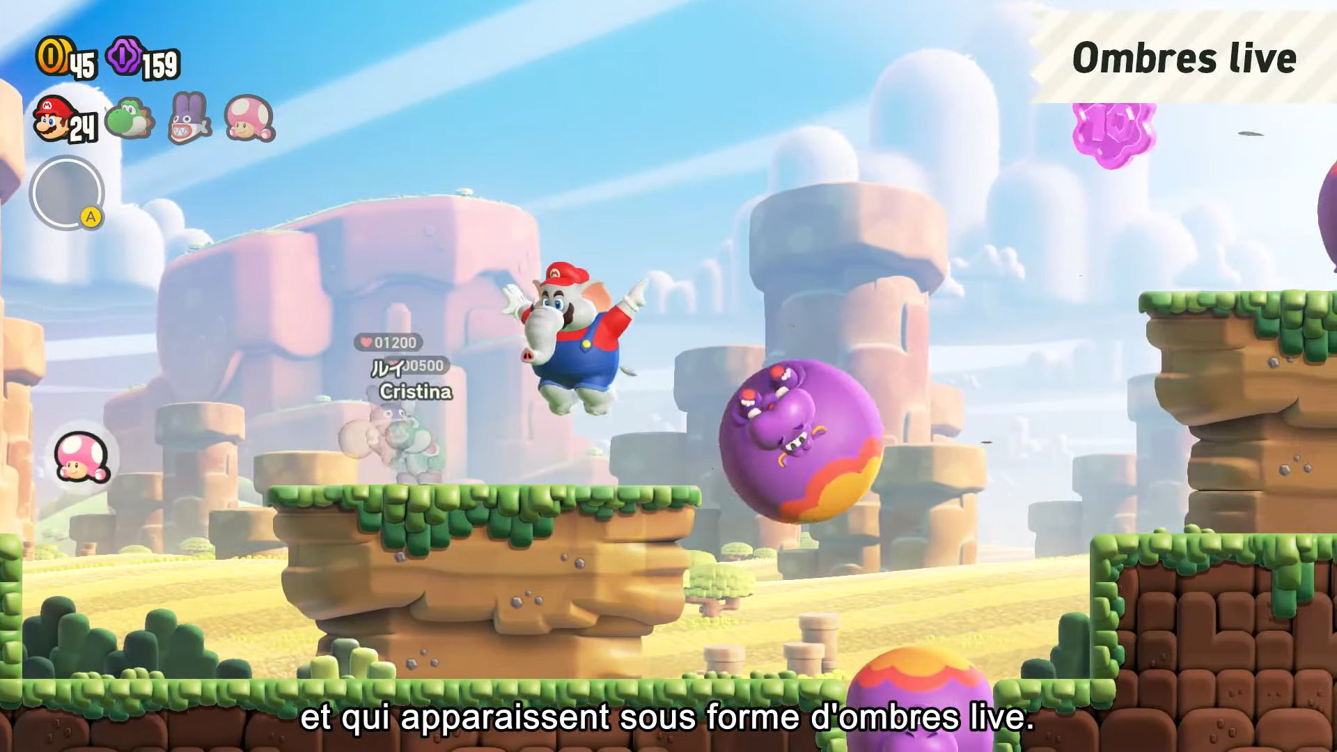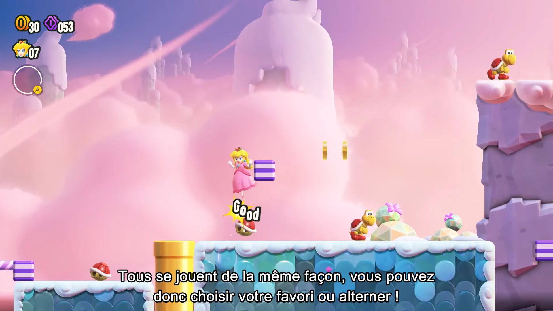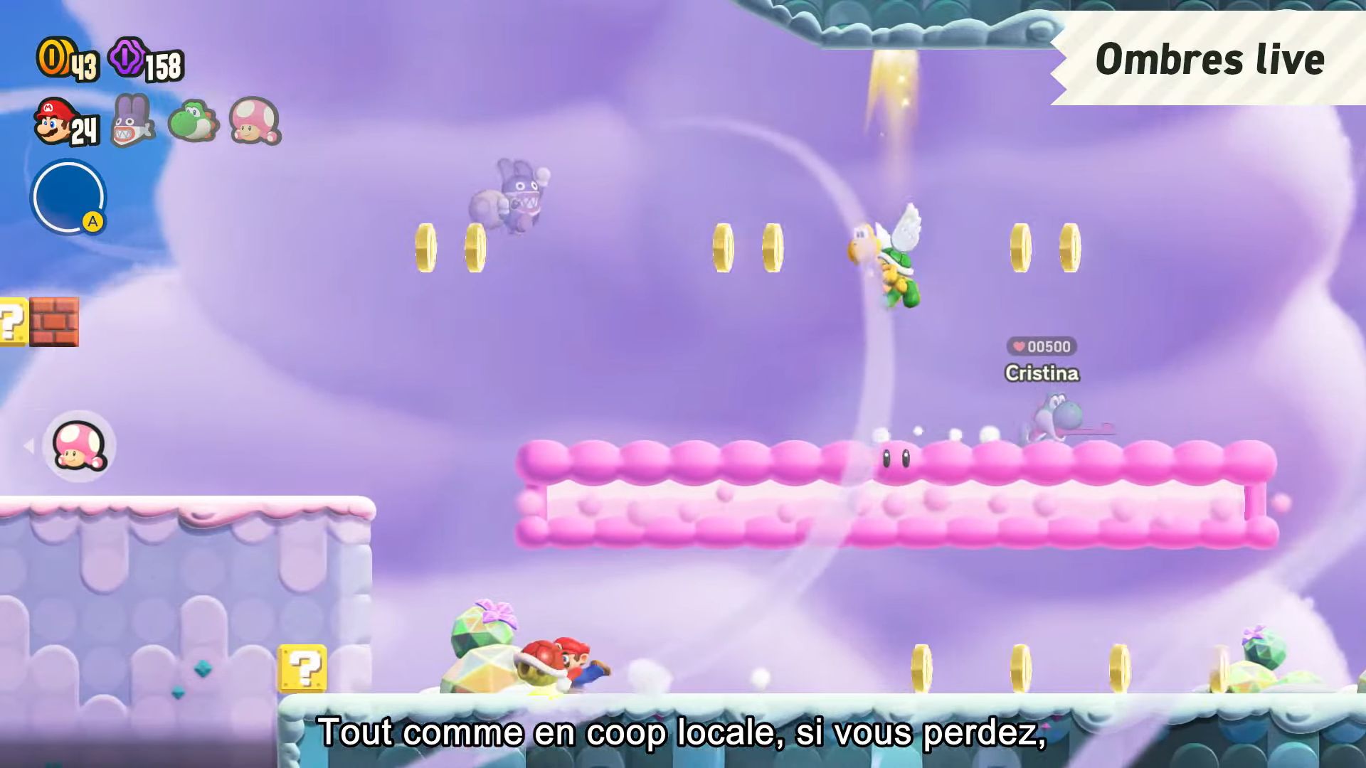 Nintendo en a profité pour révéler la liste des personnages jouables dans Super Mario Bros. Wonder. On retrouvera donc Mario, Luigi, Peach, Daisy, Toad jaune, Toad bleu, Toadette, Yoshi, Yoshi rouge, Yoshi jaune, Yoshi bleu ciel et Carottin. Tous se jouent de la même façon et il sera possible d’alterner entre eux. Cependant, Yoshi et Carottin sont immunisés aux dégâts, ce qui permettra donc de jouer de manière plus détendue. Toutefois, ils perdront tout de même une vie s’ils font une mauvaise chute par exemple. Les Yoshis ont aussi la capacité de planer, de gober des objets et de les recracher sur les ennemis.