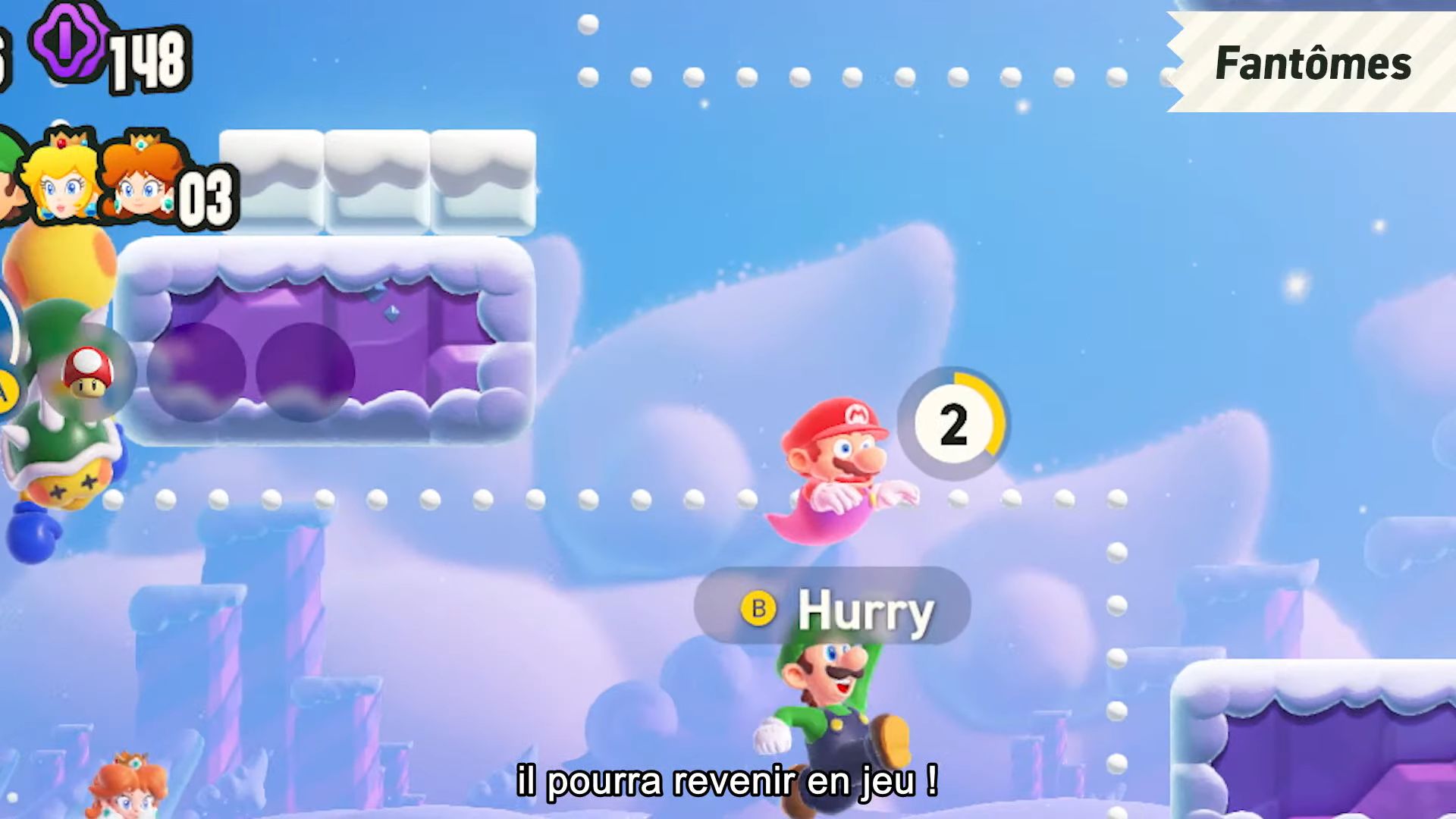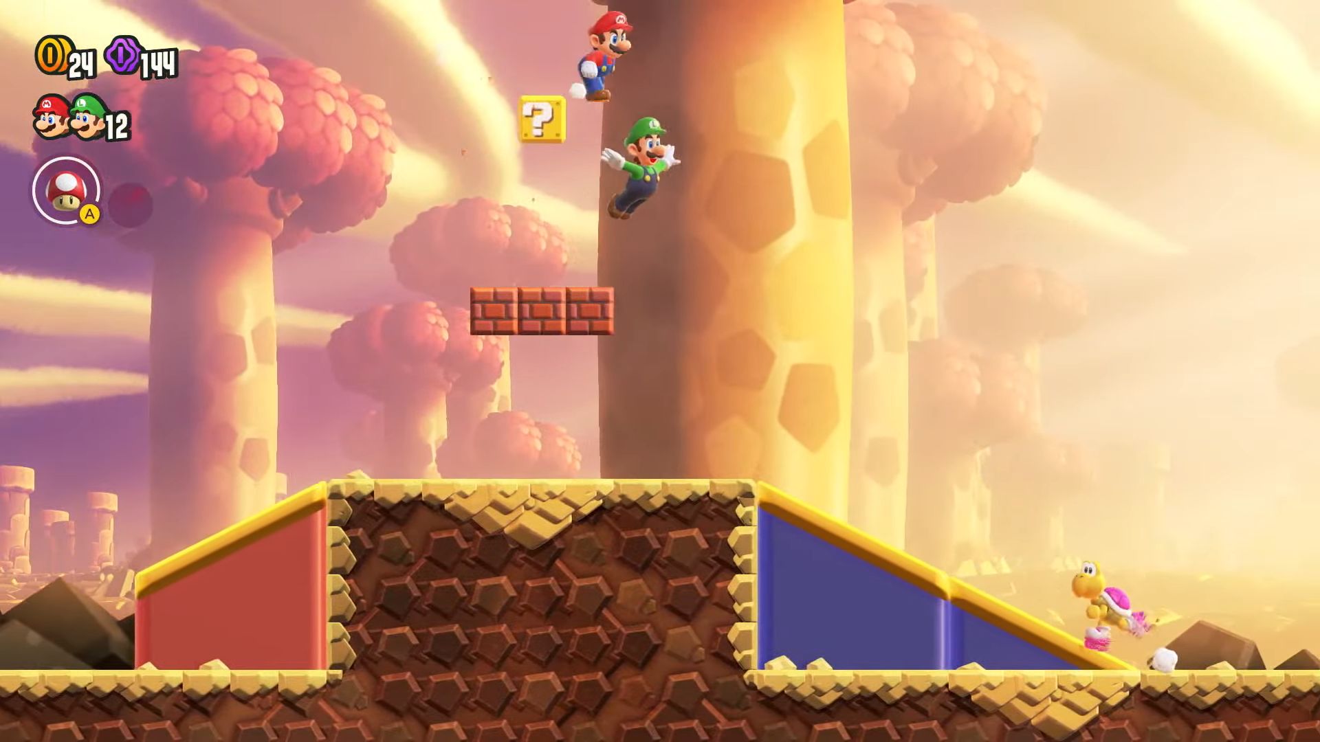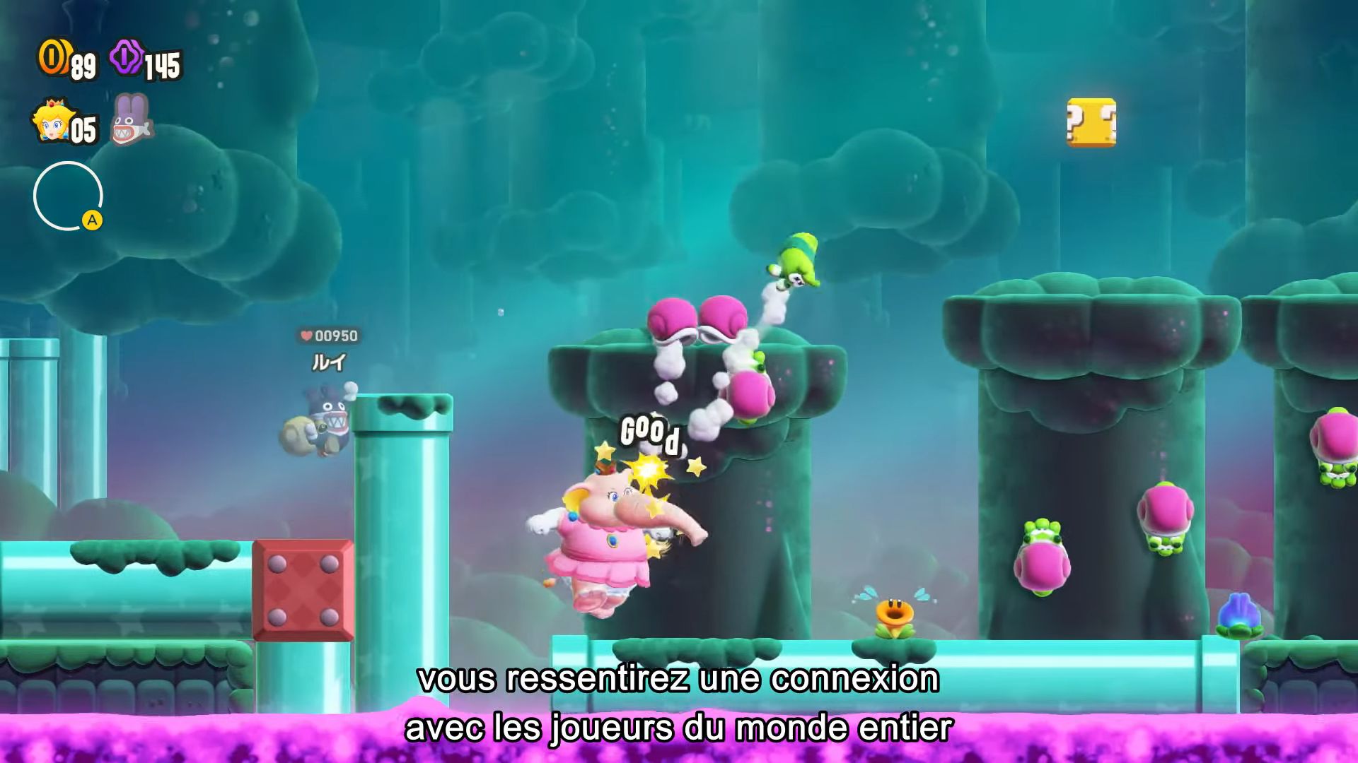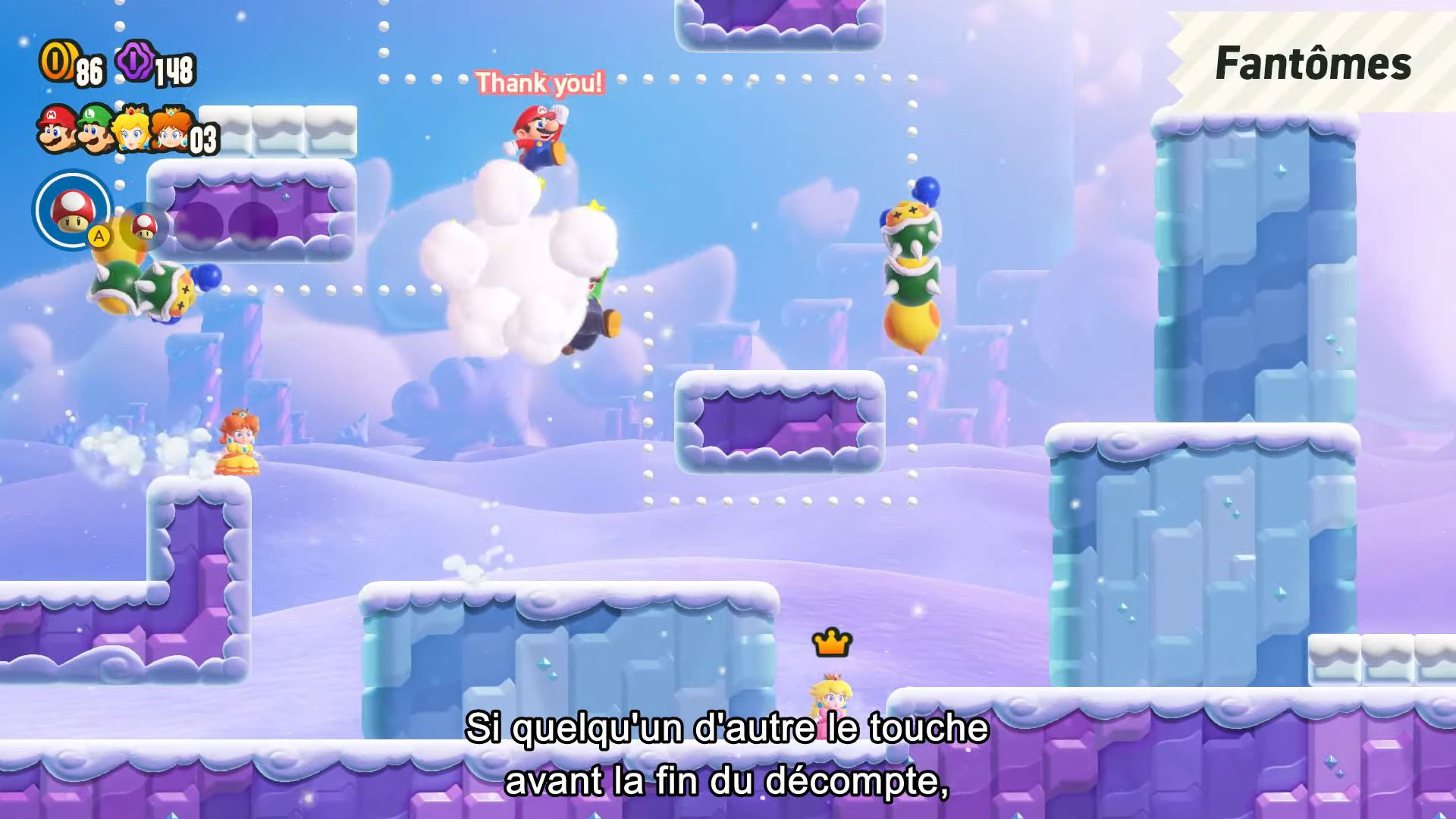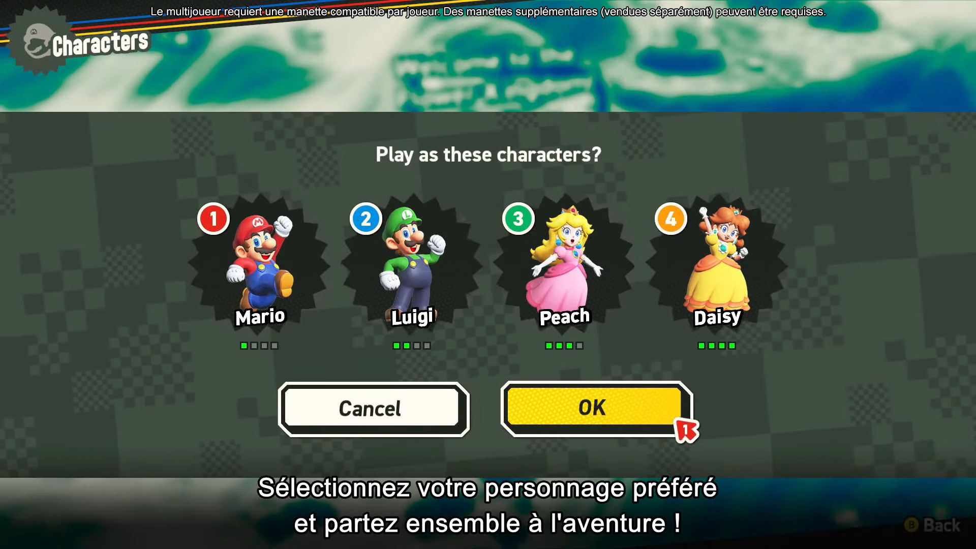Nintendo en a profité pour révéler la liste des personnages jouables dans Super Mario Bros. Wonder. On retrouvera donc Mario, Luigi, Peach, Daisy, Toad jaune, Toad bleu, Toadette, Yoshi, Yoshi rouge, Yoshi jaune, Yoshi bleu ciel et Carottin. Tous se jouent de la même façon et il sera possible d’alterner entre eux. Cependant, Yoshi et Carottin sont immunisés aux dégâts, ce qui permettra donc de jouer de manière plus détendue. Toutefois, ils perdront tout de même une vie s’ils font une mauvaise chute par exemple. Les Yoshis ont aussi la capacité de planer, de gober des objets et de les recracher sur les ennemis.
