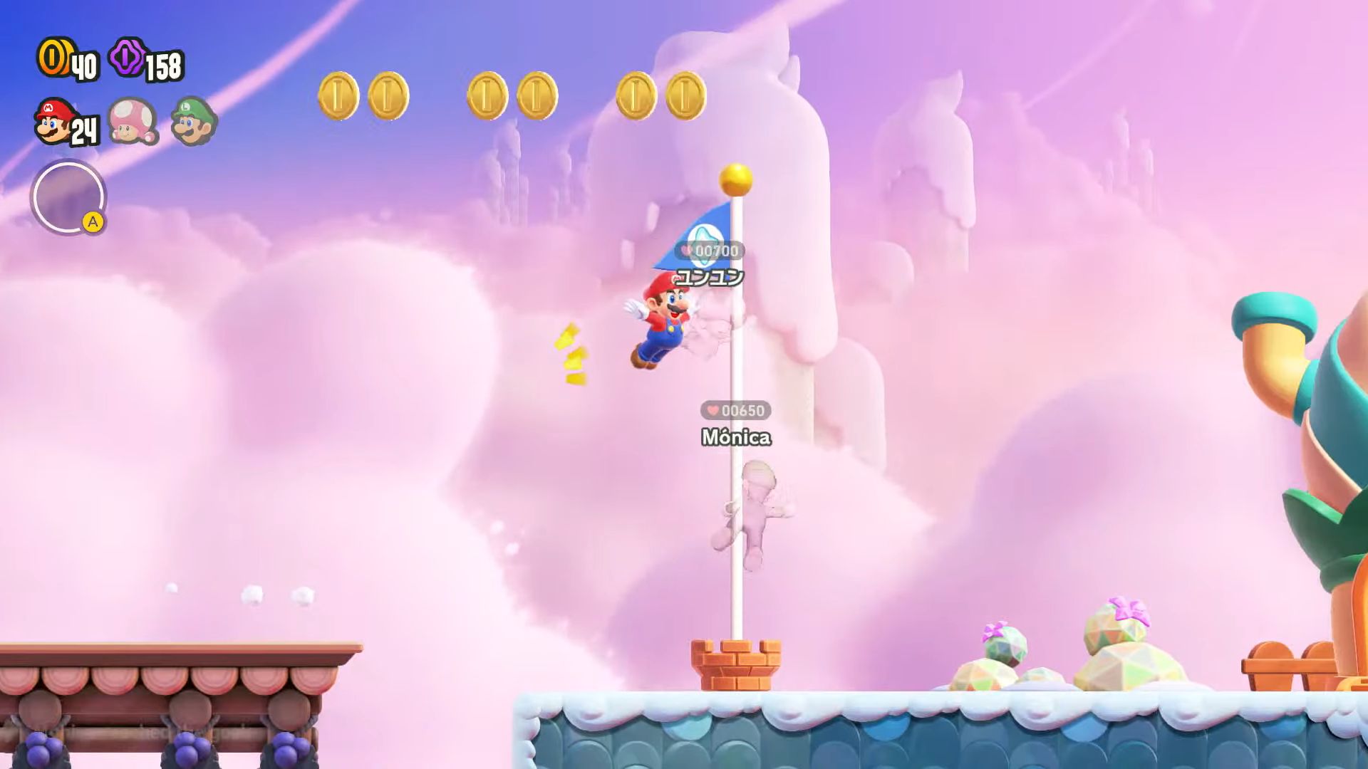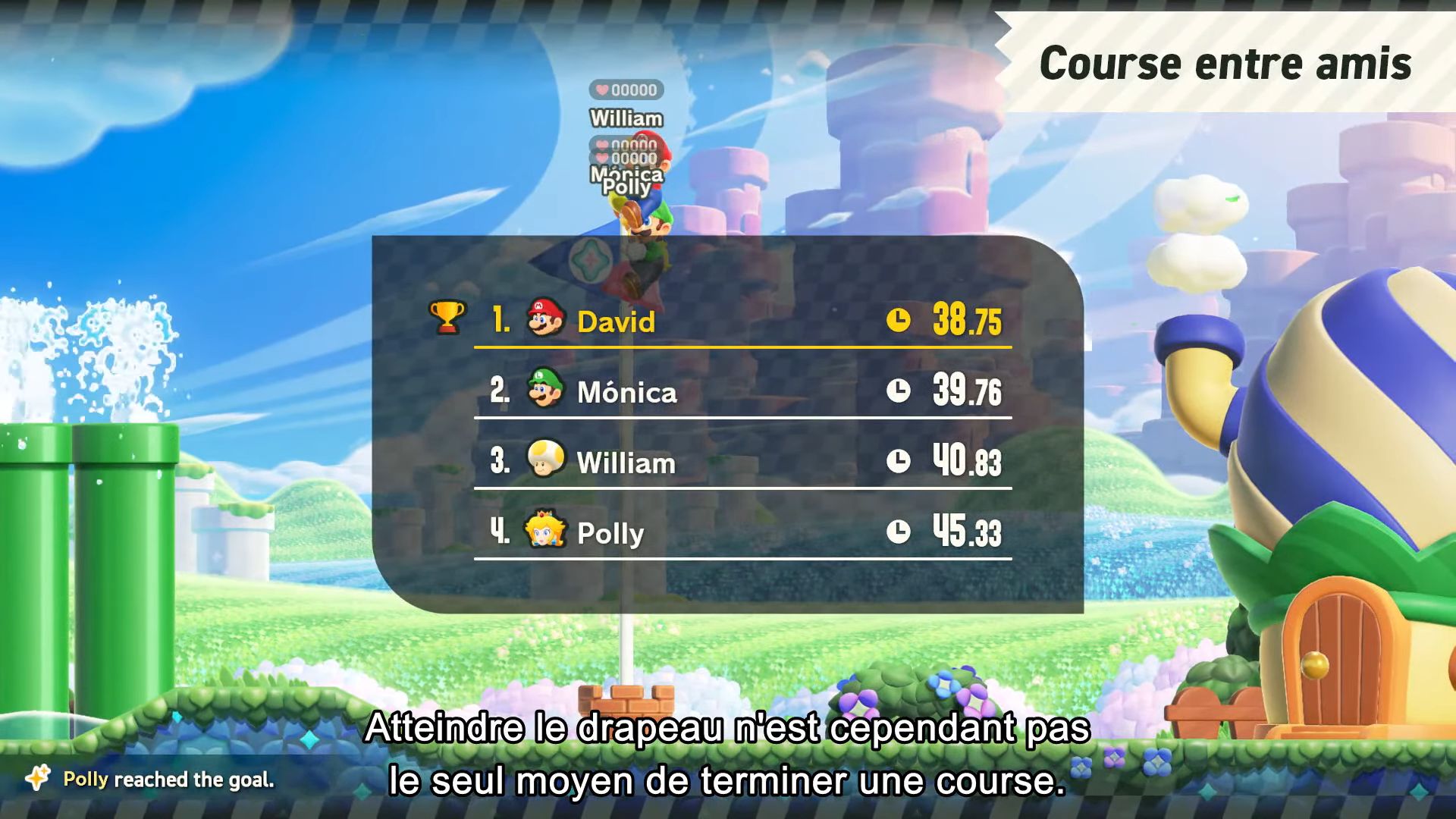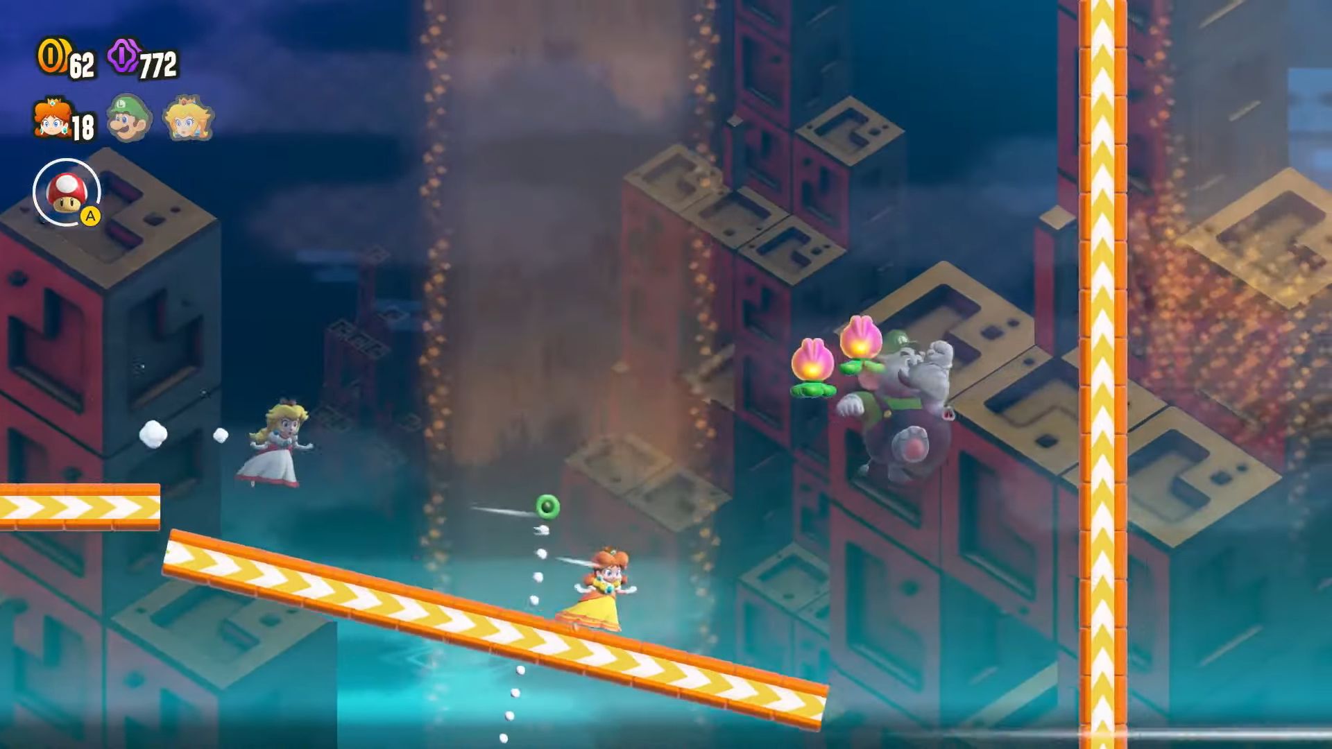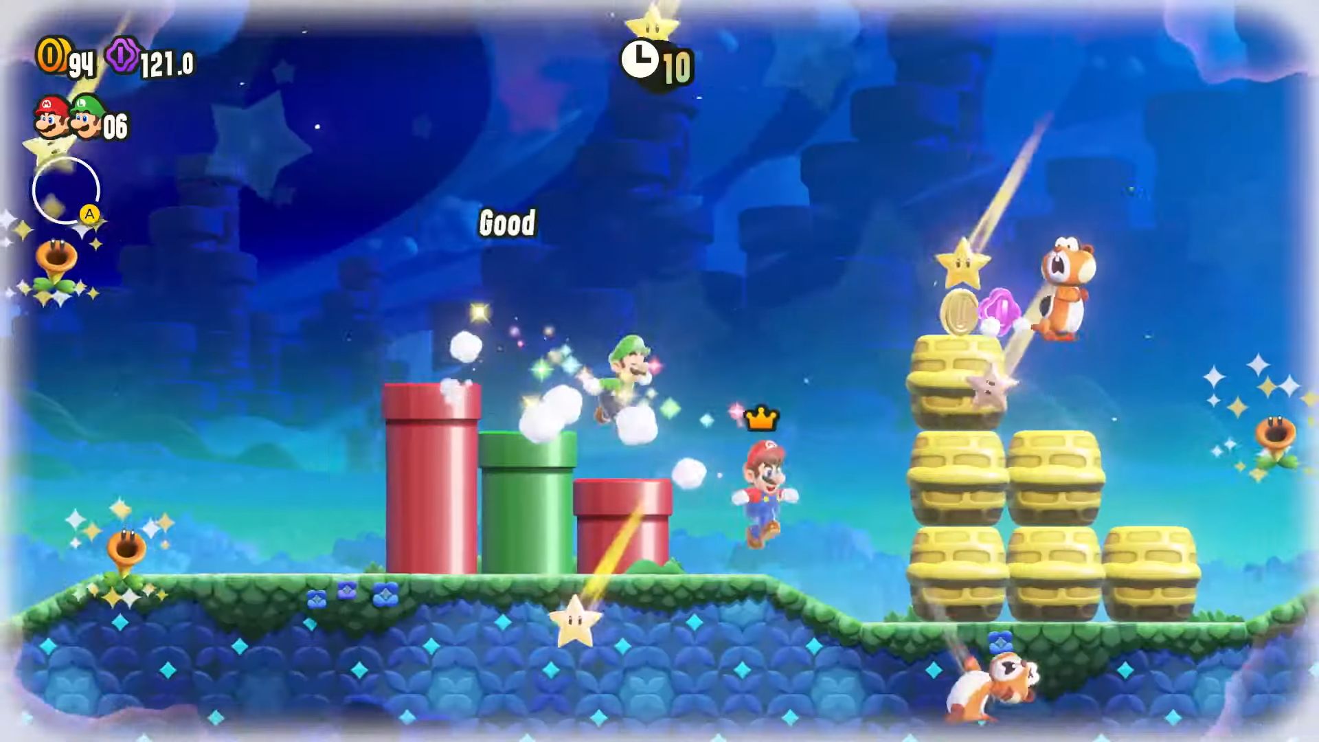 Nintendo en a profité pour révéler la liste des personnages jouables dans Super Mario Bros. Wonder. On retrouvera donc Mario, Luigi, Peach, Daisy, Toad jaune, Toad bleu, Toadette, Yoshi, Yoshi rouge, Yoshi jaune, Yoshi bleu ciel et Carottin. Tous se jouent de la même façon et il sera possible d’alterner entre eux. Cependant, Yoshi et Carottin sont immunisés aux dégâts, ce qui permettra donc de jouer de manière plus détendue. Toutefois, ils perdront tout de même une vie s’ils font une mauvaise chute par exemple. Les Yoshis ont aussi la capacité de planer, de gober des objets et de les recracher sur les ennemis.