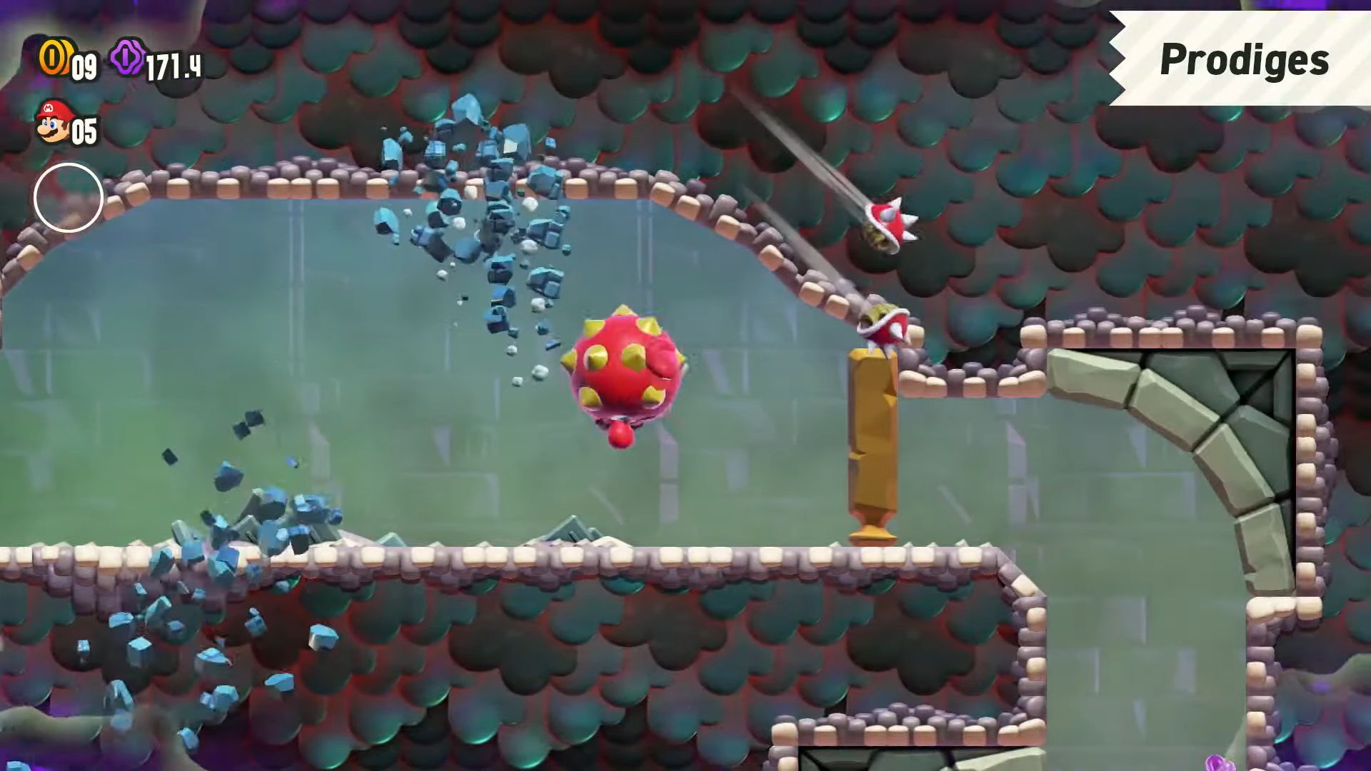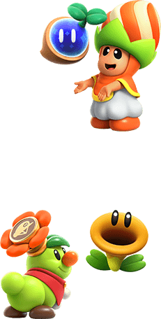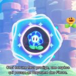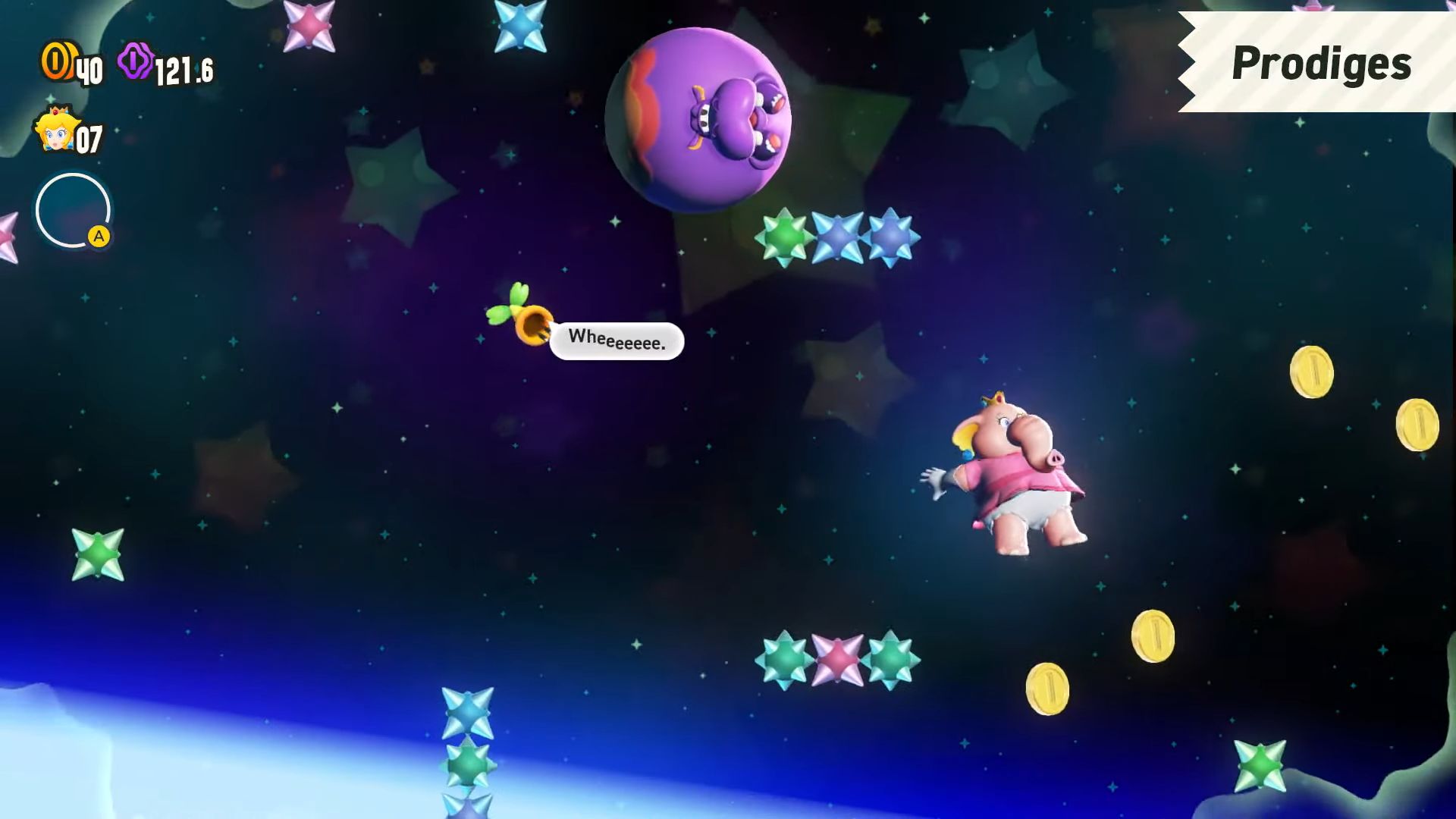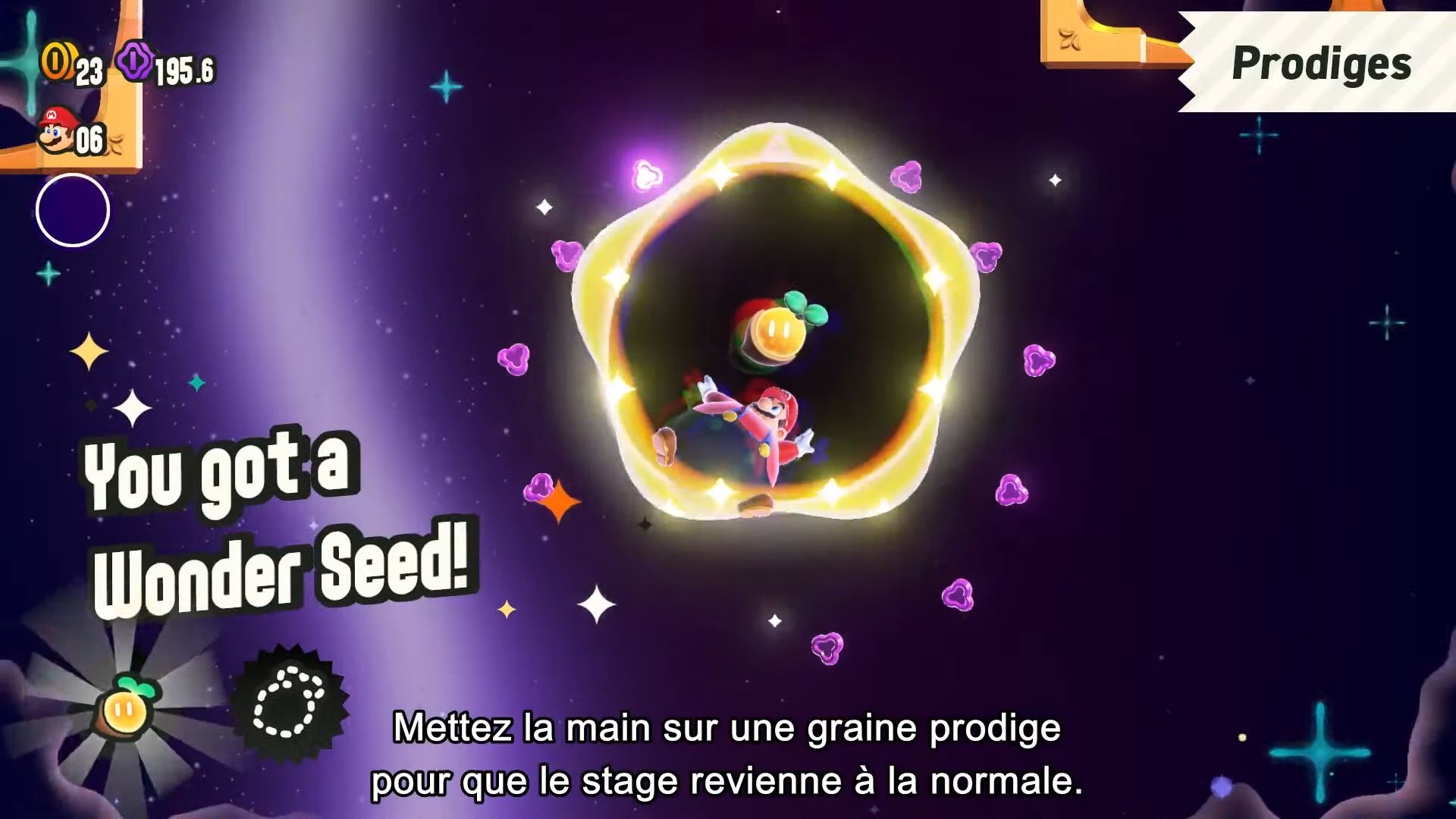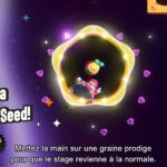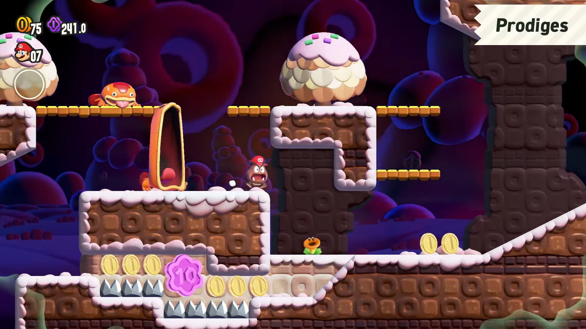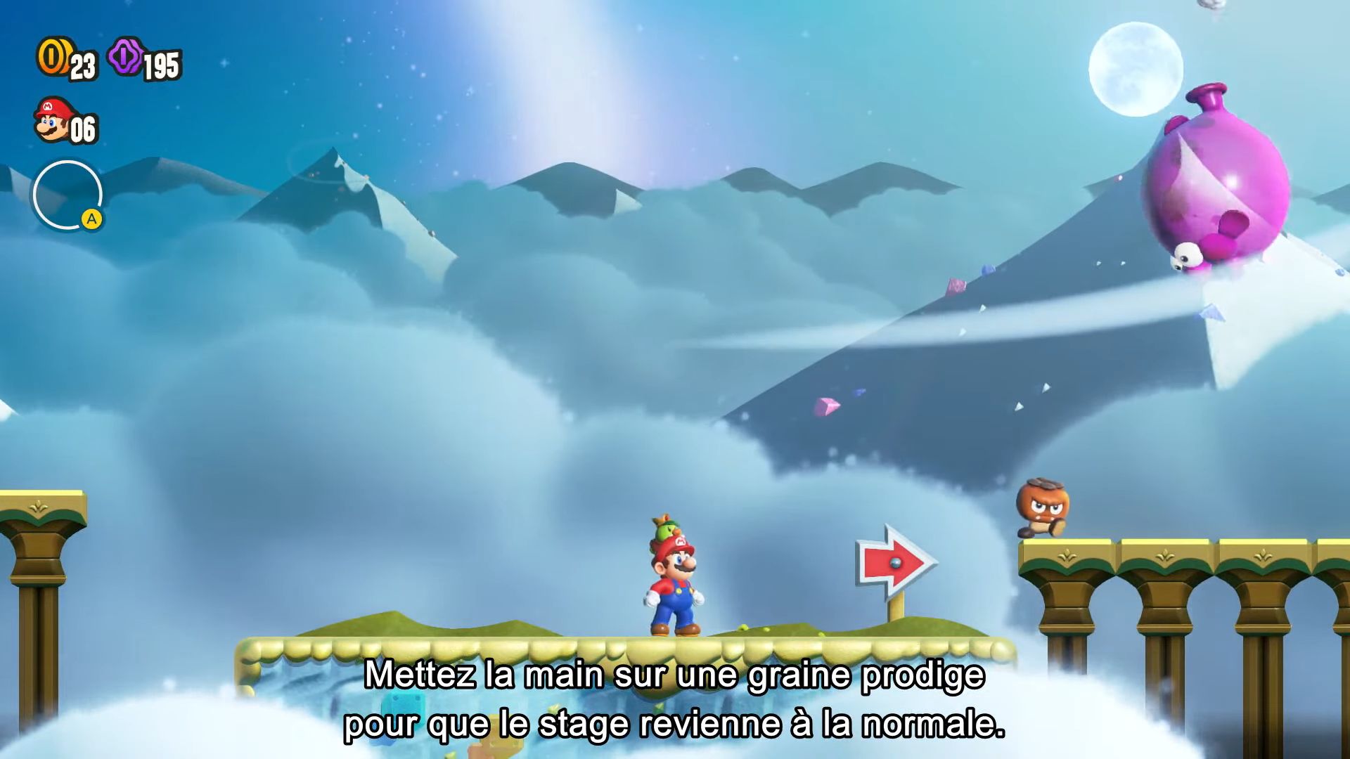 Certains prodiges peuvent même transformer notre personnage. Mario peut alors devenir un Goomba, une boule à pics, ou encore gonfler comme un ballon. Pour que le stage revienne à la normale, il suffira de mettre la main sur une graine prodige. Les graines prodiges sont aussi nécessaires pour déverrouiller certains stages. Un Poplin nous offrira également une graine prodige lorsque l’on atteindra l’arrivée d’un stage.