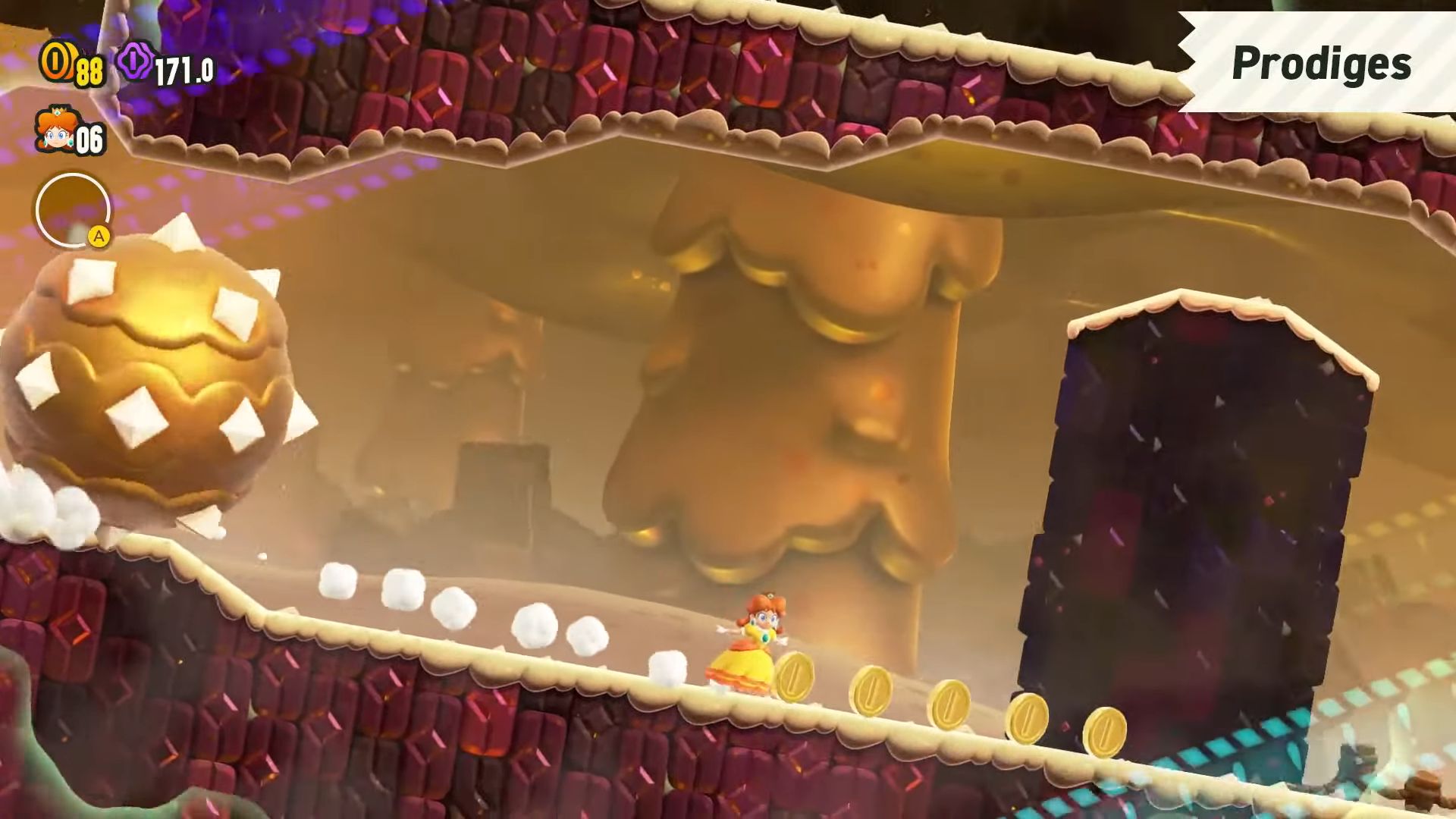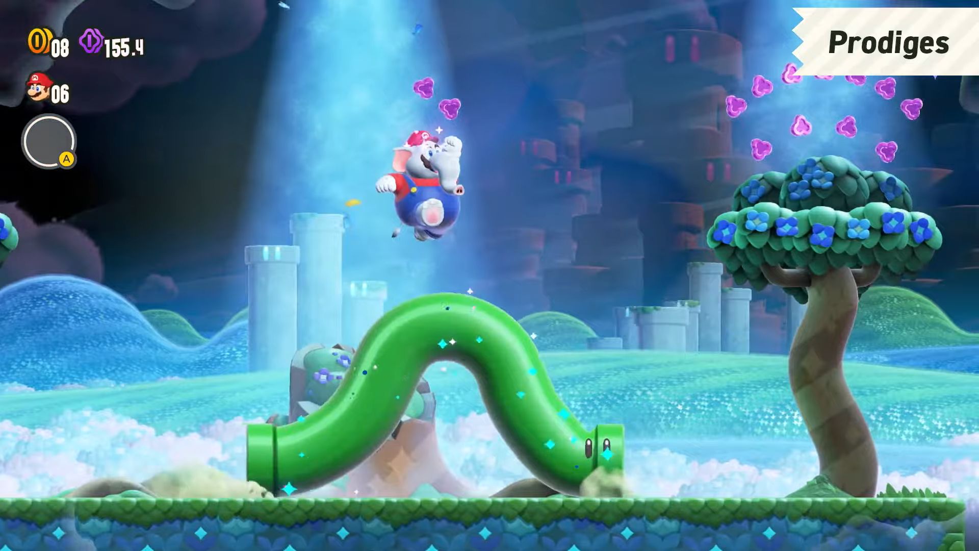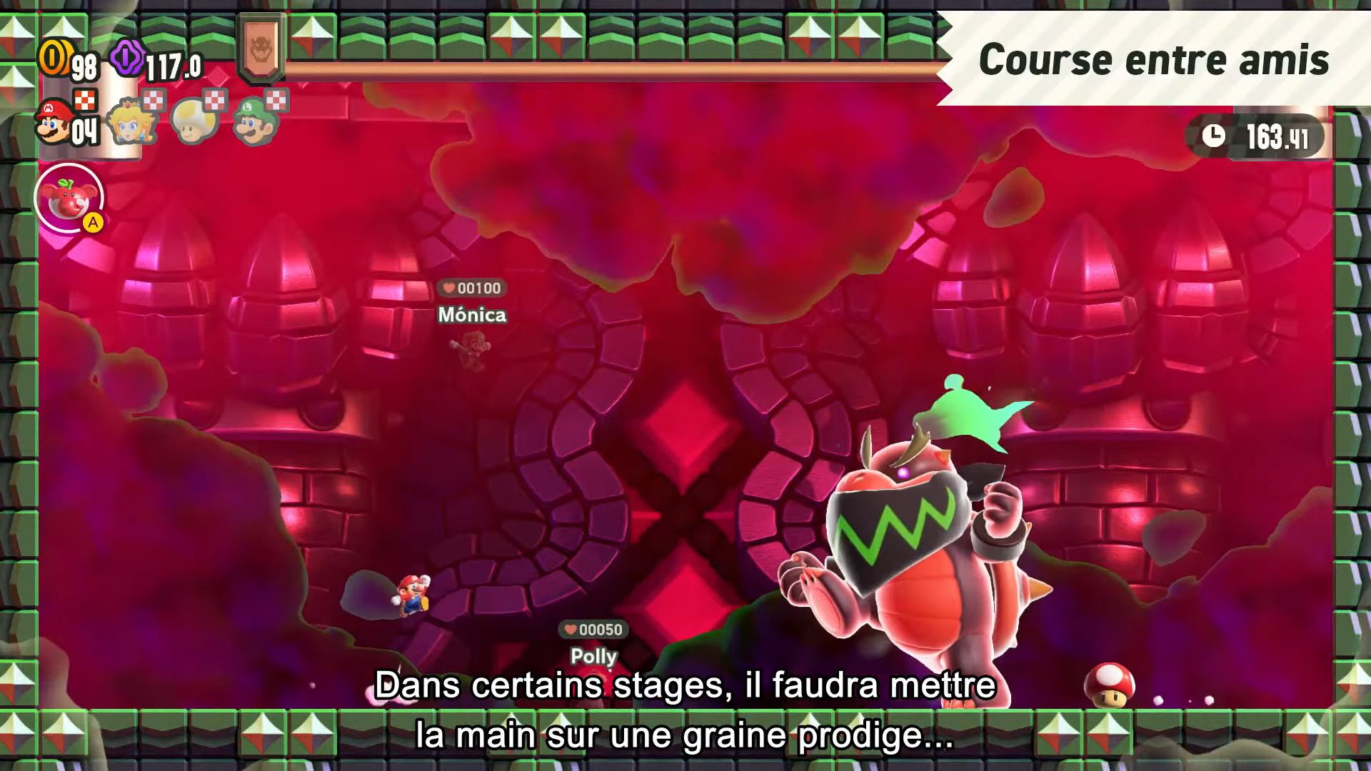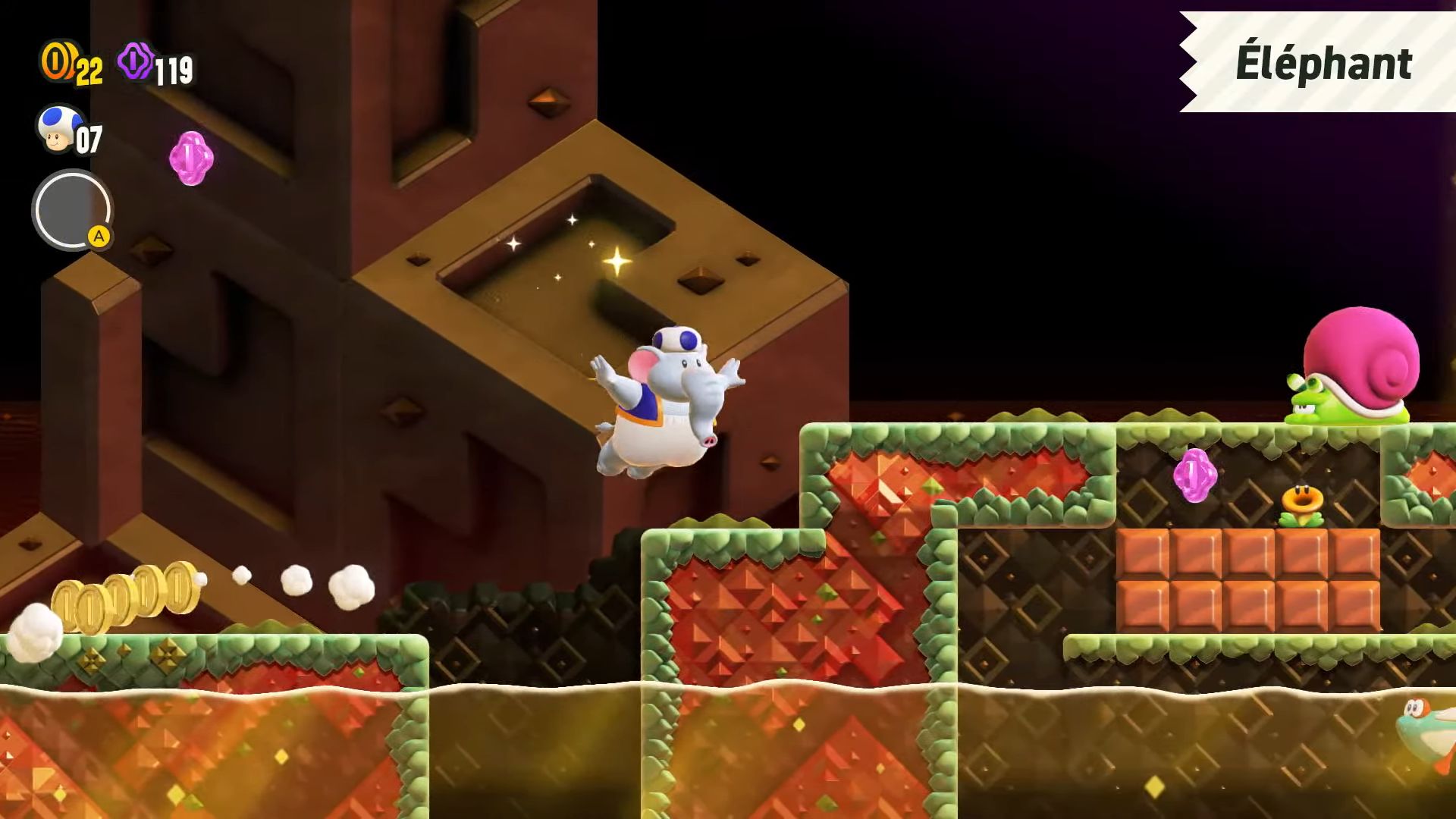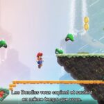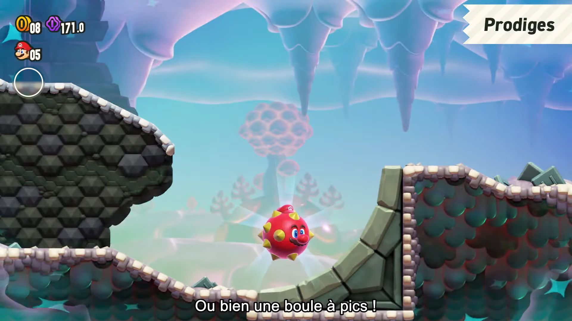 Certains prodiges peuvent même transformer notre personnage. Mario peut alors devenir un Goomba, une boule à pics, ou encore gonfler comme un ballon. Pour que le stage revienne à la normale, il suffira de mettre la main sur une graine prodige. Les graines prodiges sont aussi nécessaires pour déverrouiller certains stages. Un Poplin nous offrira également une graine prodige lorsque l’on atteindra l’arrivée d’un stage.