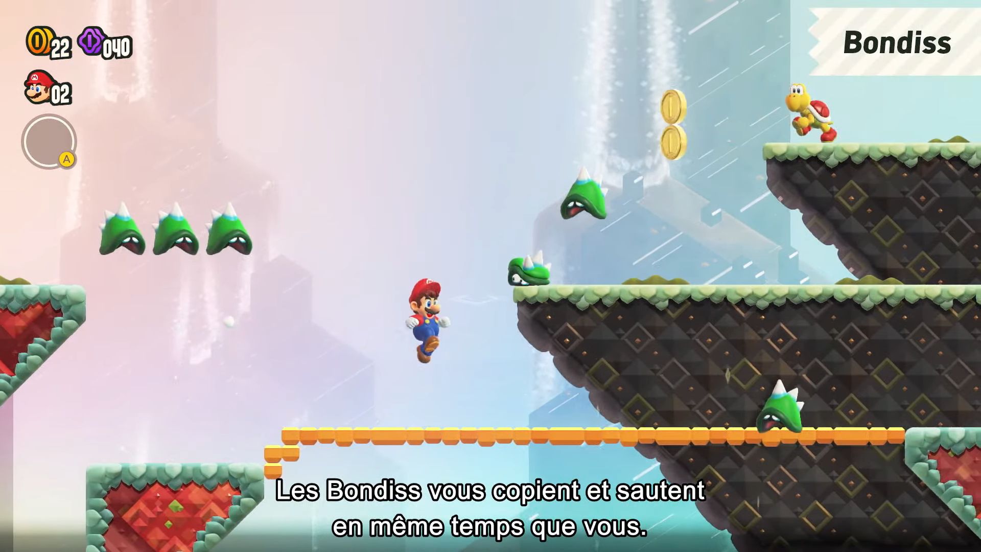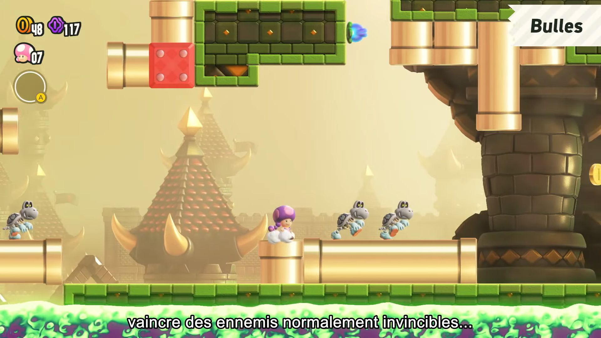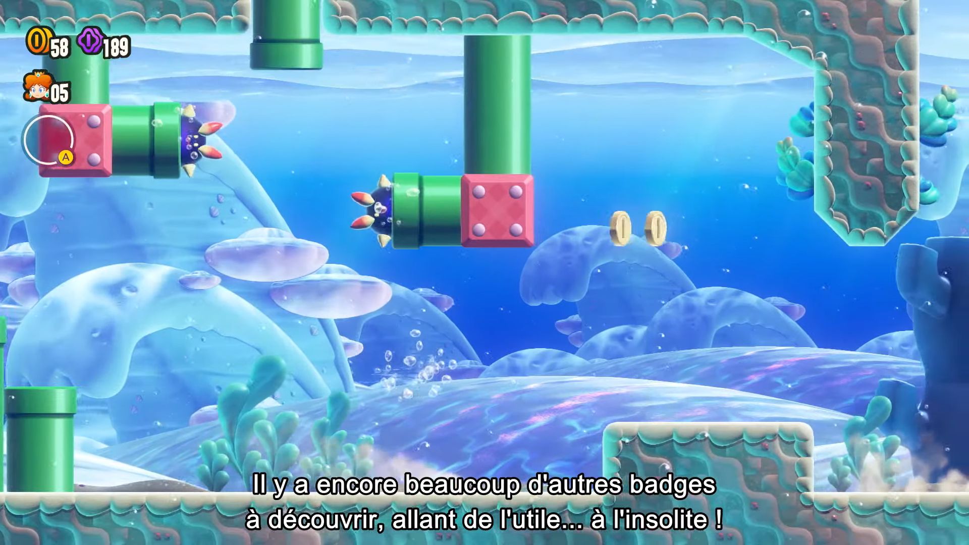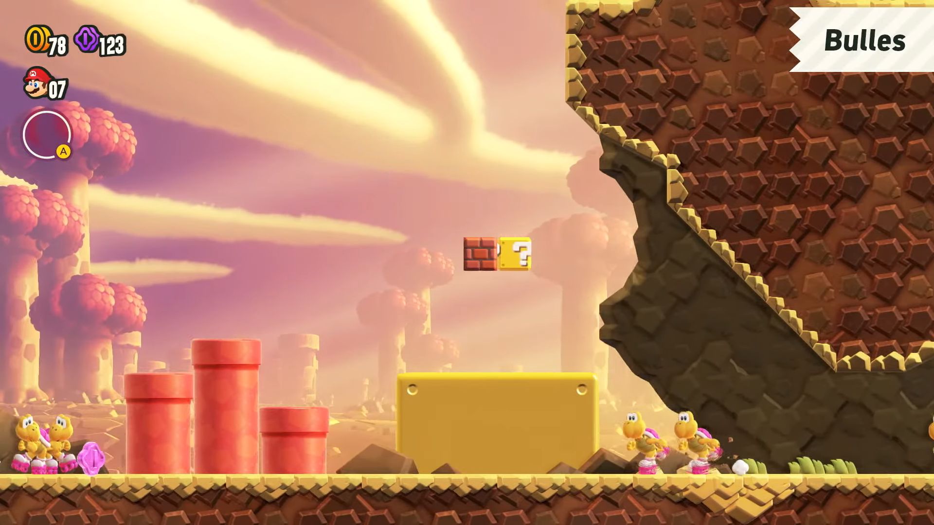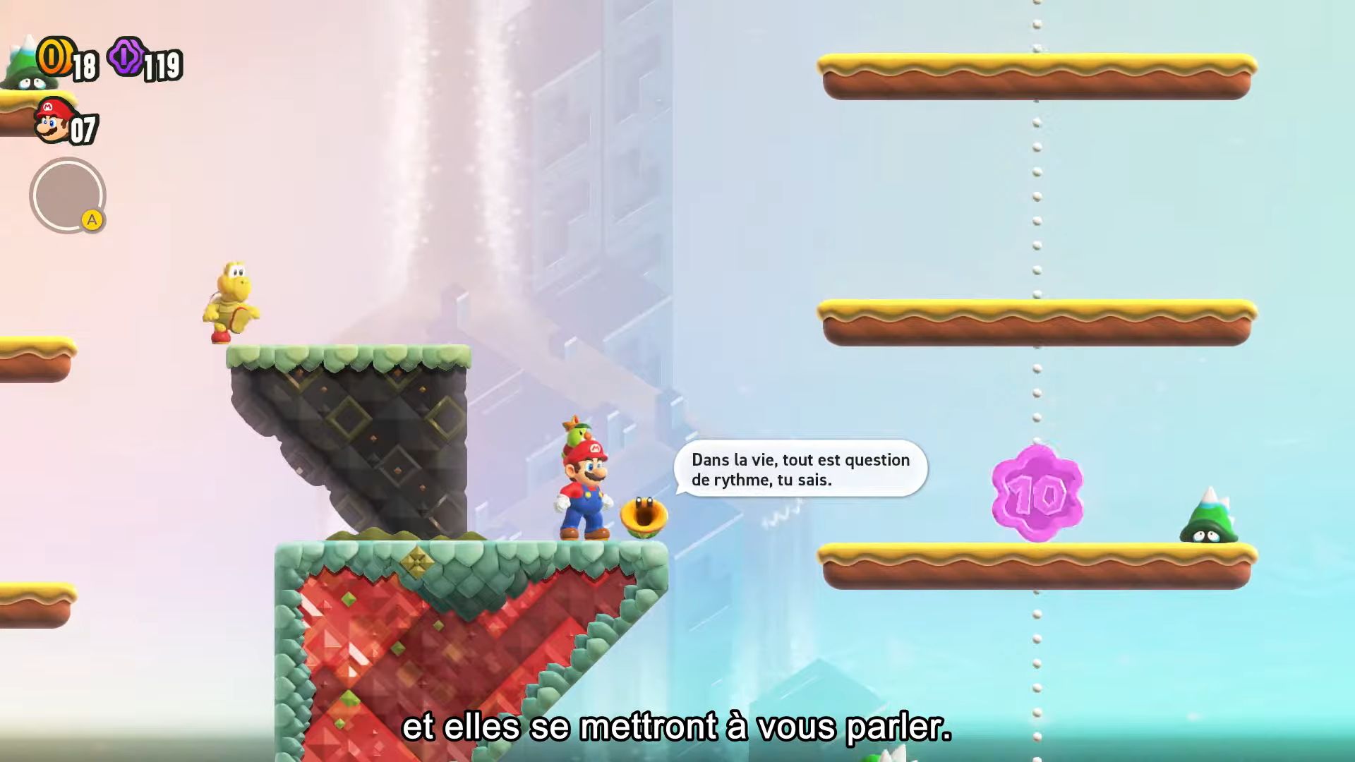 Certains prodiges peuvent même transformer notre personnage. Mario peut alors devenir un Goomba, une boule à pics, ou encore gonfler comme un ballon. Pour que le stage revienne à la normale, il suffira de mettre la main sur une graine prodige. Les graines prodiges sont aussi nécessaires pour déverrouiller certains stages. Un Poplin nous offrira également une graine prodige lorsque l’on atteindra l’arrivée d’un stage.