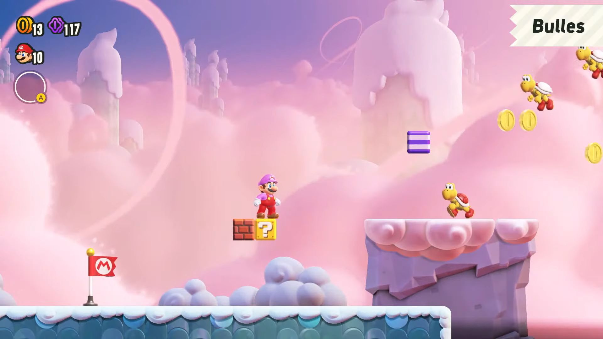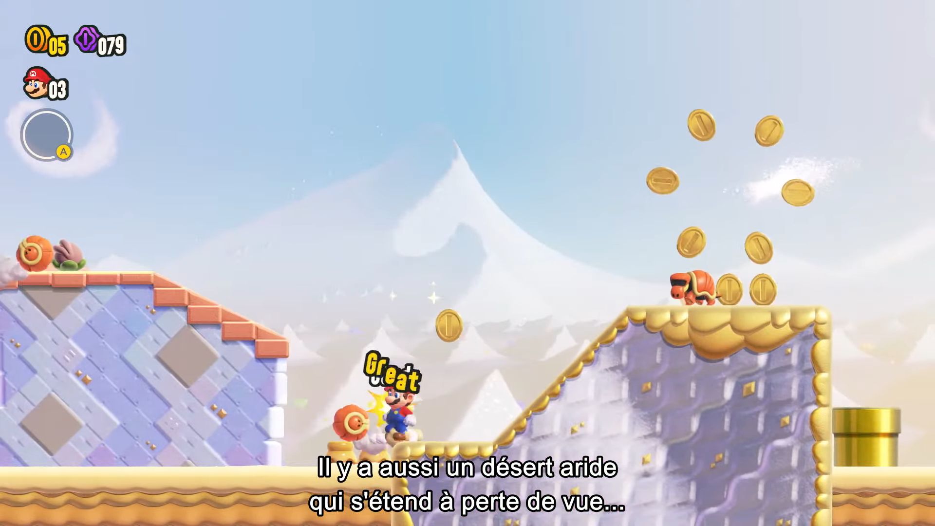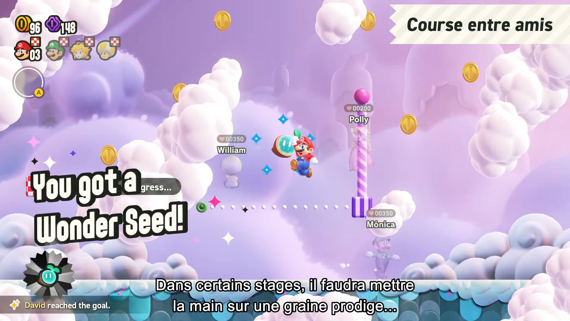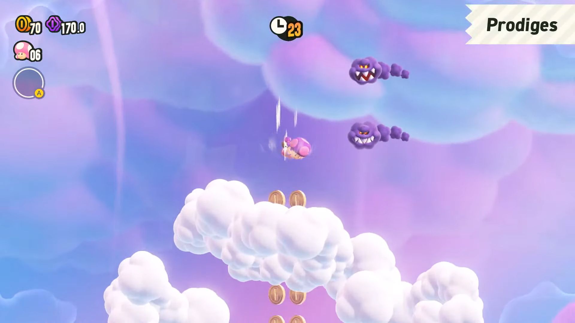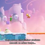 Certains prodiges peuvent même transformer notre personnage. Mario peut alors devenir un Goomba, une boule à pics, ou encore gonfler comme un ballon. Pour que le stage revienne à la normale, il suffira de mettre la main sur une graine prodige. Les graines prodiges sont aussi nécessaires pour déverrouiller certains stages. Un Poplin nous offrira également une graine prodige lorsque l’on atteindra l’arrivée d’un stage.
