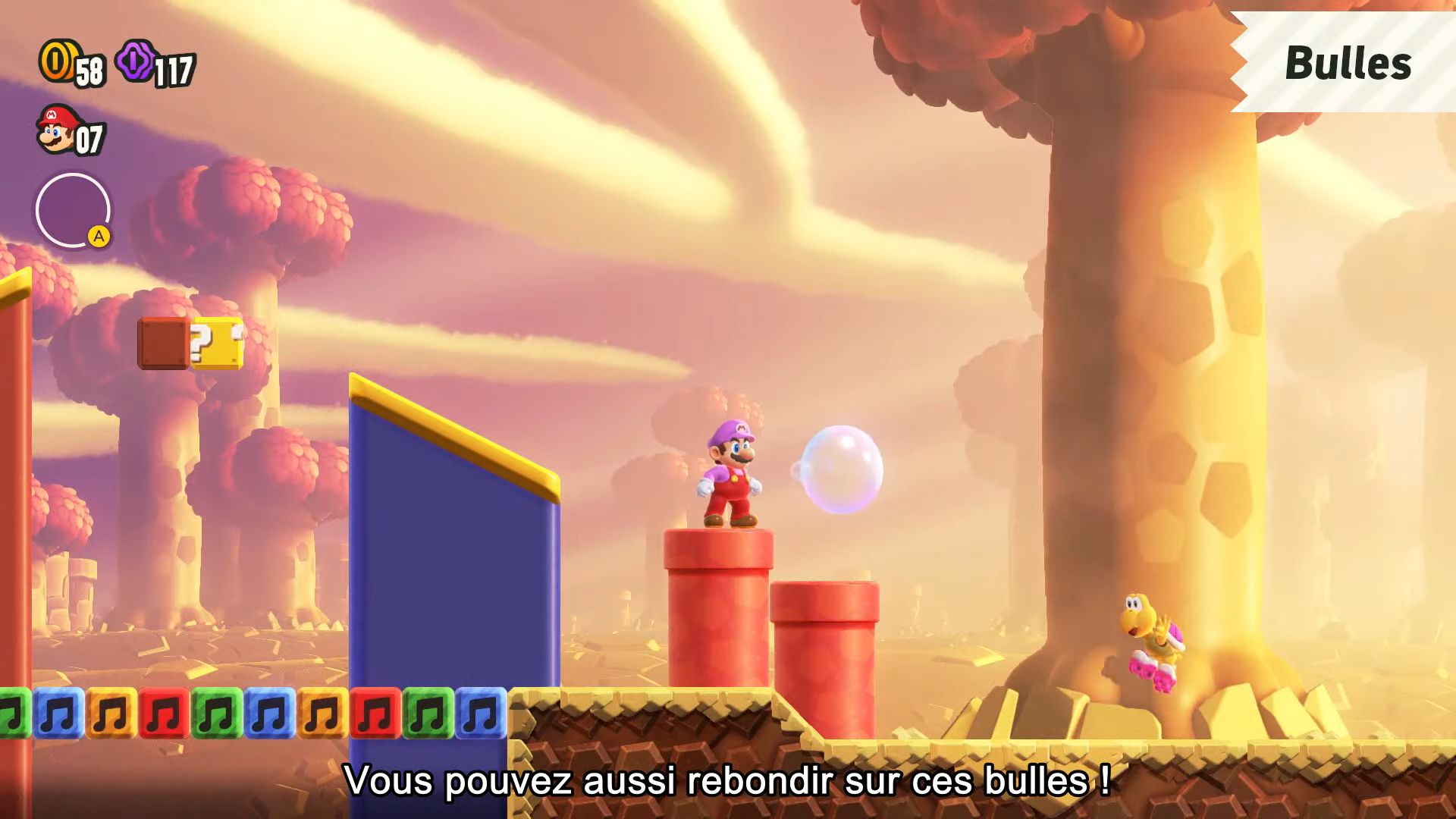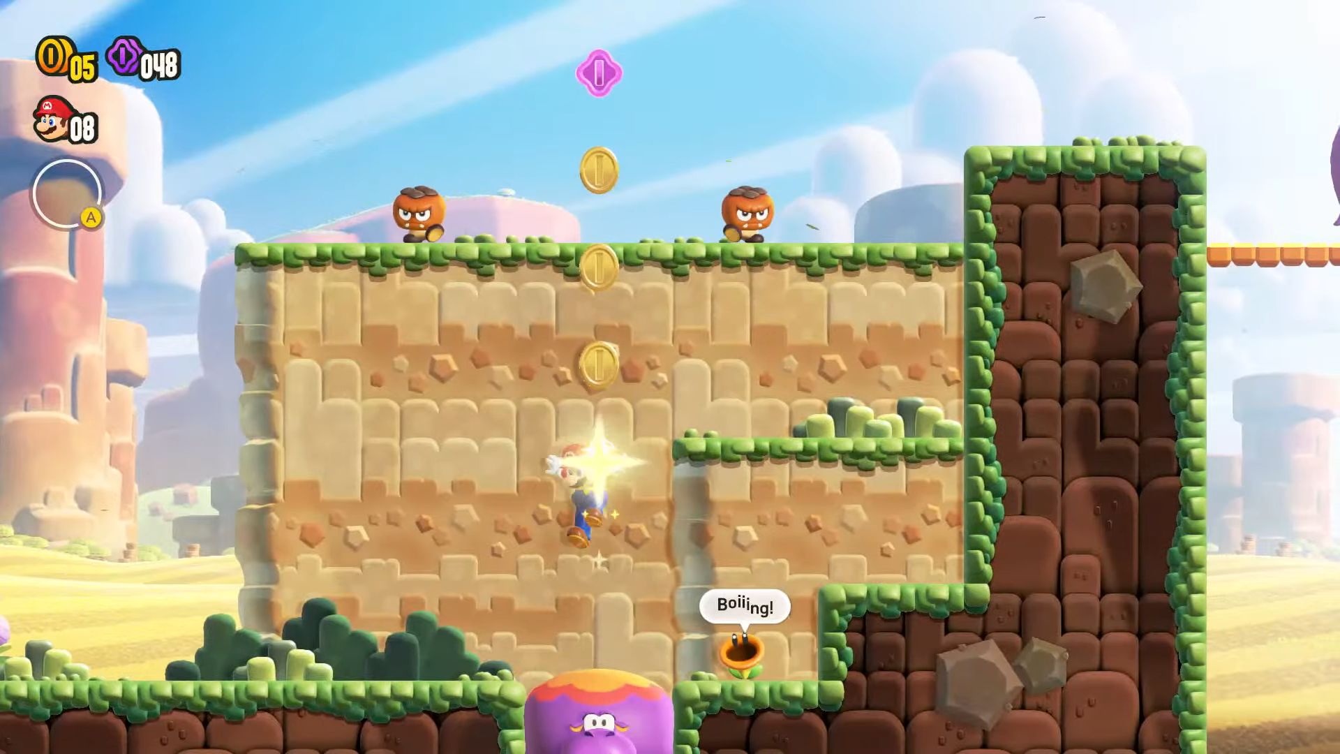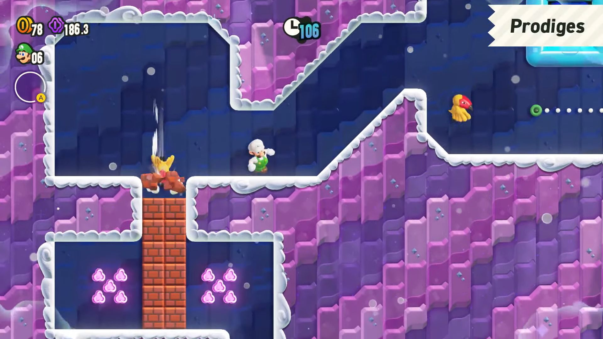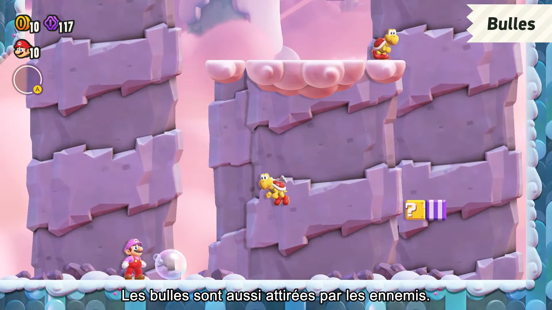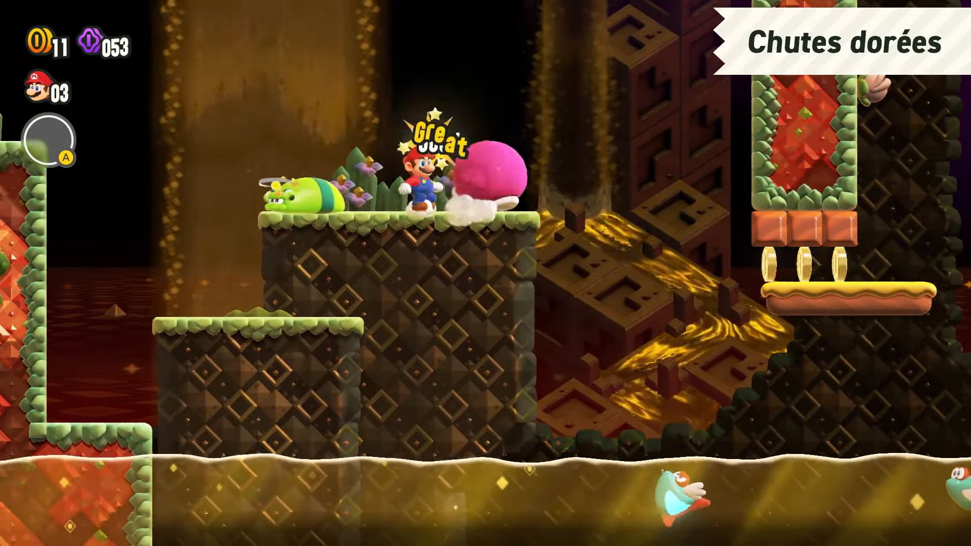 Certains prodiges peuvent même transformer notre personnage. Mario peut alors devenir un Goomba, une boule à pics, ou encore gonfler comme un ballon. Pour que le stage revienne à la normale, il suffira de mettre la main sur une graine prodige. Les graines prodiges sont aussi nécessaires pour déverrouiller certains stages. Un Poplin nous offrira également une graine prodige lorsque l’on atteindra l’arrivée d’un stage.