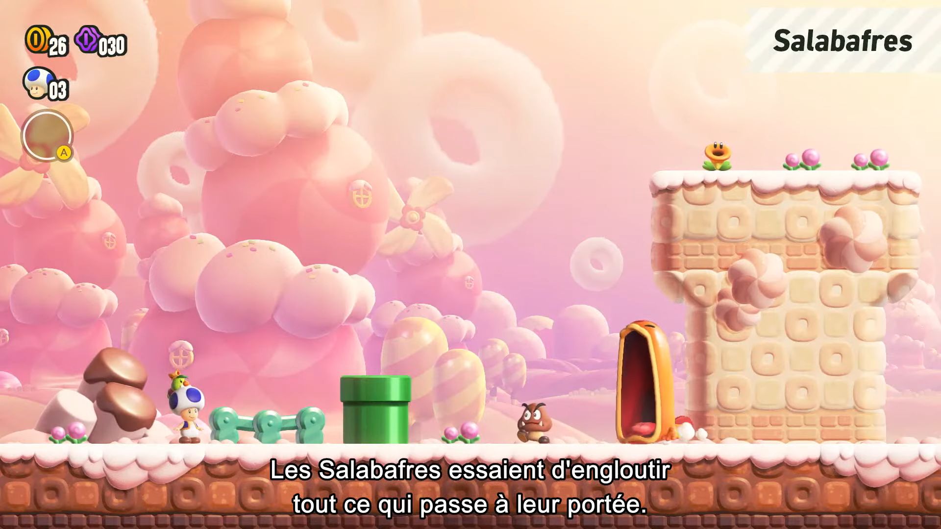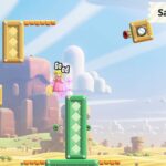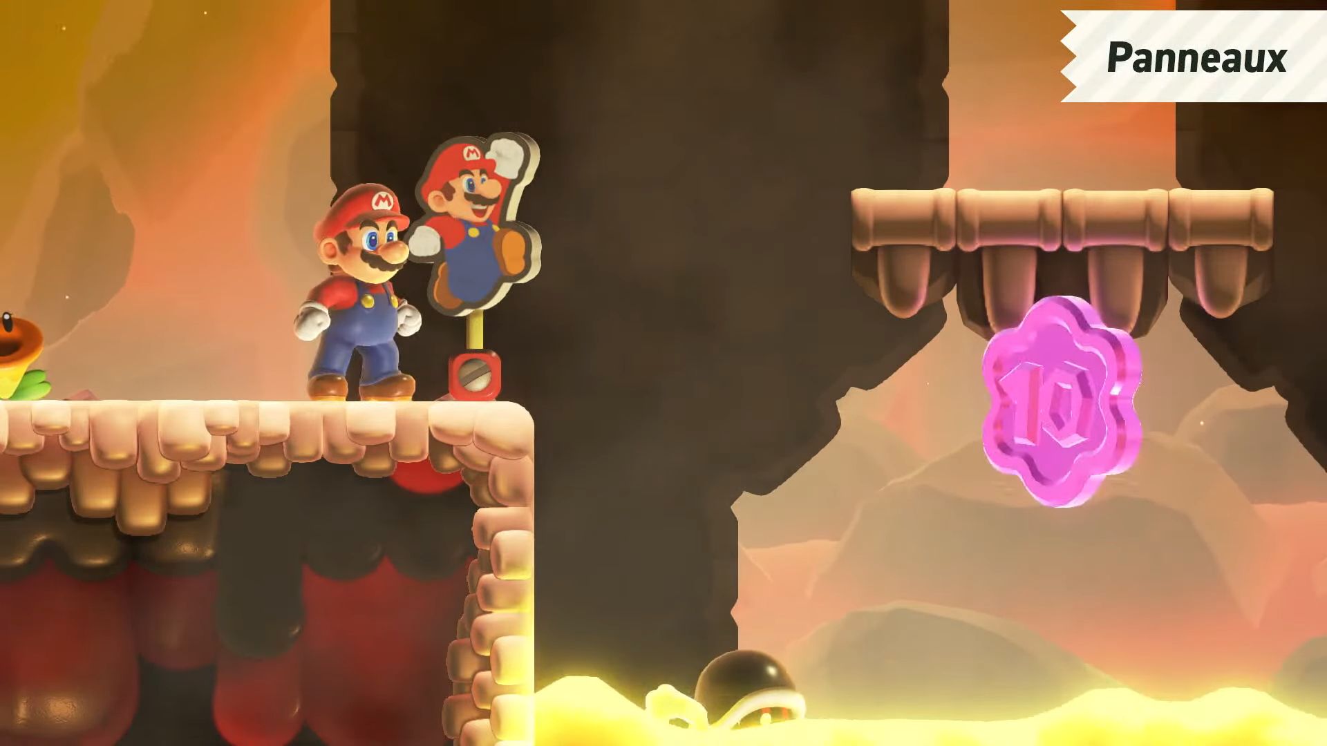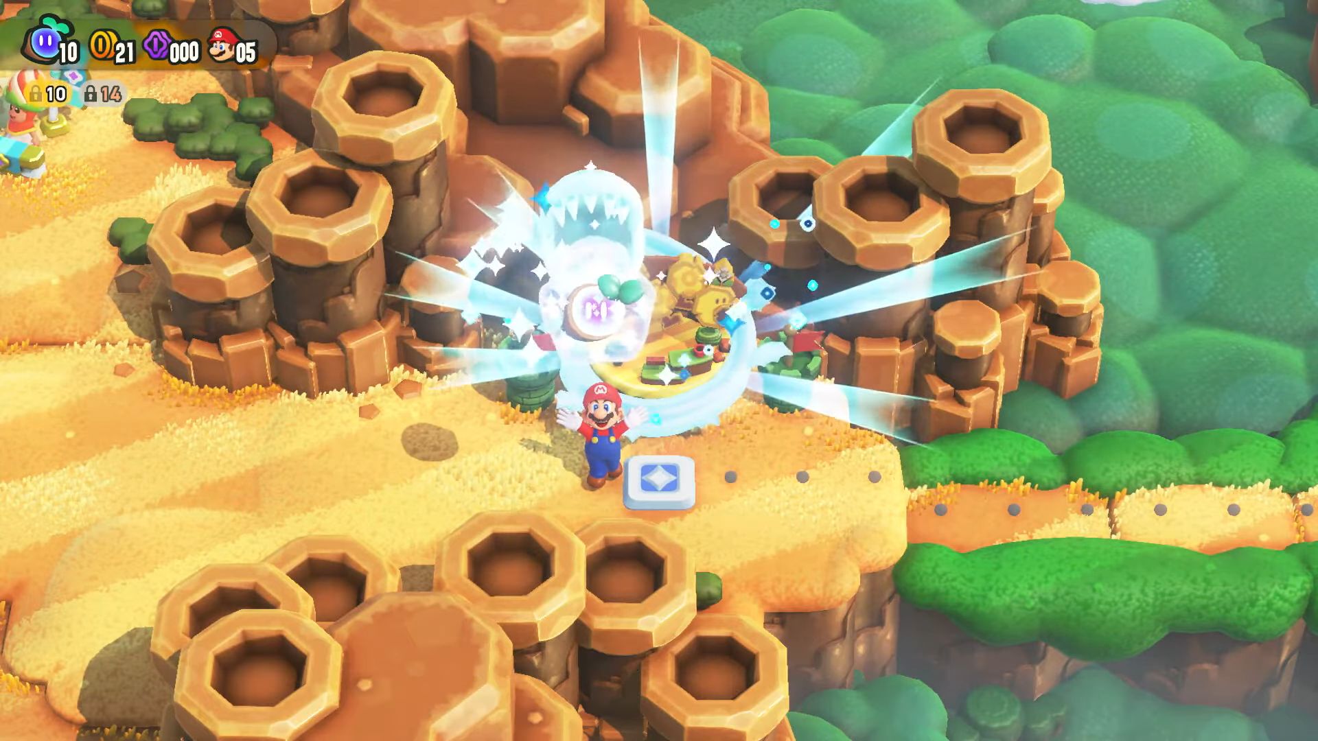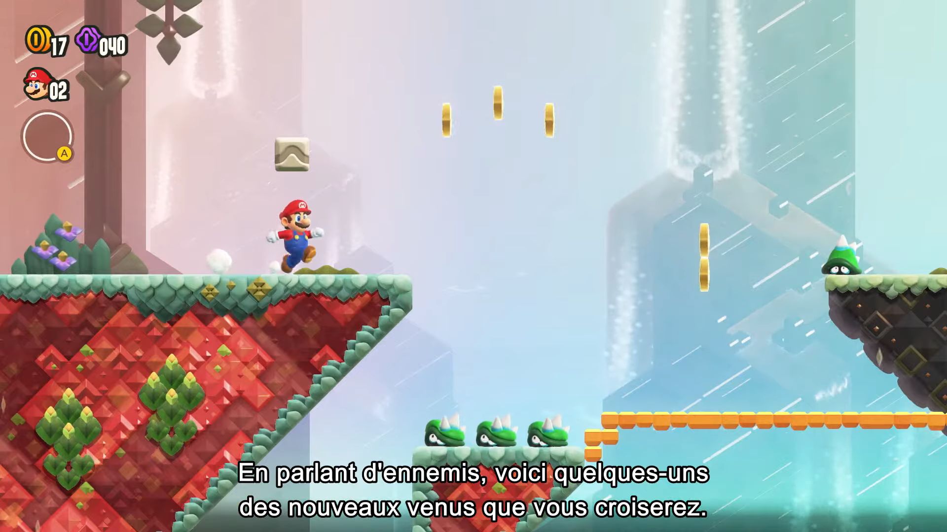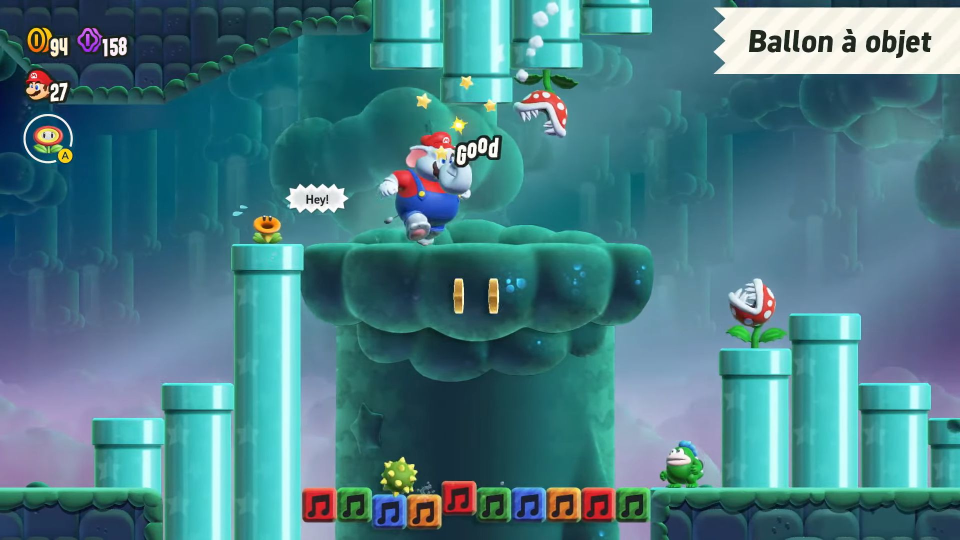 Certains prodiges peuvent même transformer notre personnage. Mario peut alors devenir un Goomba, une boule à pics, ou encore gonfler comme un ballon. Pour que le stage revienne à la normale, il suffira de mettre la main sur une graine prodige. Les graines prodiges sont aussi nécessaires pour déverrouiller certains stages. Un Poplin nous offrira également une graine prodige lorsque l’on atteindra l’arrivée d’un stage.