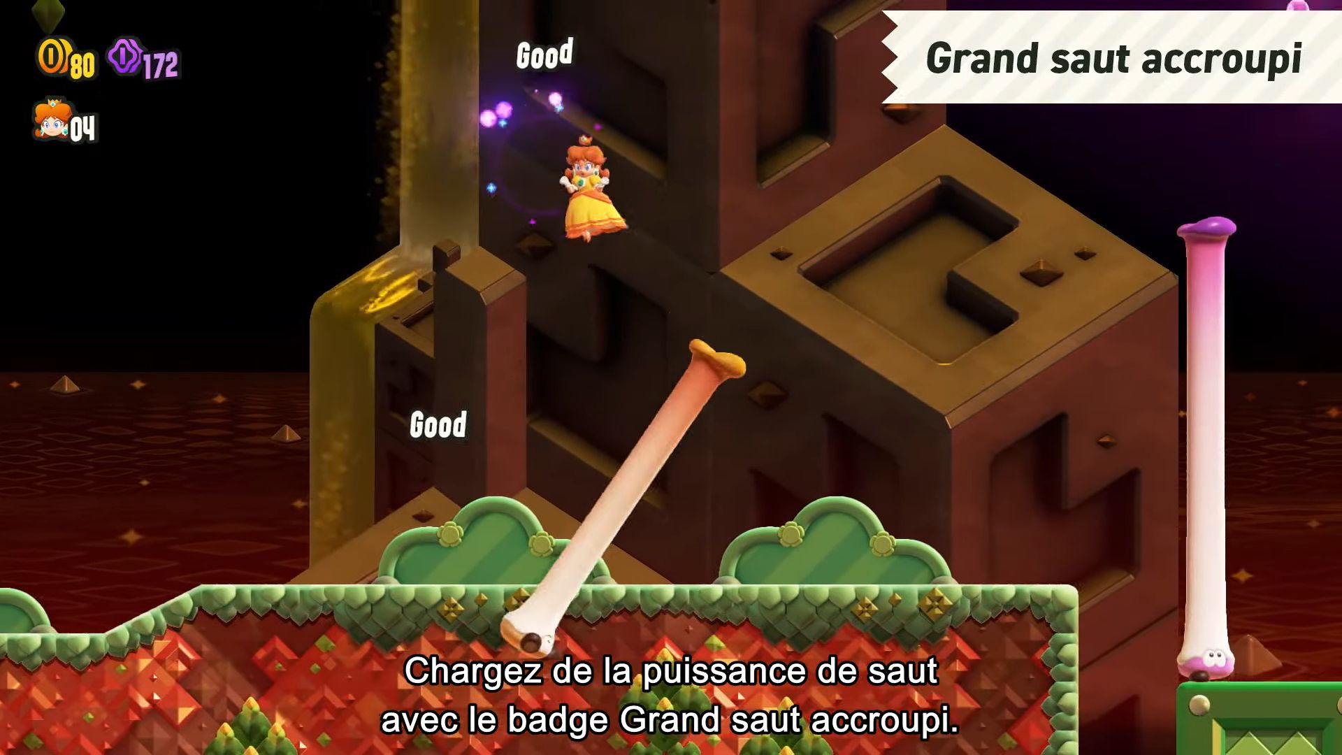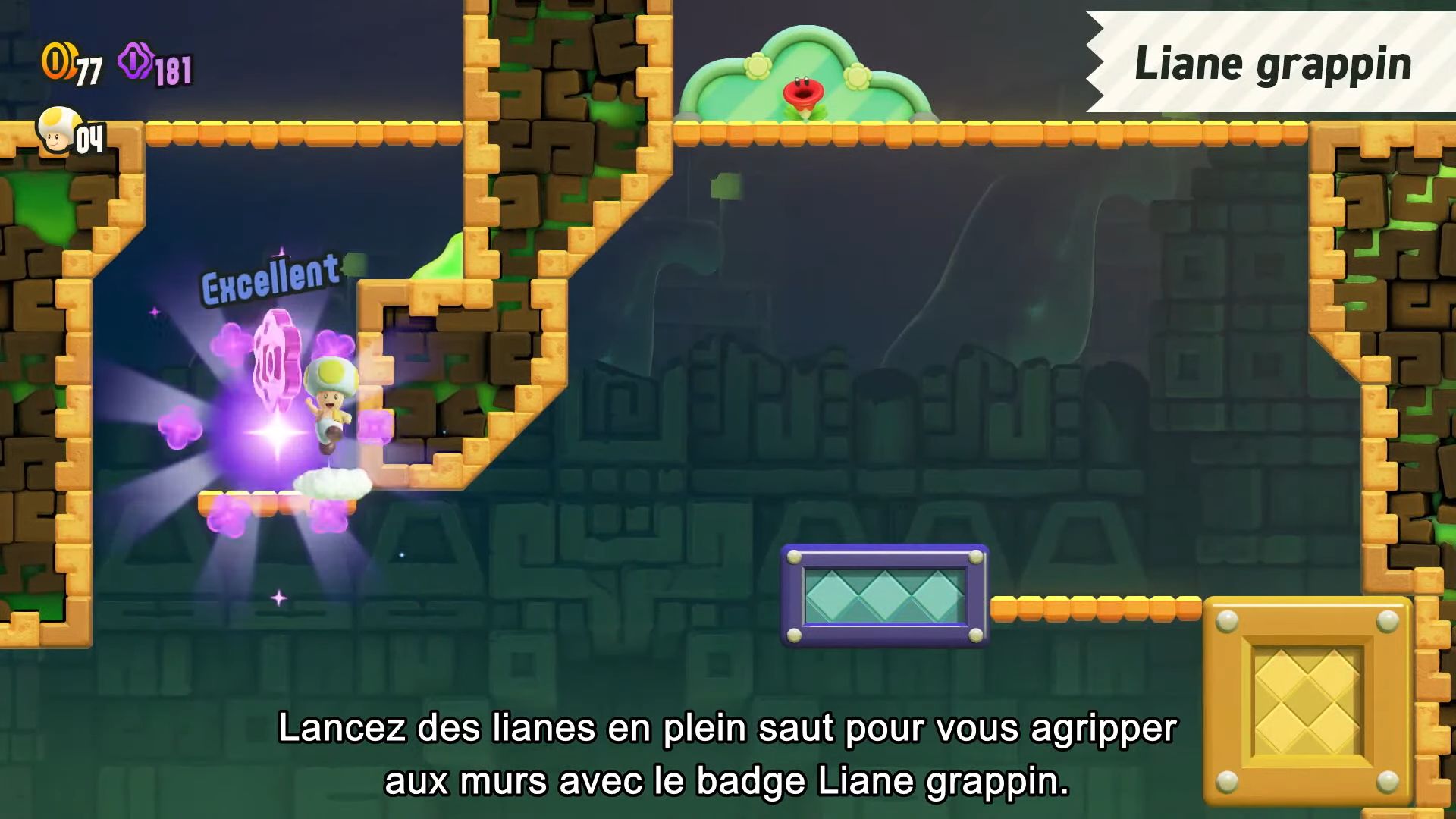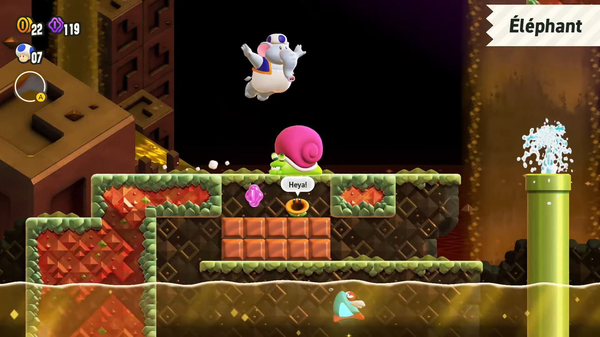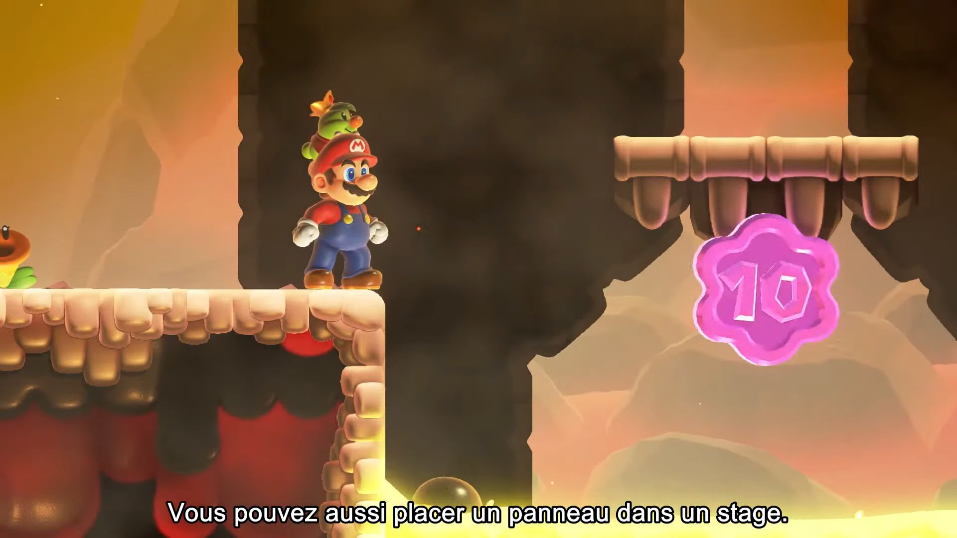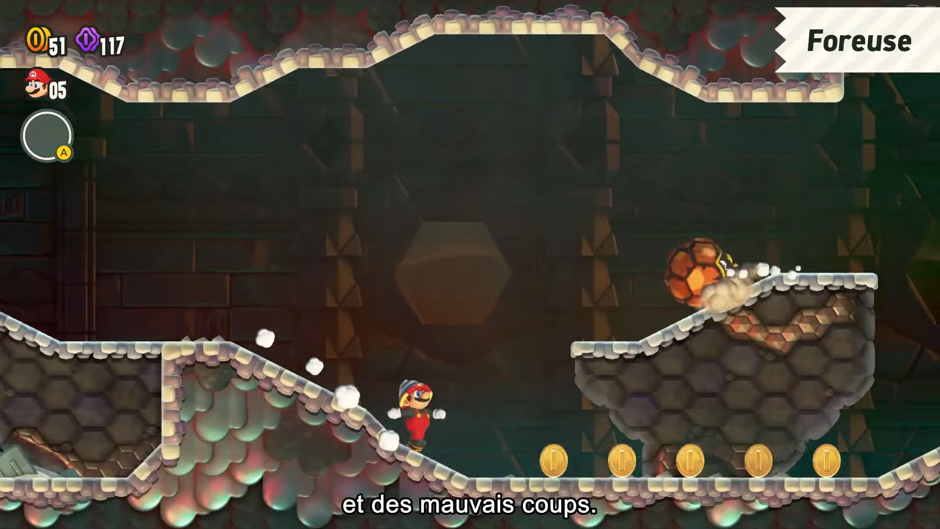 Certains prodiges peuvent même transformer notre personnage. Mario peut alors devenir un Goomba, une boule à pics, ou encore gonfler comme un ballon. Pour que le stage revienne à la normale, il suffira de mettre la main sur une graine prodige. Les graines prodiges sont aussi nécessaires pour déverrouiller certains stages. Un Poplin nous offrira également une graine prodige lorsque l’on atteindra l’arrivée d’un stage.