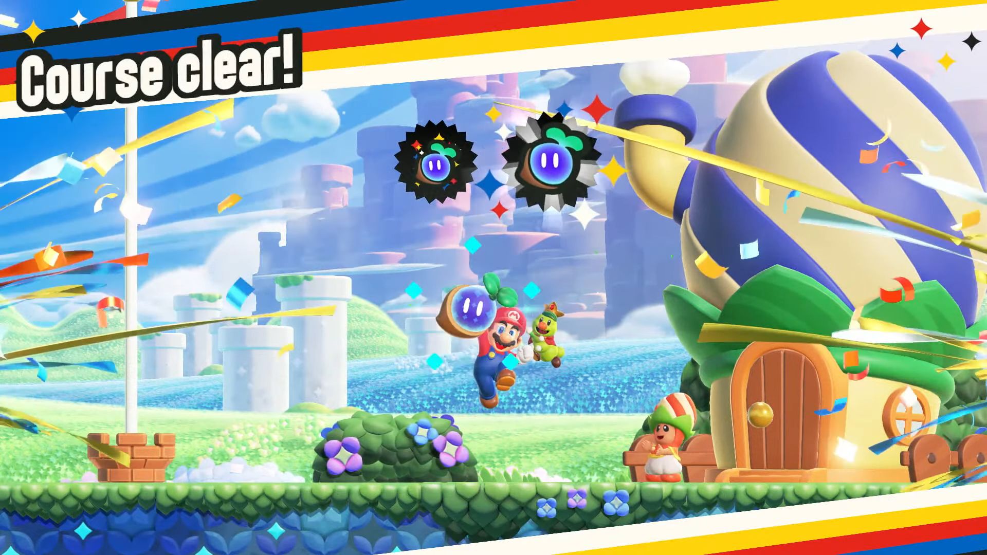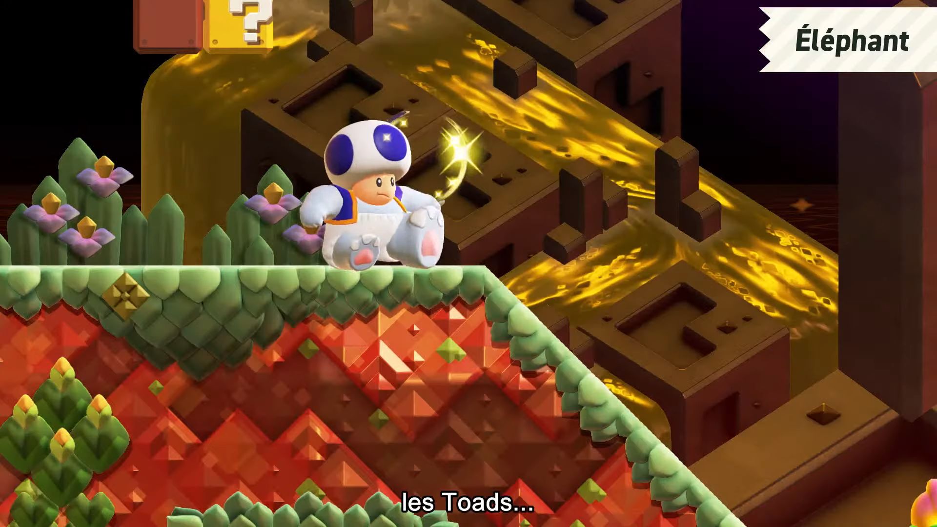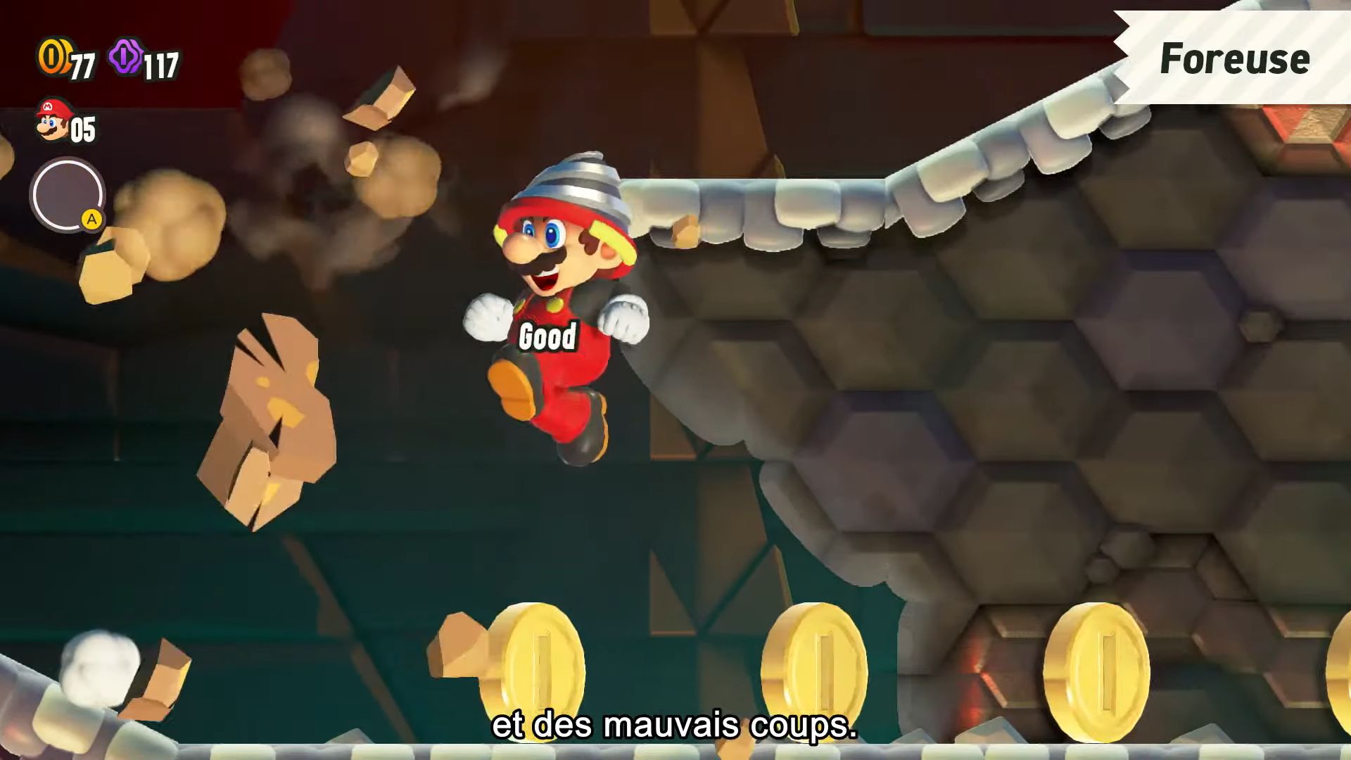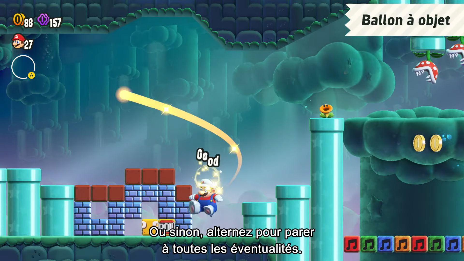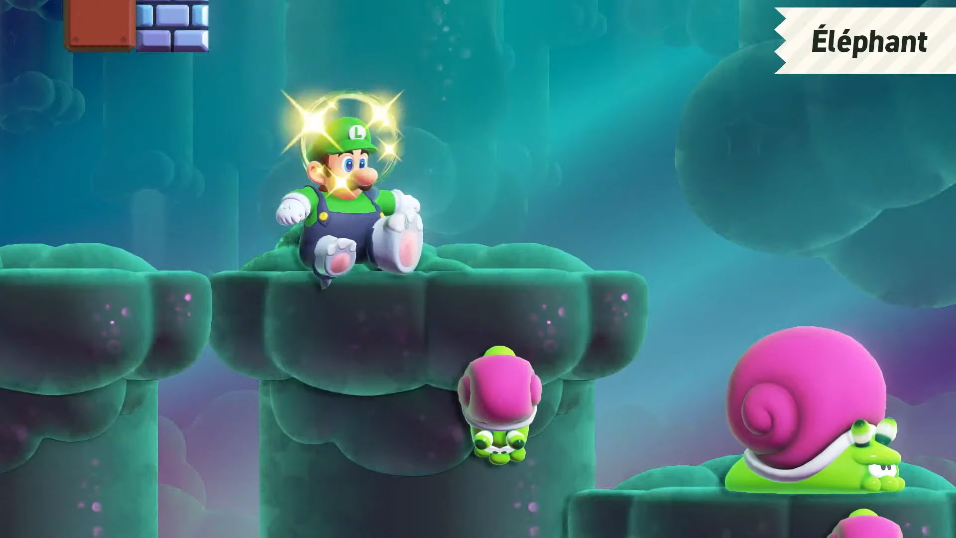 Certains prodiges peuvent même transformer notre personnage. Mario peut alors devenir un Goomba, une boule à pics, ou encore gonfler comme un ballon. Pour que le stage revienne à la normale, il suffira de mettre la main sur une graine prodige. Les graines prodiges sont aussi nécessaires pour déverrouiller certains stages. Un Poplin nous offrira également une graine prodige lorsque l’on atteindra l’arrivée d’un stage.