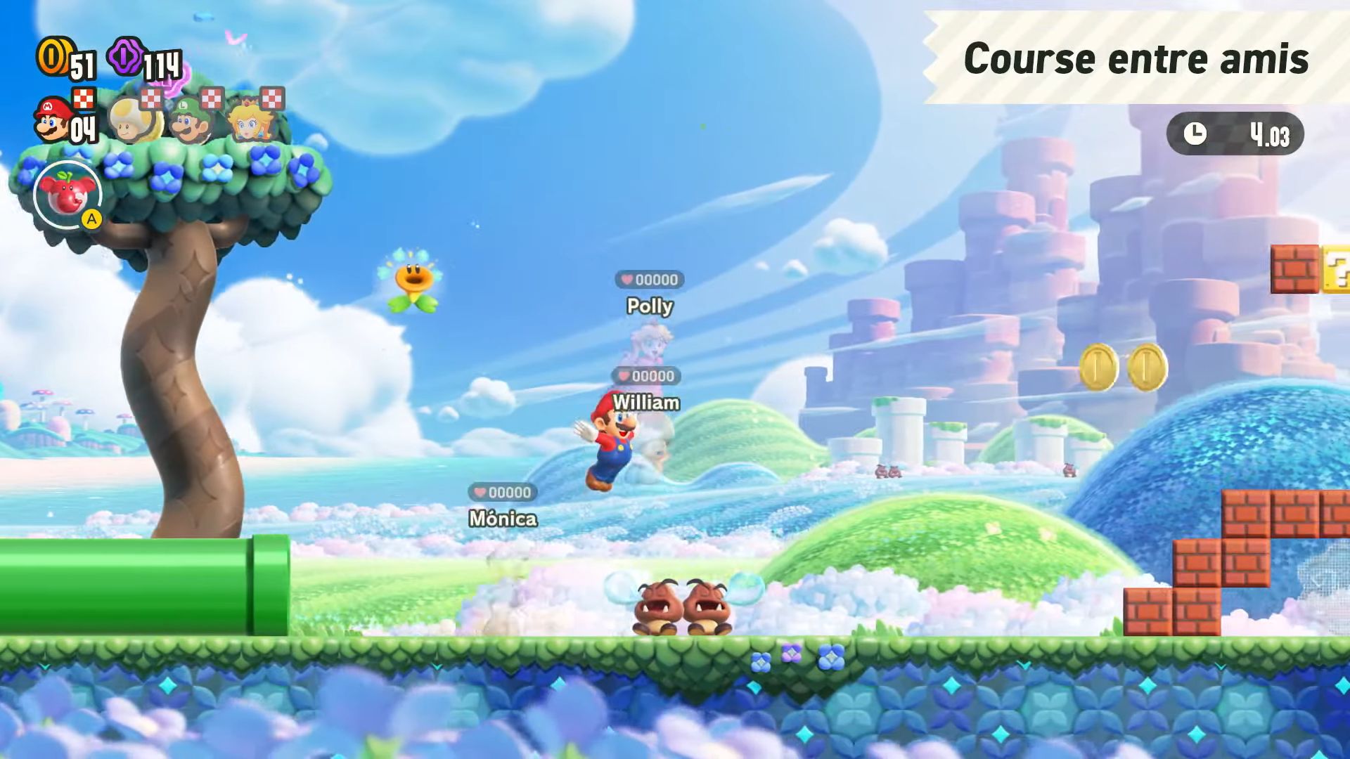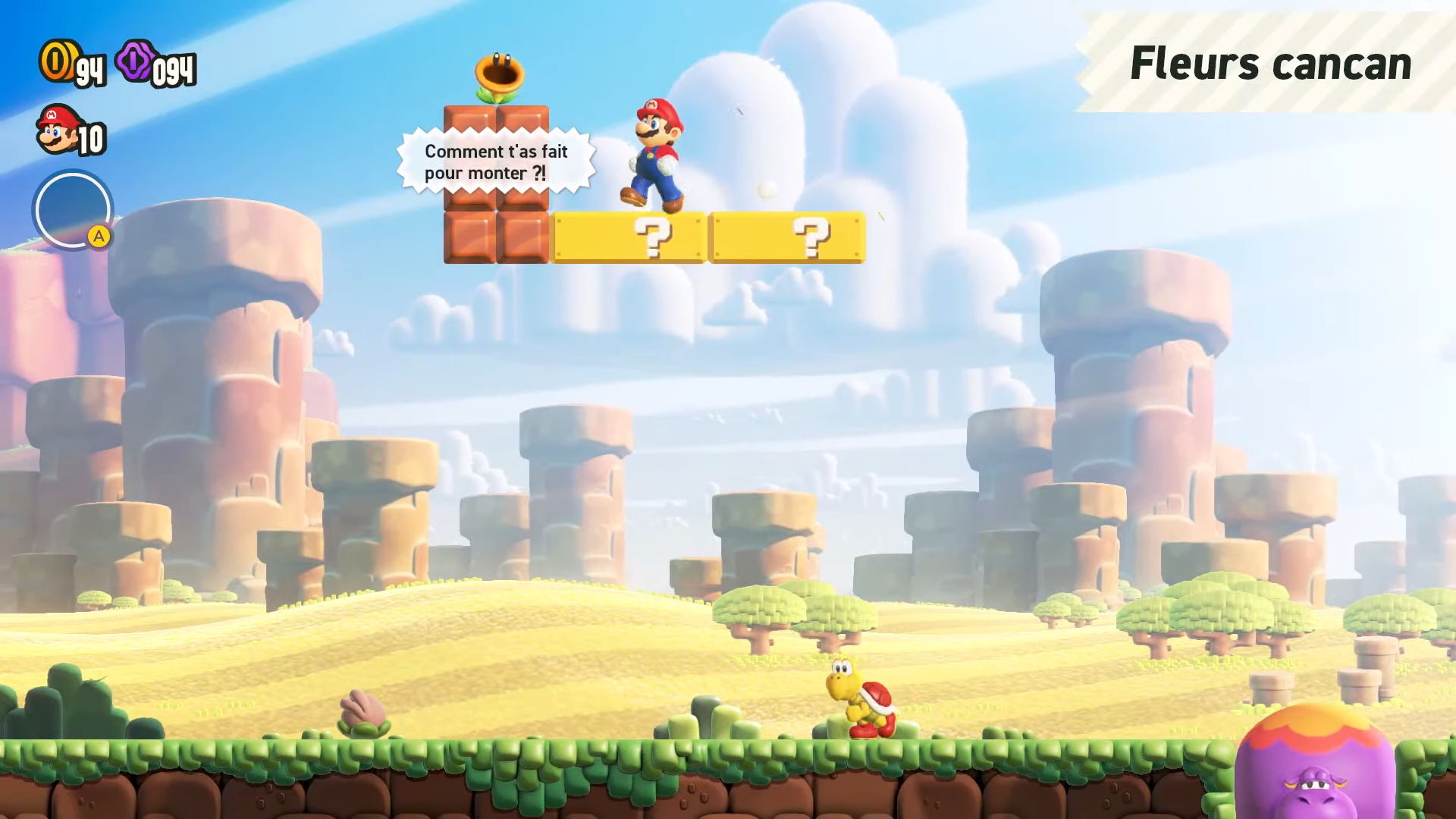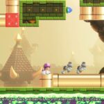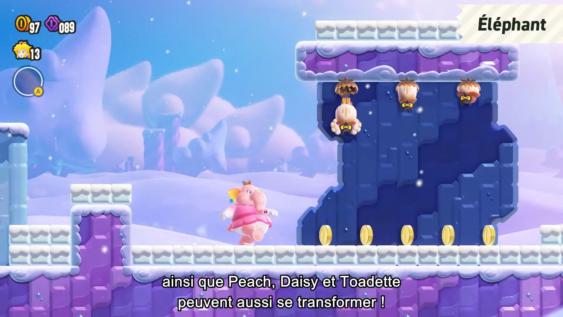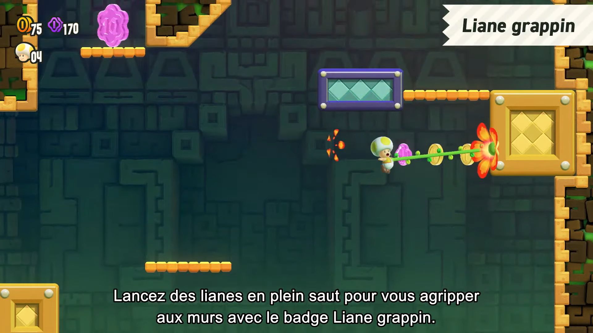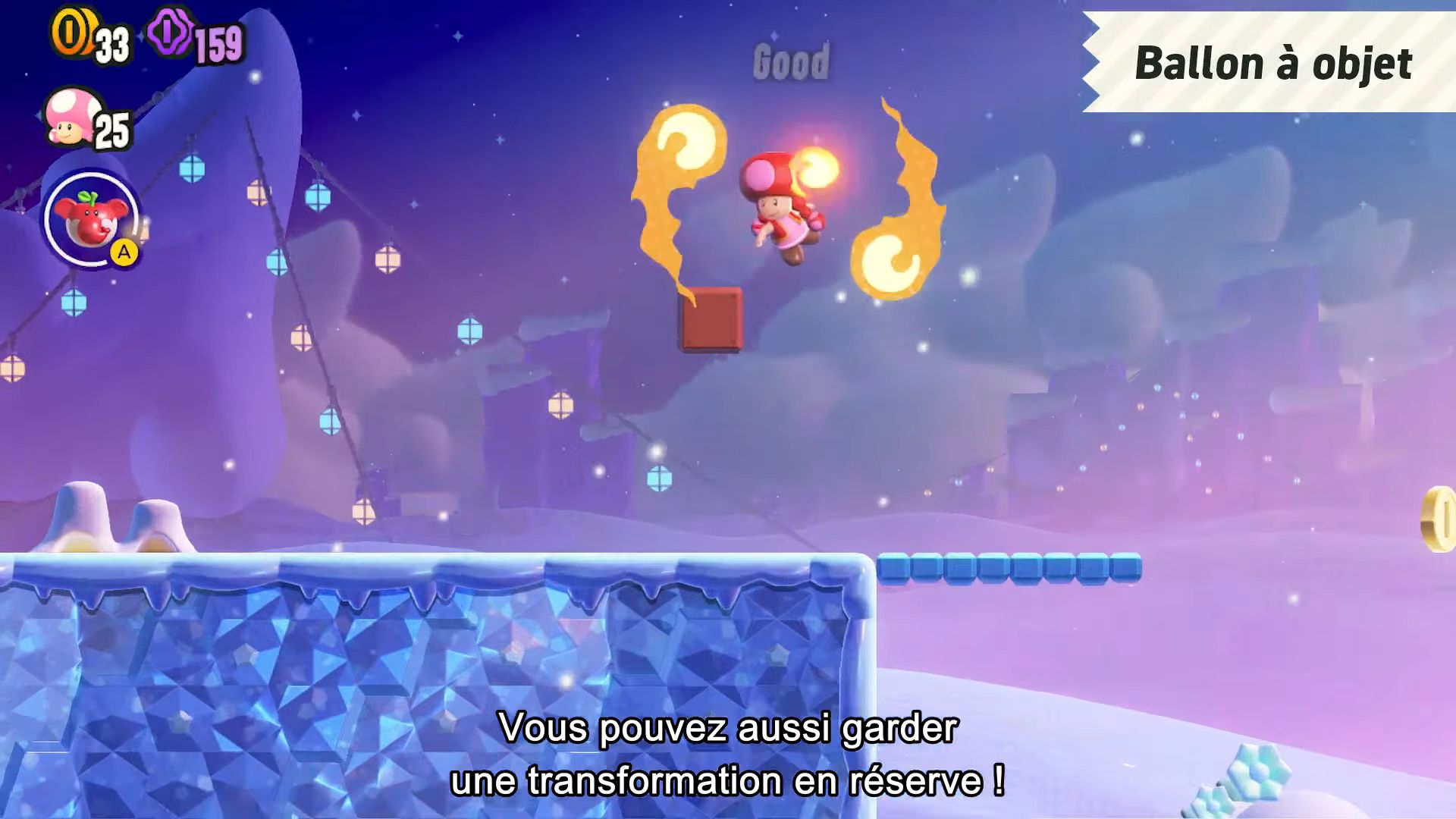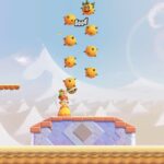 Certains prodiges peuvent même transformer notre personnage. Mario peut alors devenir un Goomba, une boule à pics, ou encore gonfler comme un ballon. Pour que le stage revienne à la normale, il suffira de mettre la main sur une graine prodige. Les graines prodiges sont aussi nécessaires pour déverrouiller certains stages. Un Poplin nous offrira également une graine prodige lorsque l’on atteindra l’arrivée d’un stage.