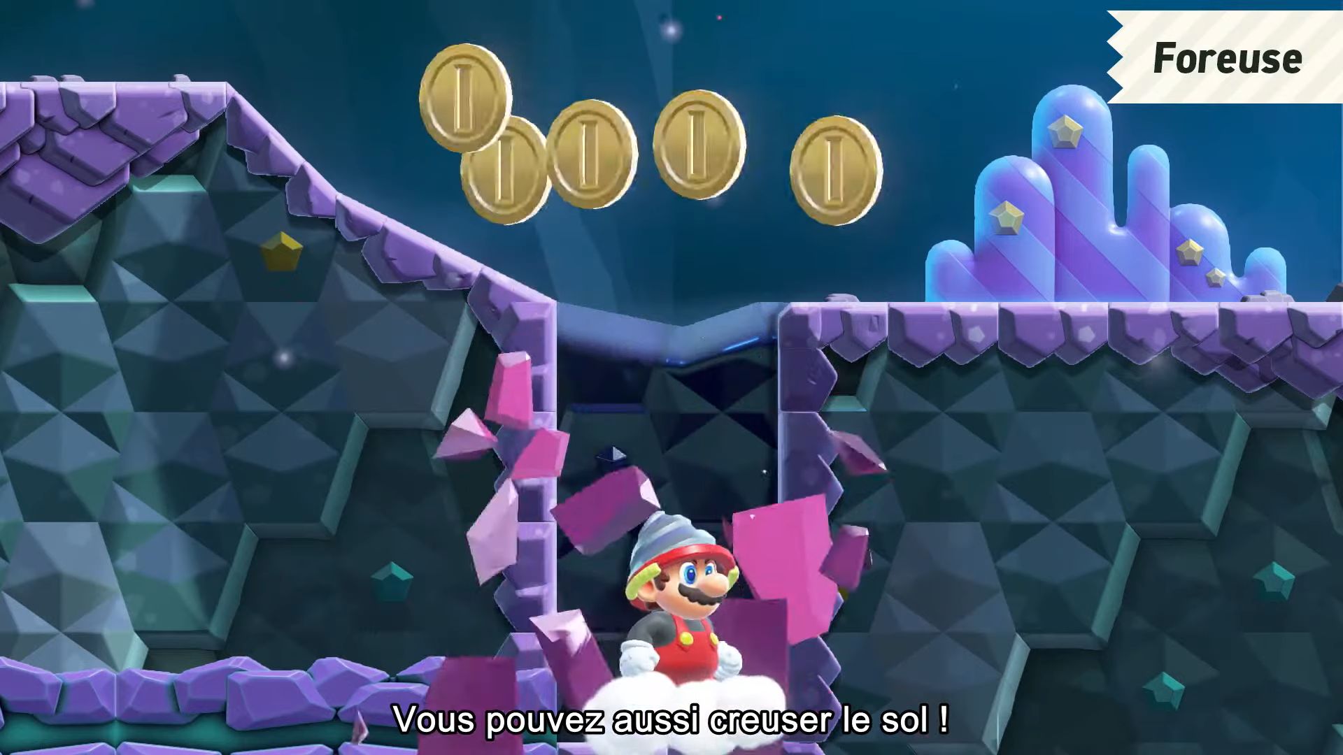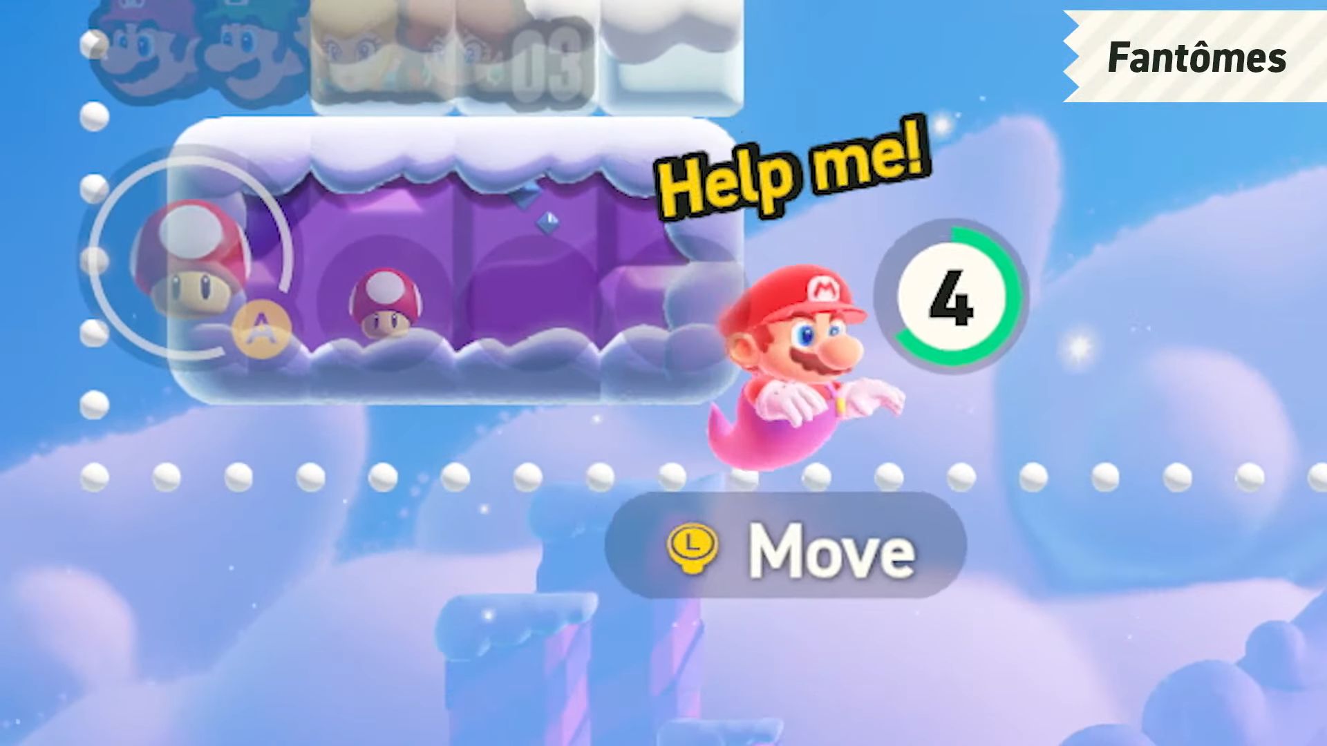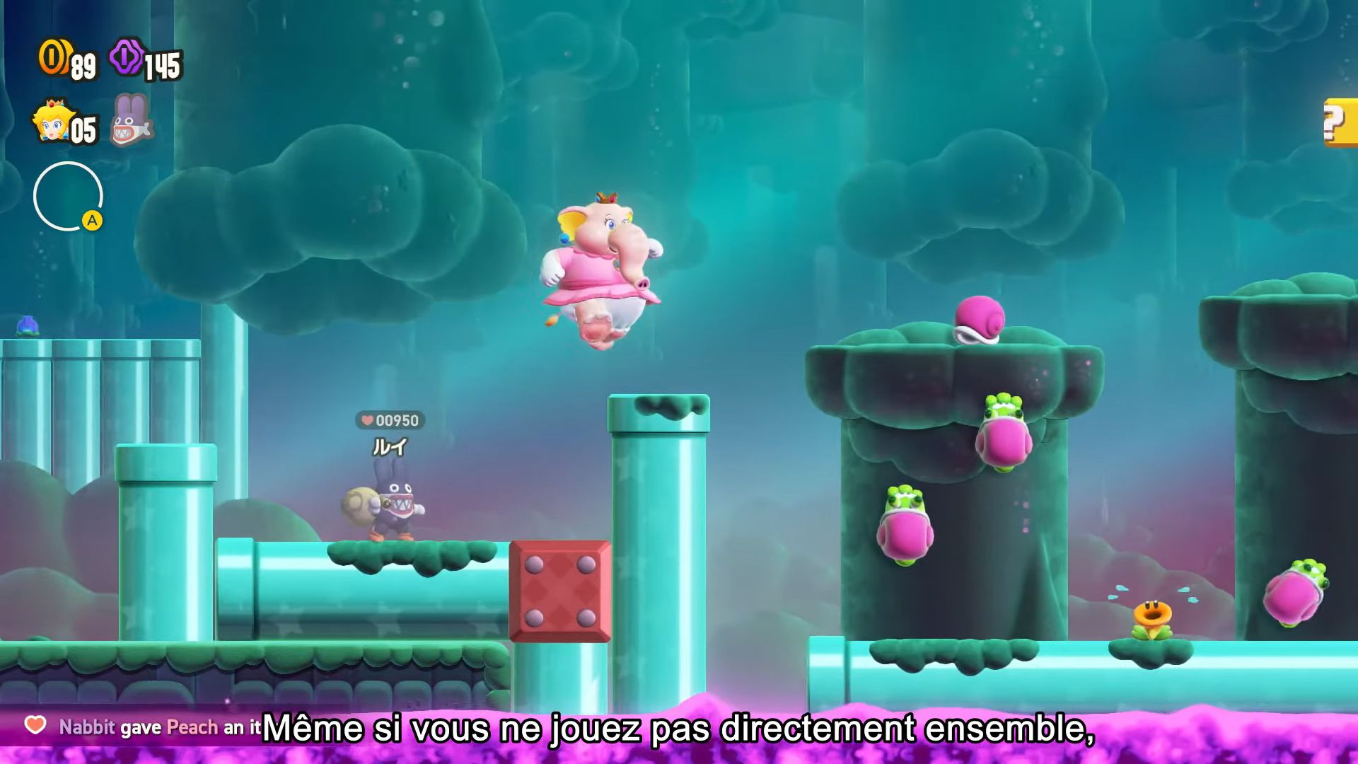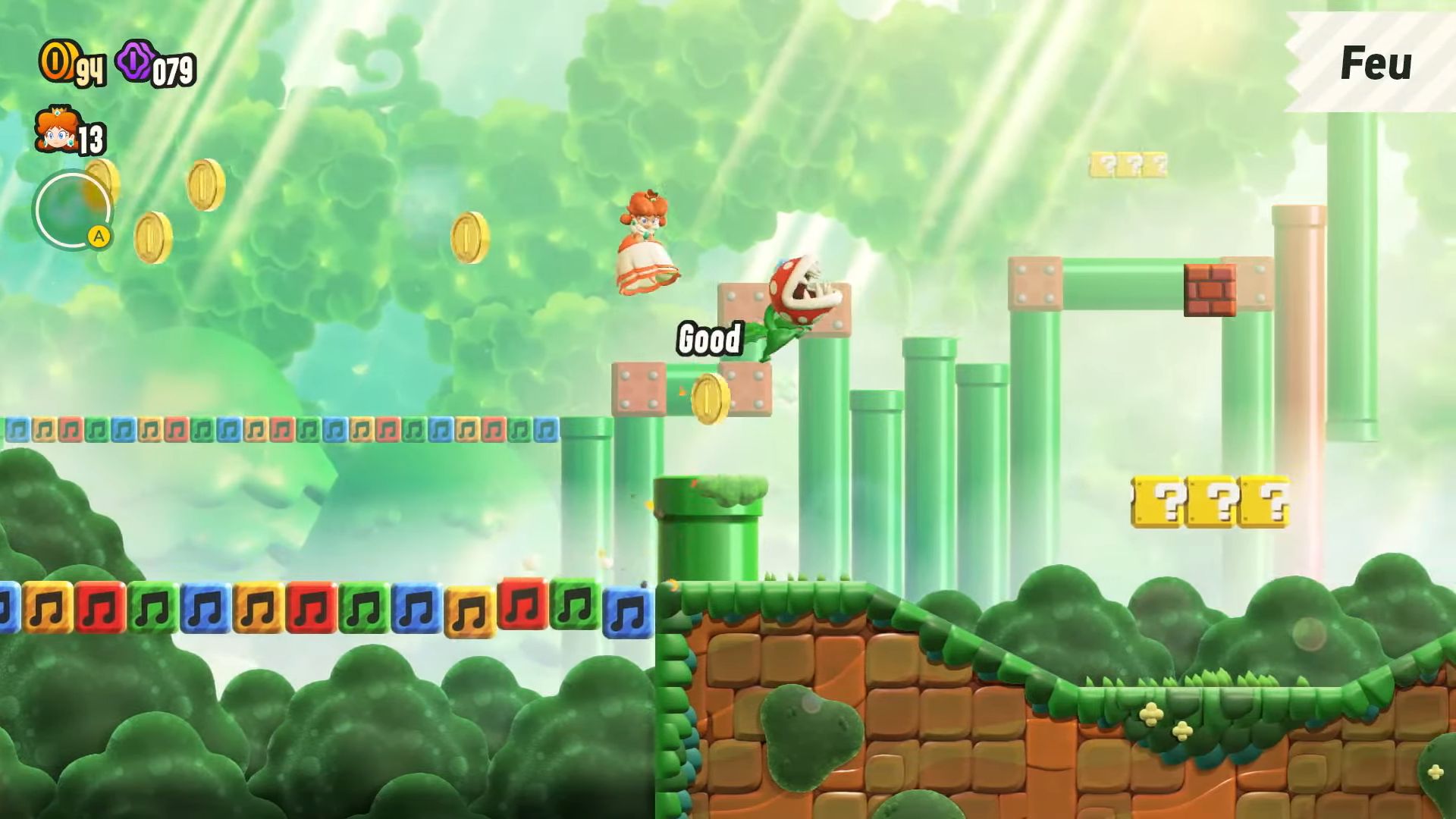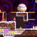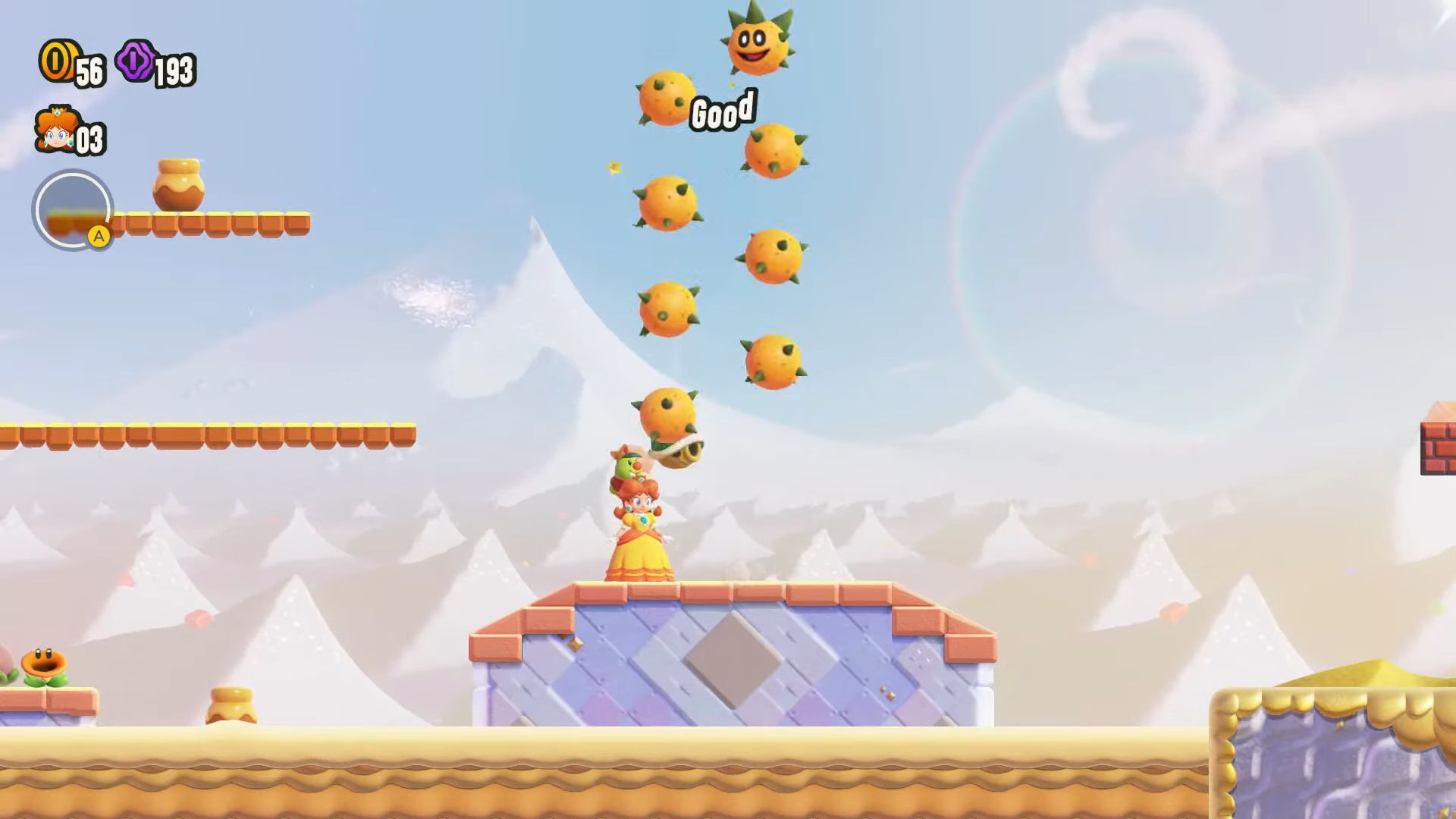 Certains prodiges peuvent même transformer notre personnage. Mario peut alors devenir un Goomba, une boule à pics, ou encore gonfler comme un ballon. Pour que le stage revienne à la normale, il suffira de mettre la main sur une graine prodige. Les graines prodiges sont aussi nécessaires pour déverrouiller certains stages. Un Poplin nous offrira également une graine prodige lorsque l’on atteindra l’arrivée d’un stage.