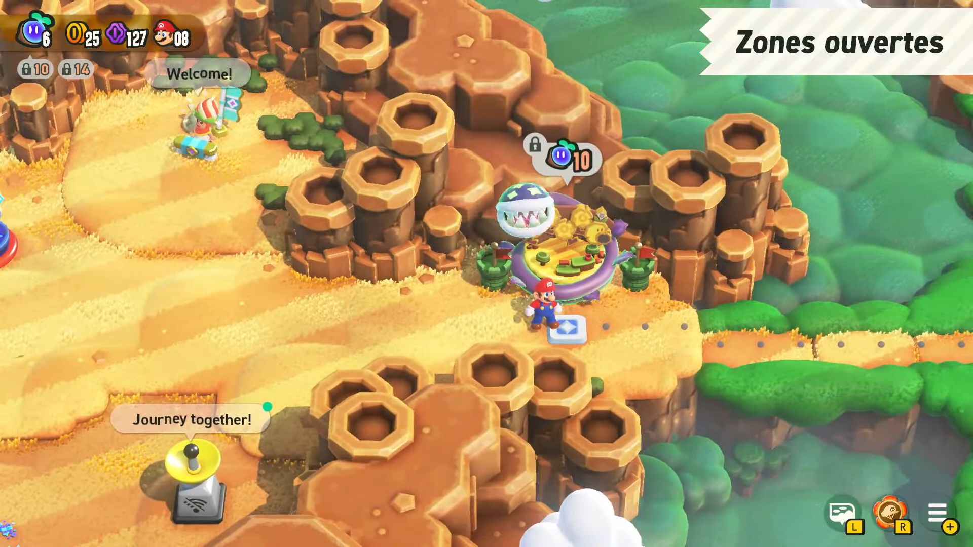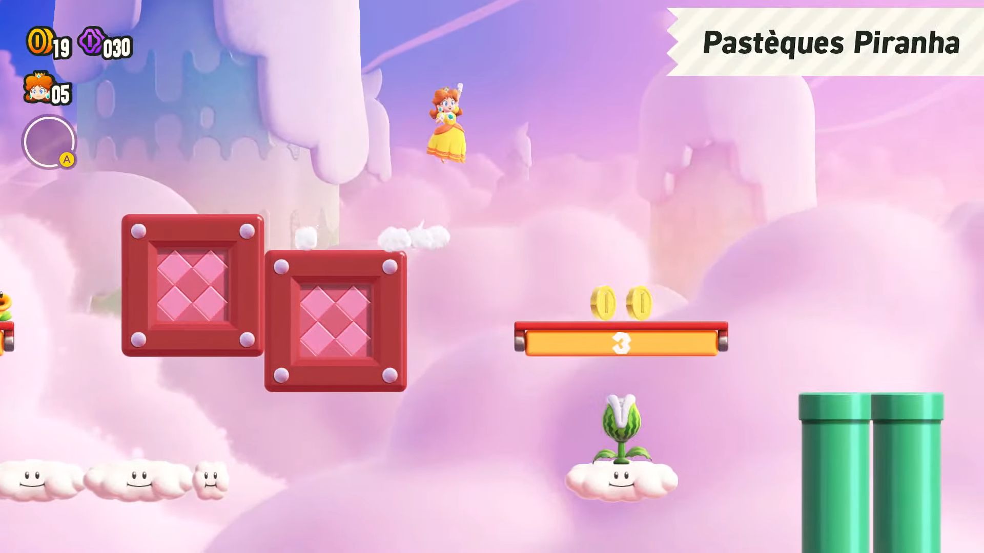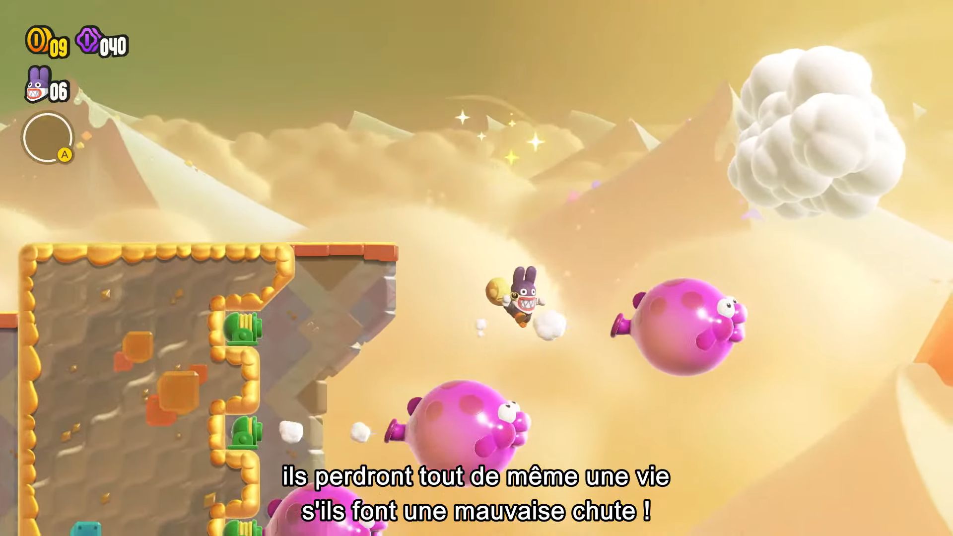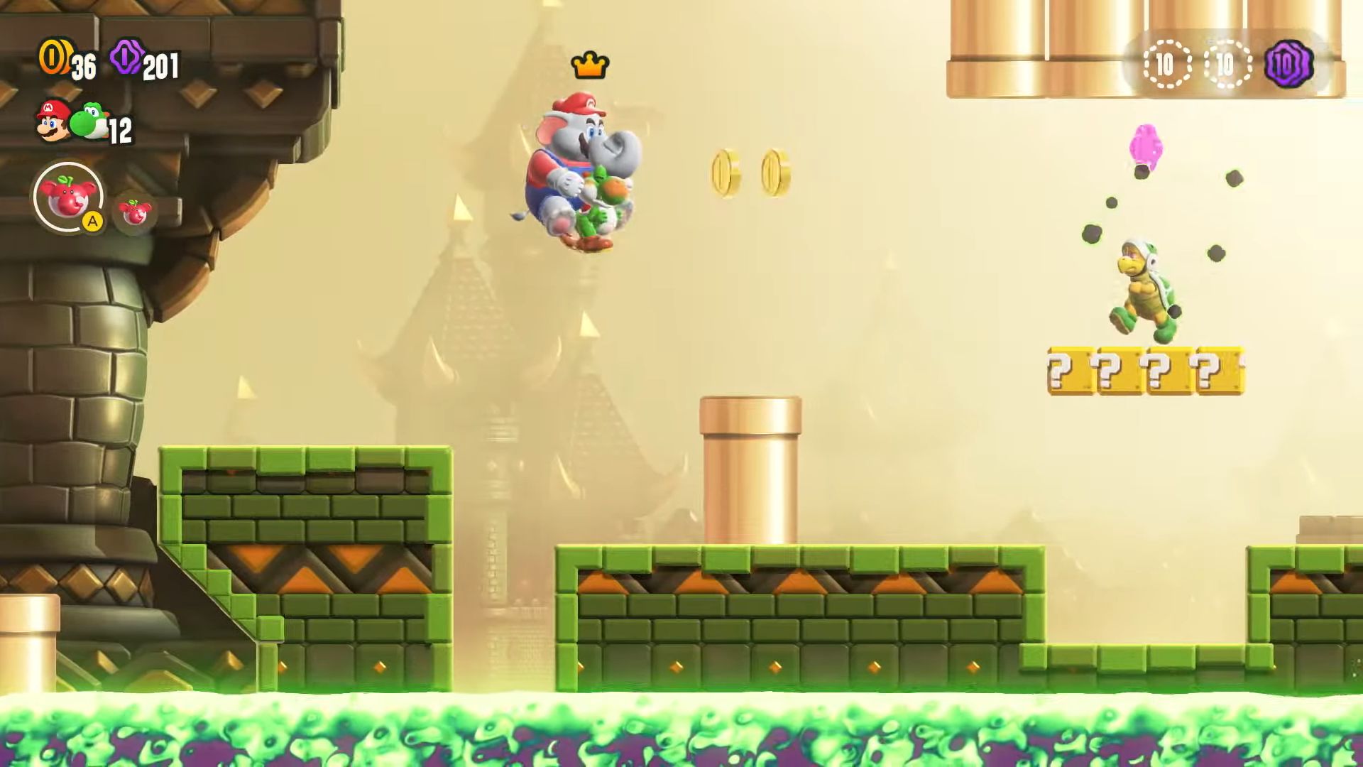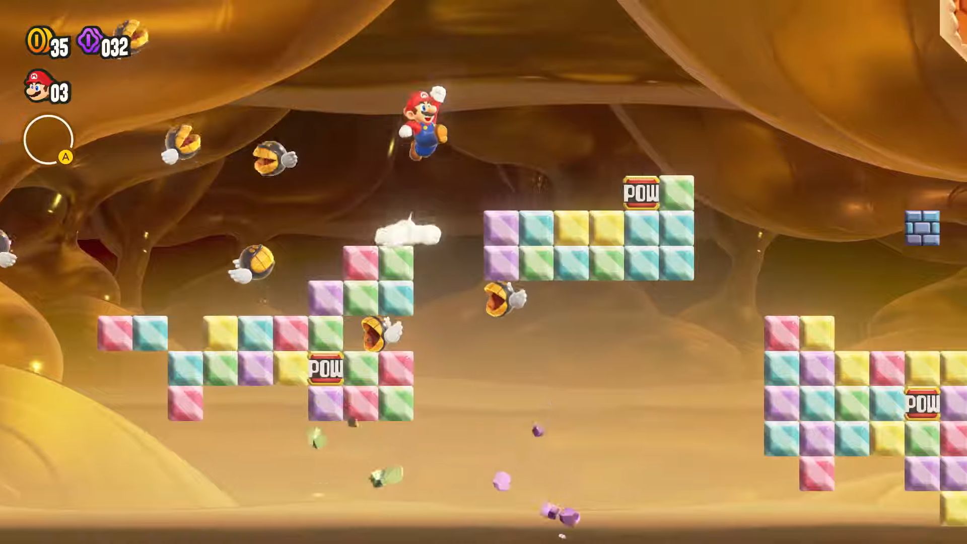 Certains prodiges peuvent même transformer notre personnage. Mario peut alors devenir un Goomba, une boule à pics, ou encore gonfler comme un ballon. Pour que le stage revienne à la normale, il suffira de mettre la main sur une graine prodige. Les graines prodiges sont aussi nécessaires pour déverrouiller certains stages. Un Poplin nous offrira également une graine prodige lorsque l’on atteindra l’arrivée d’un stage.